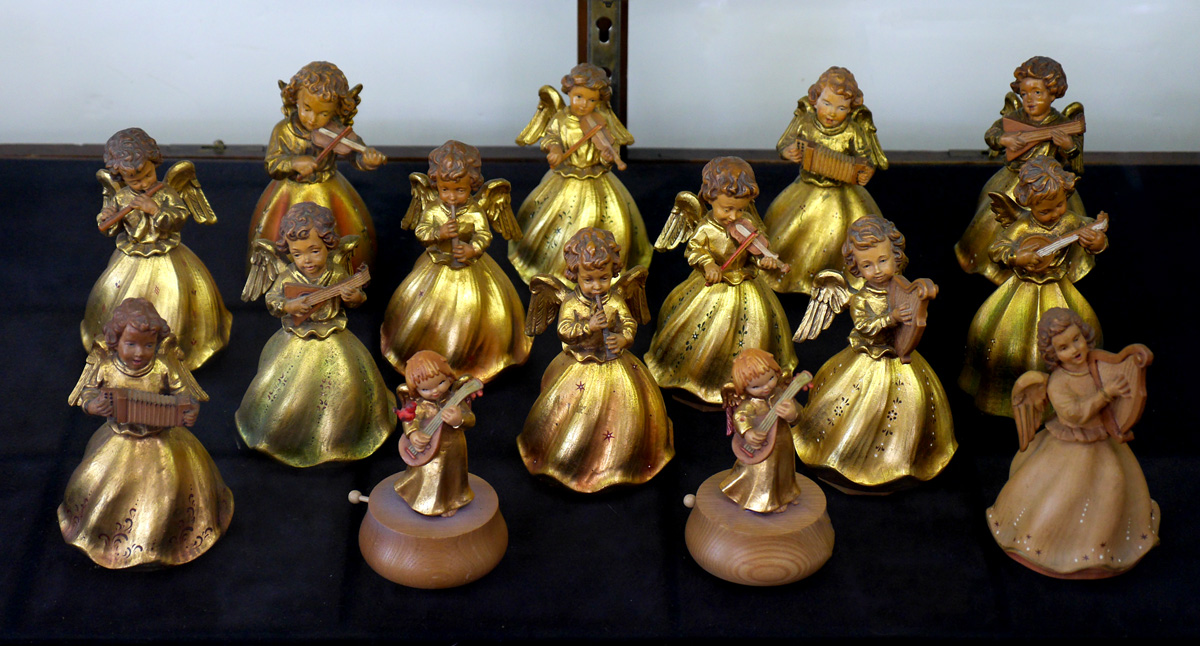 15 ITALIAN CARVED ANRI ANGELS REUGE MUSIC BOXES: An assembled collection of Anri carved polychrome decorated wood angel figures, all with Reuge music boxes, each approx. 5 1/2'' h. x 6 1/2''.