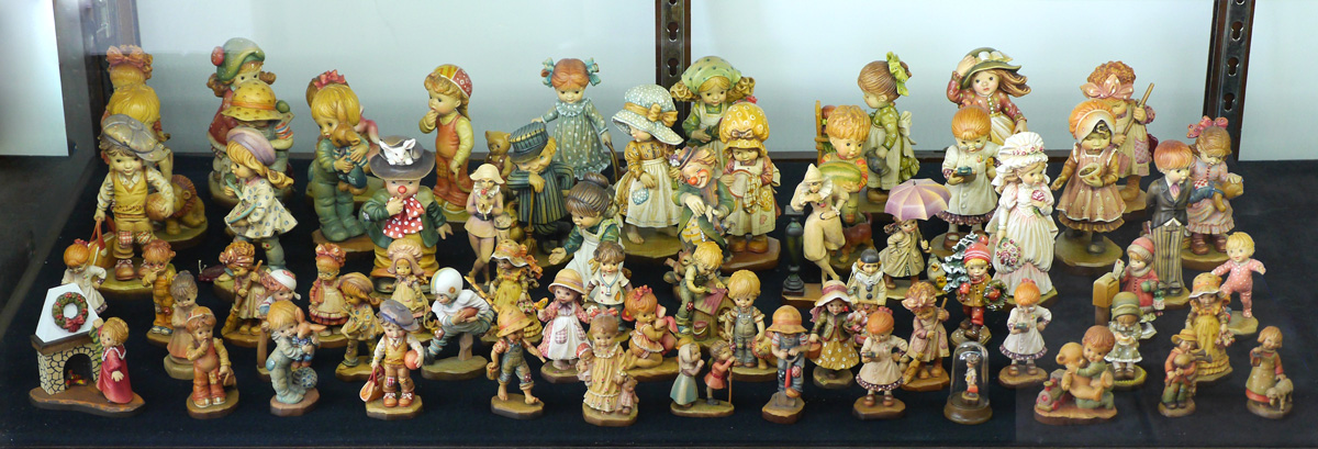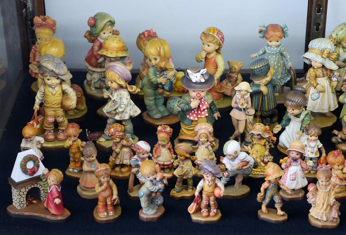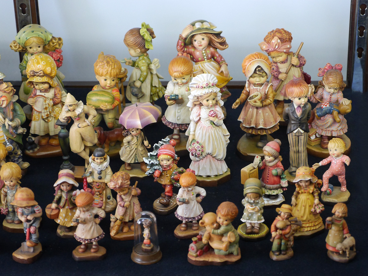 MASSIVE COLLECTION OF 66 ANRI CARVED FIGURINES: An assembled collection of approx. 66 carved polychrome decorated wood figurines by Italian maker Anri. Various designers to include Sarah Kay and Ulrich Bernardi. Sizes measure from 1 3/4'' h. to 7'' h. The majority sold with original boxes, some with replacement boxes.
