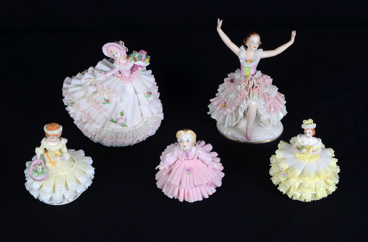5 DRESDEN PORCELAIN LACY FIGURINES: An assembled collection of 5, tallest 6 1/2'' h. x 4 1/2'', smallest 4 1/2'' h.