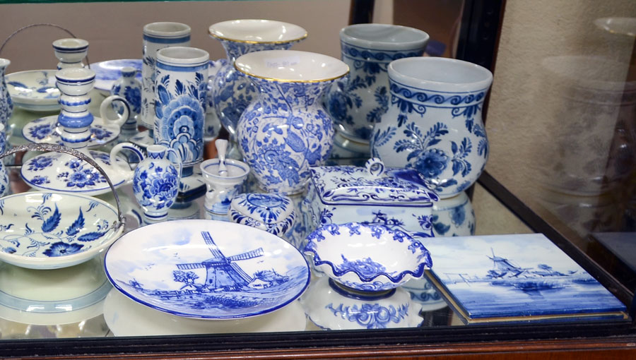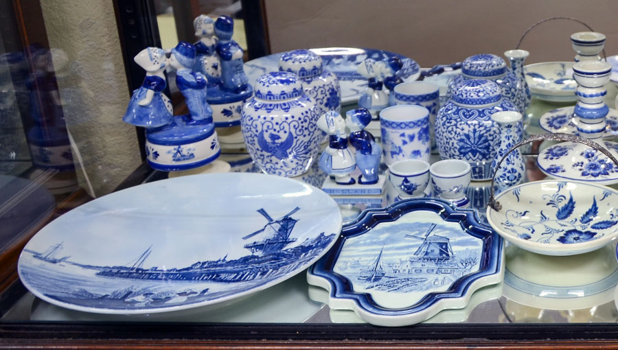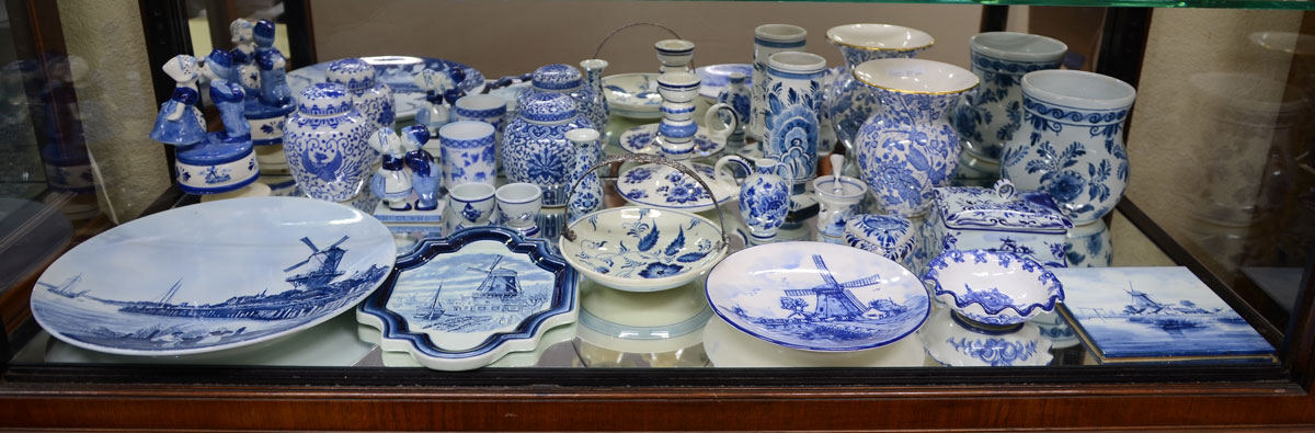 ESTATE COLLECTION OF DELFT BLUE ITEMS: An assembled collection of approx. 21 contemporary and vintage Delft blue to include charger, plates, ginger jars, bowls, cups, vase, covered box, figures and more, largest vase measures 5 3/4'' h. x 5 1/2''. Sold with a German blue transferware vase.