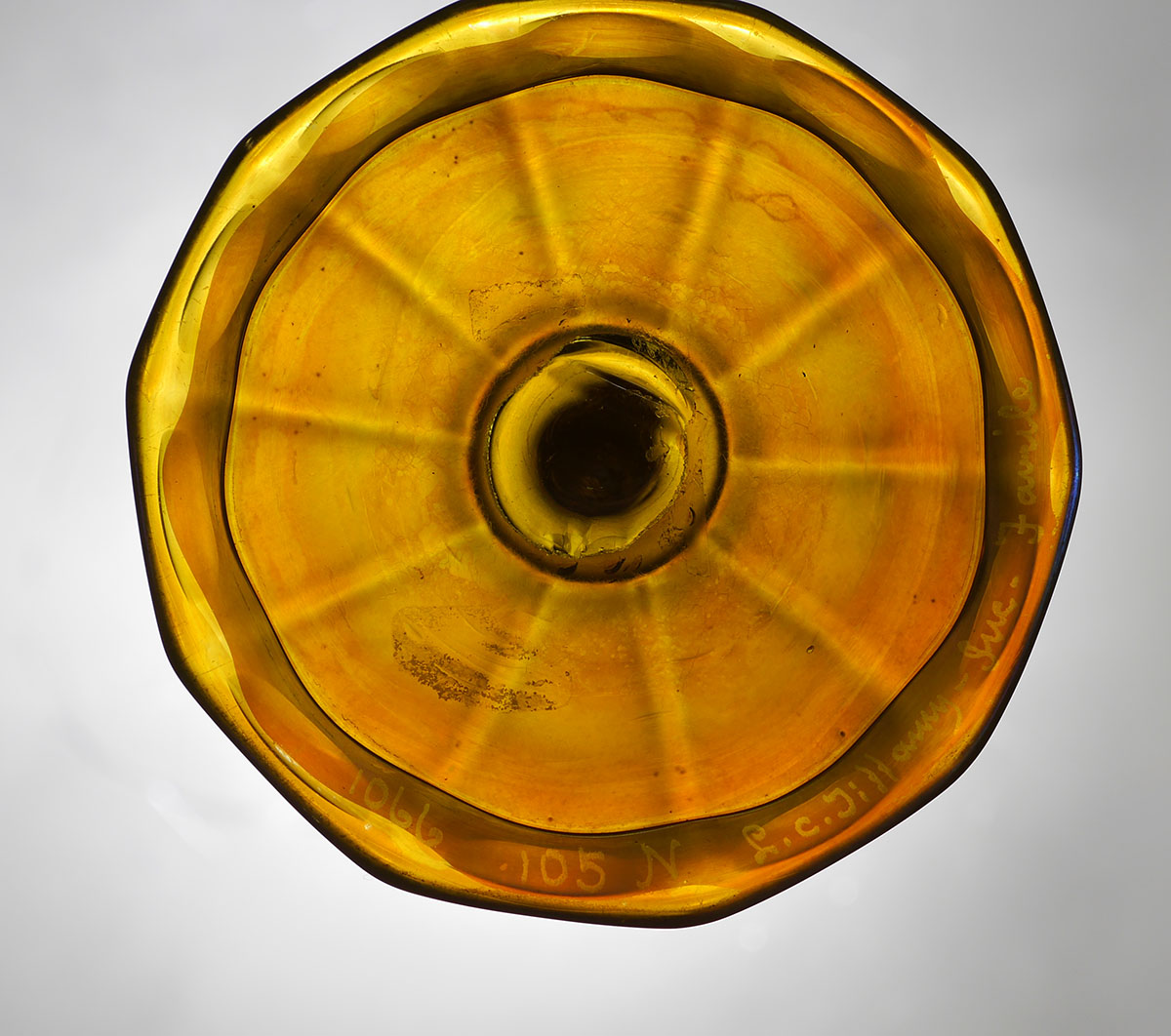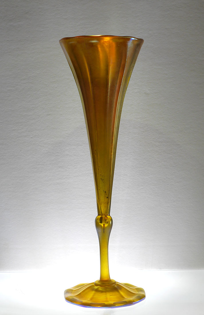 TIFFANY GOLD FAVRILE ART GLASS TRUMPET VASE 1066 105N: Gold iridized glass with ribbed panels tapering to a bulbous knop raised on a flaring paneled foot. Signed L.C. Tiffany-Inc-Favrile 1066 105N, 12'' h.