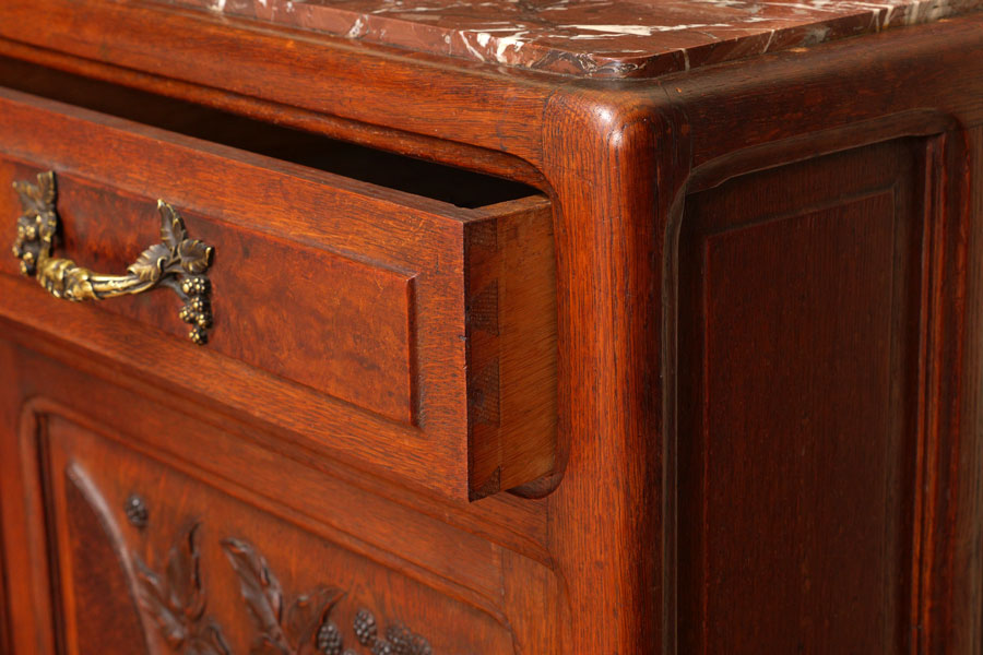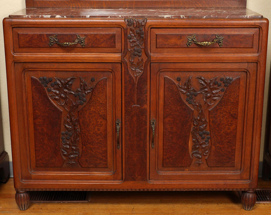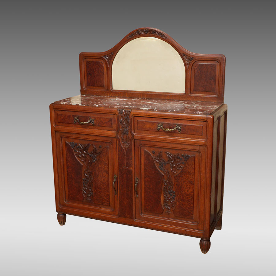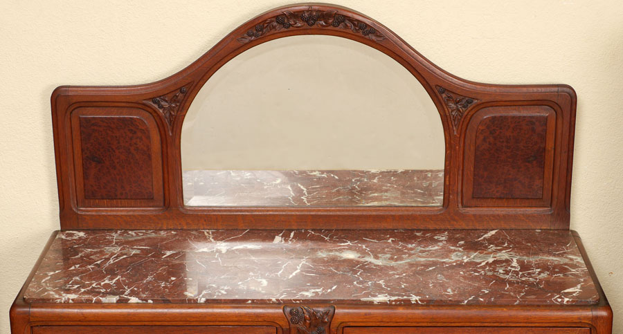 CARVED ART DECO MARBLE TOP SERVER: Arched backsplash with center beveled glass mirror, inset marble top, 2 drawers over 2 doors, carved blackberry plant motif decoration. Overall 61'' h. x 49'' x 18''.