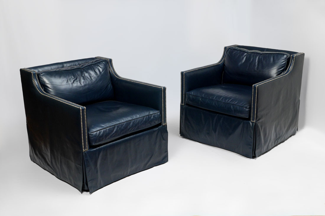 PAIR OF BERNHARDT LEATHER DELANO CLUB CHAIRS: Dark blue leather upholstery with tacked arms, fixed, not swivel base. Overall measures 32'' h. x 33'' x 36''.