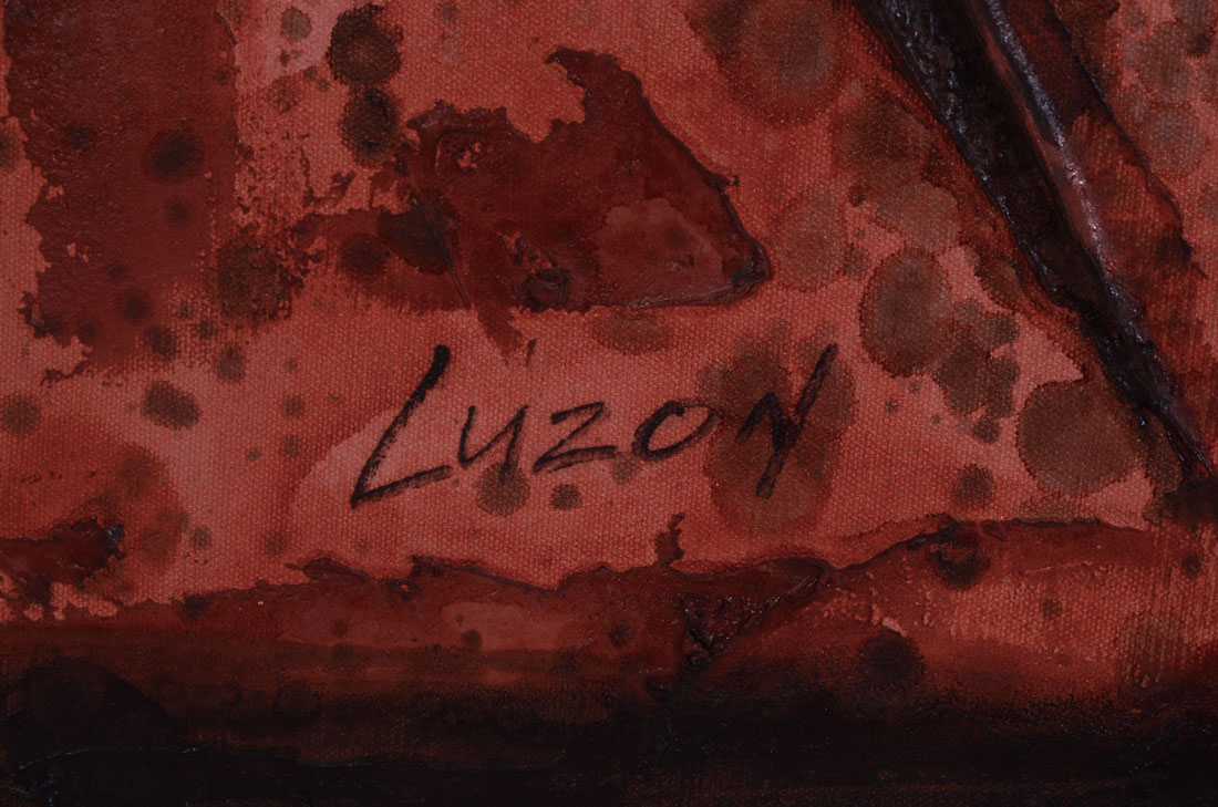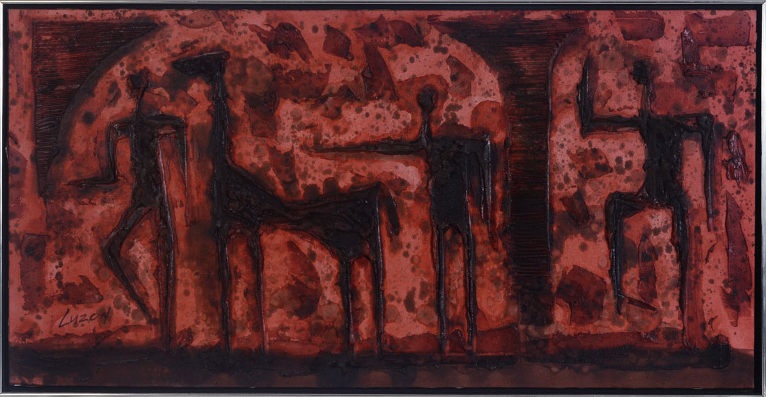 LUZON RELIEF PAINTING WITH HORSE AND FIGURES: Oil/Canvas with heavy impasto and relief, sight size is 24'' x 48'', signed lower left, framed 25.50'' x 49''.