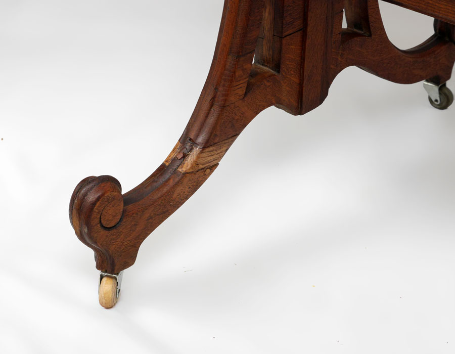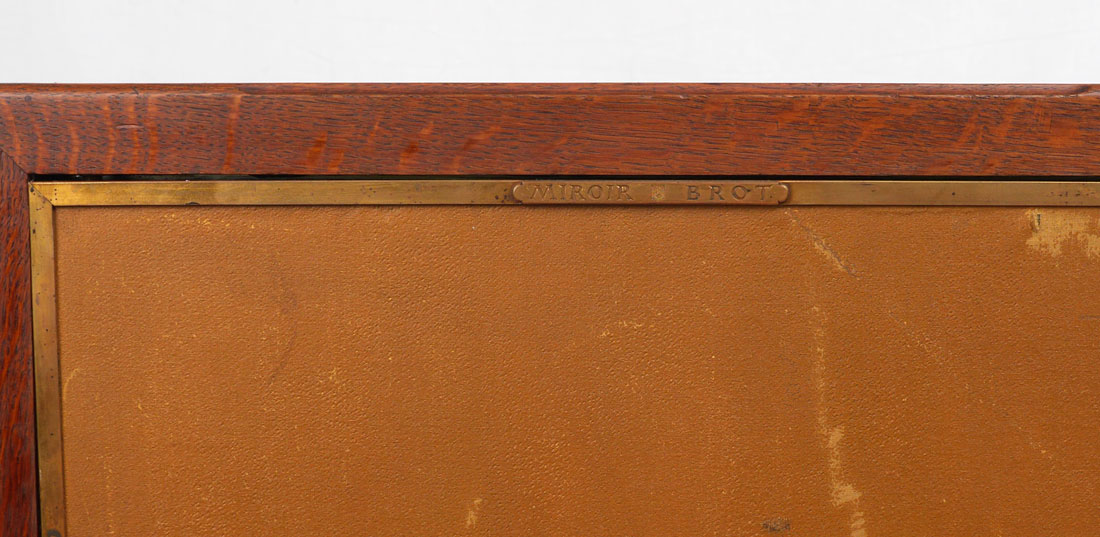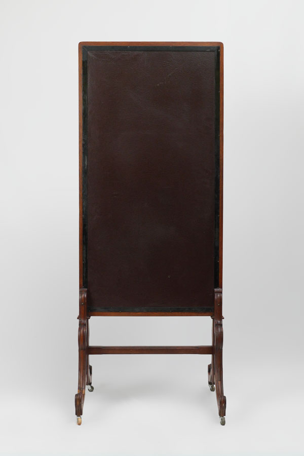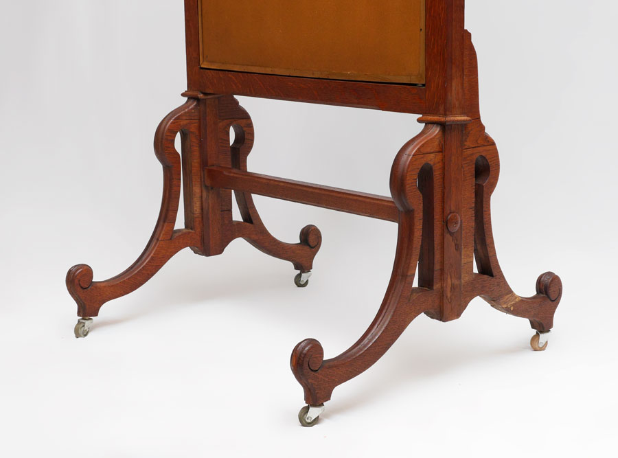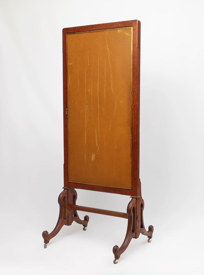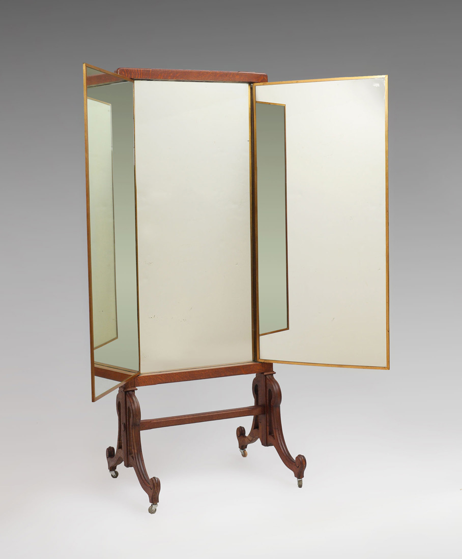 TRIFOLD MIROIR BROT CHEVAL DRESSING MIRROR: Late 19th to early 20th century, oak frame and carved legs on castors, overall measures 67 1/4'' h. x 27'' x 24'', side mirrors 23'' wide each.