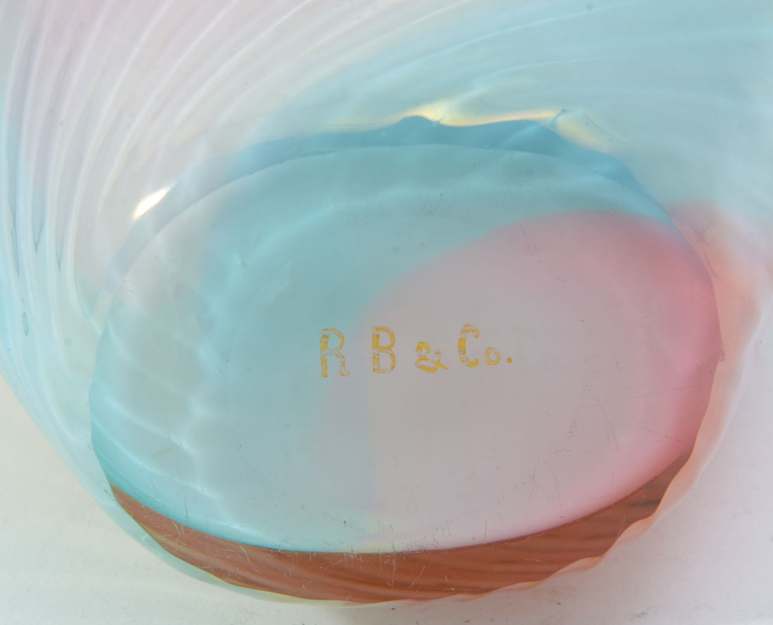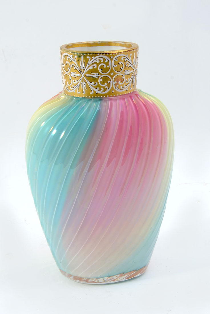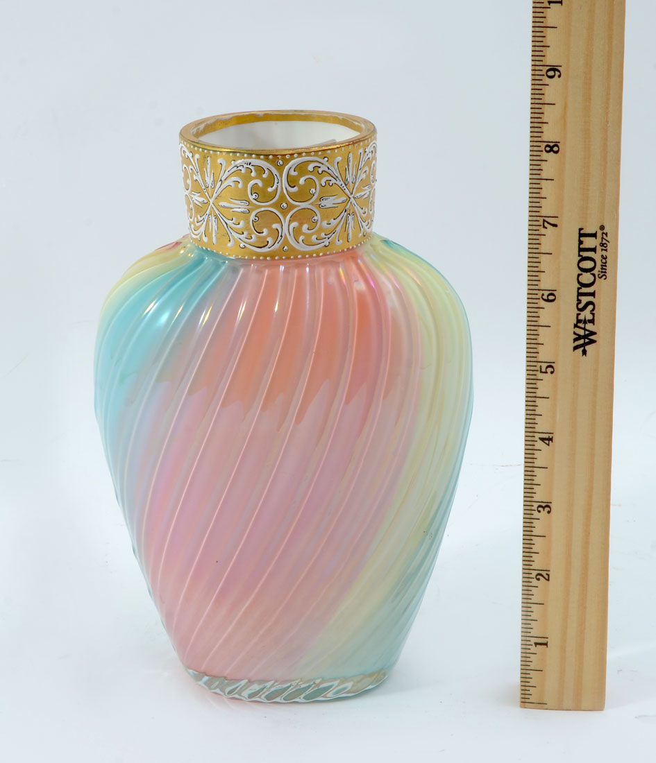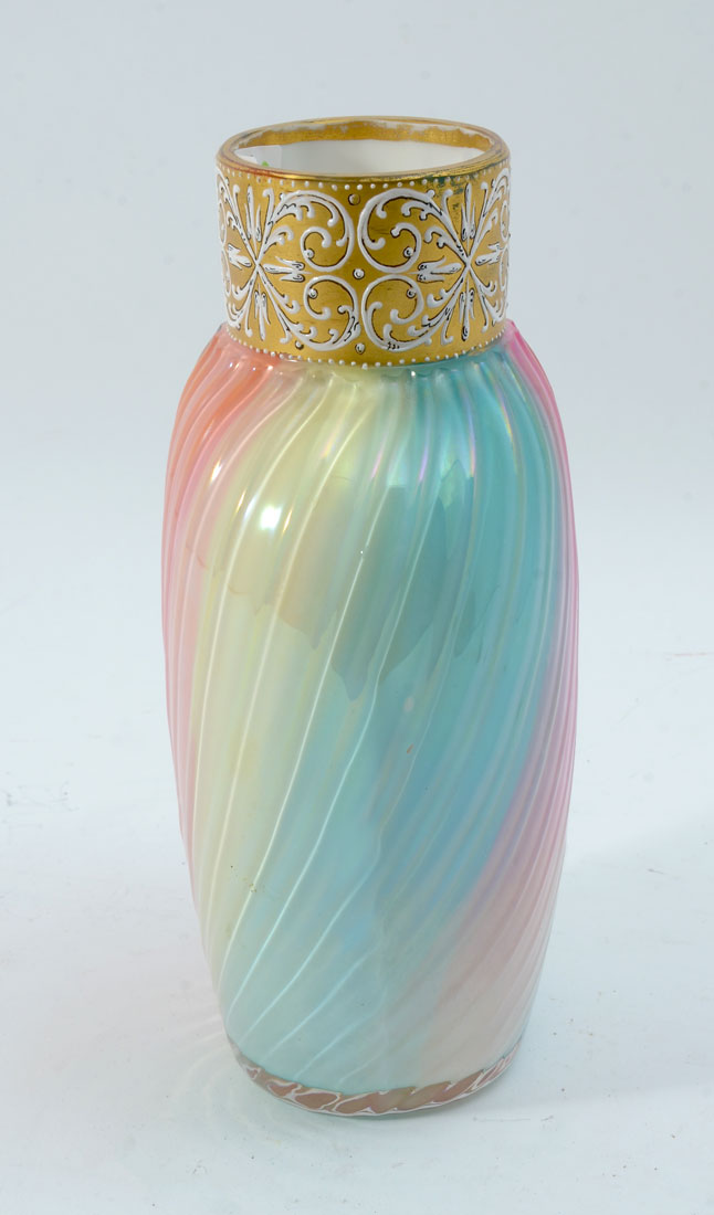 RIBBED ART GLASS VASE: Ribbed body with a slight twist and a rainbow of hues, gold and white foliate scroll collar, signed RB & Co, 8'' h. x 5 1/2'' x 3 1/2''.