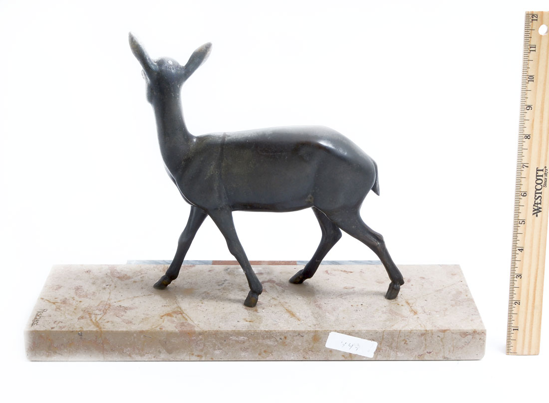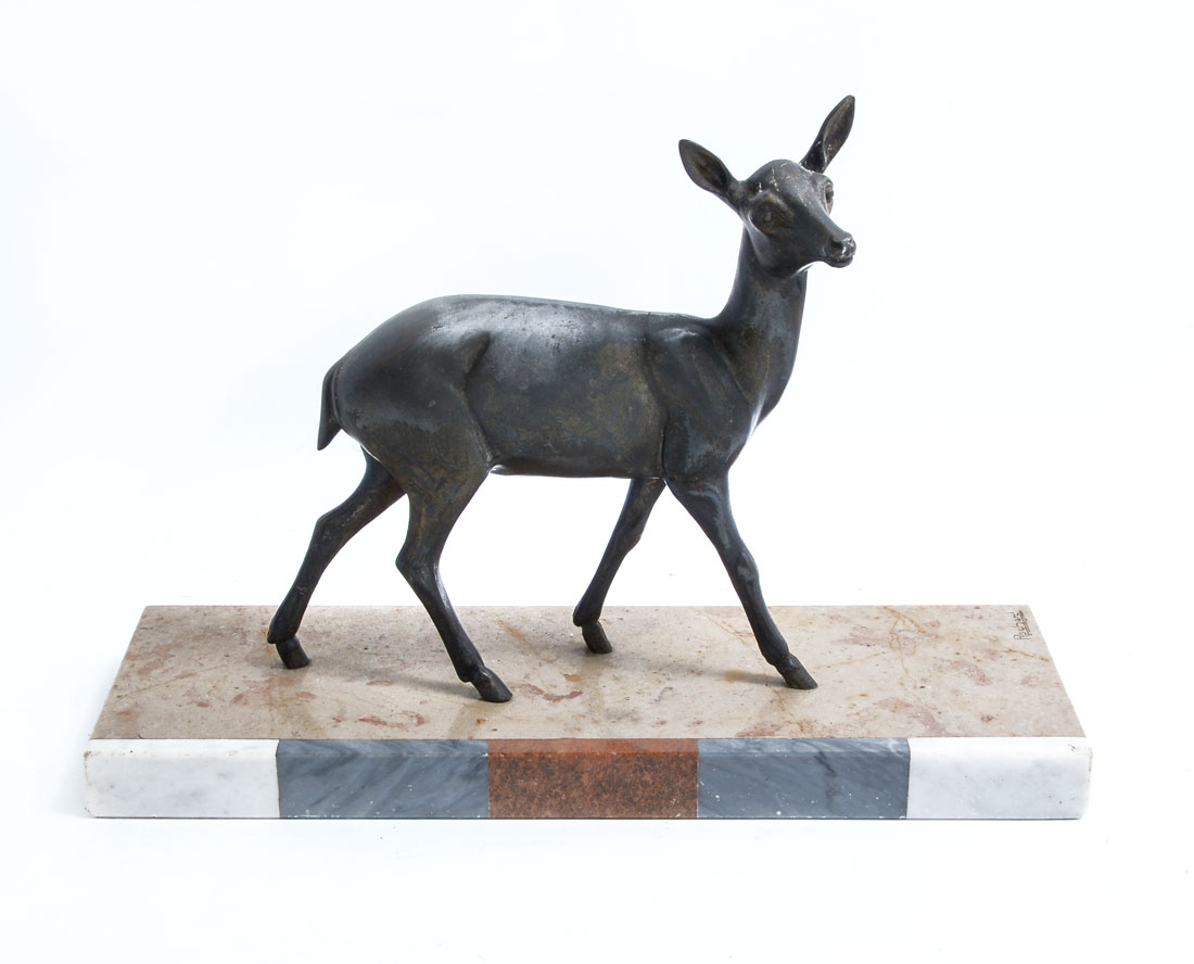 AFTER IRENEE ROCHARD ART DECO FIGURE OF A DEER: Patinated art deco era spelter figure of a deer affixed to marble base signed Rochard, measures 11'' h. x 16'' x 6''.
