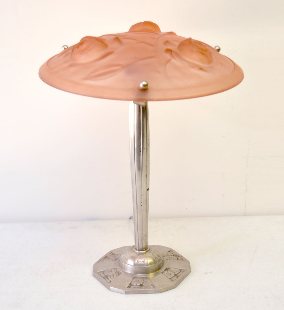 ART DECO TABLE LAMP: Heavy silvered cast metal base with floral panels. Double light socket, 16 1/2'' x 11'' dia. Pink frosted glass shade with embossed roses, 2 3/4'' h. x 14 1/4''.