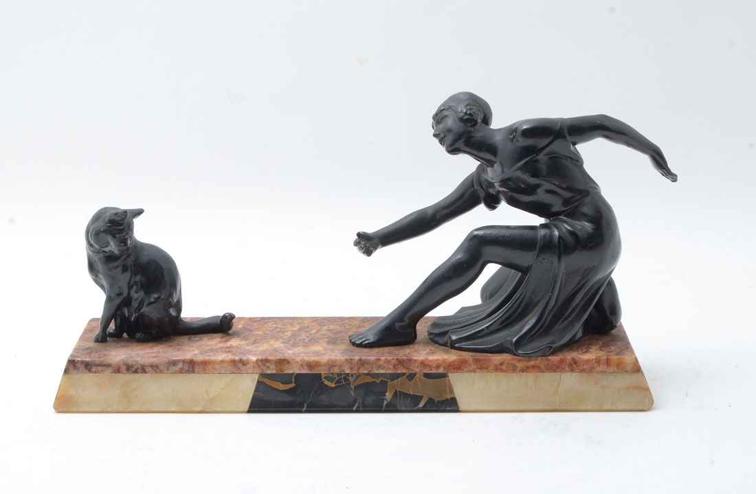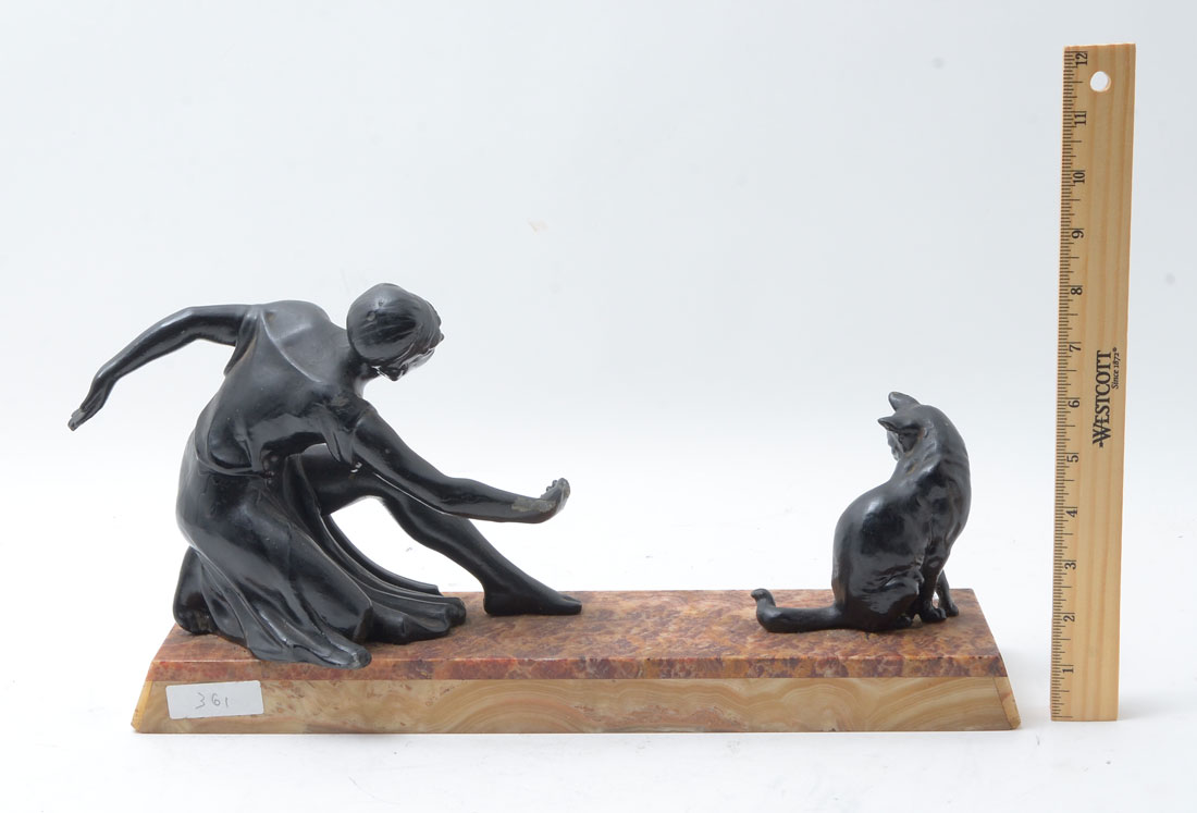 ART DECO FIGURE OF A WOMAN AND CAT: Patinated spelter figure of a woman and a seated cat, affixed to marble base, 8 1/2'' h. x 16 1/4'' x 4 1/4''.