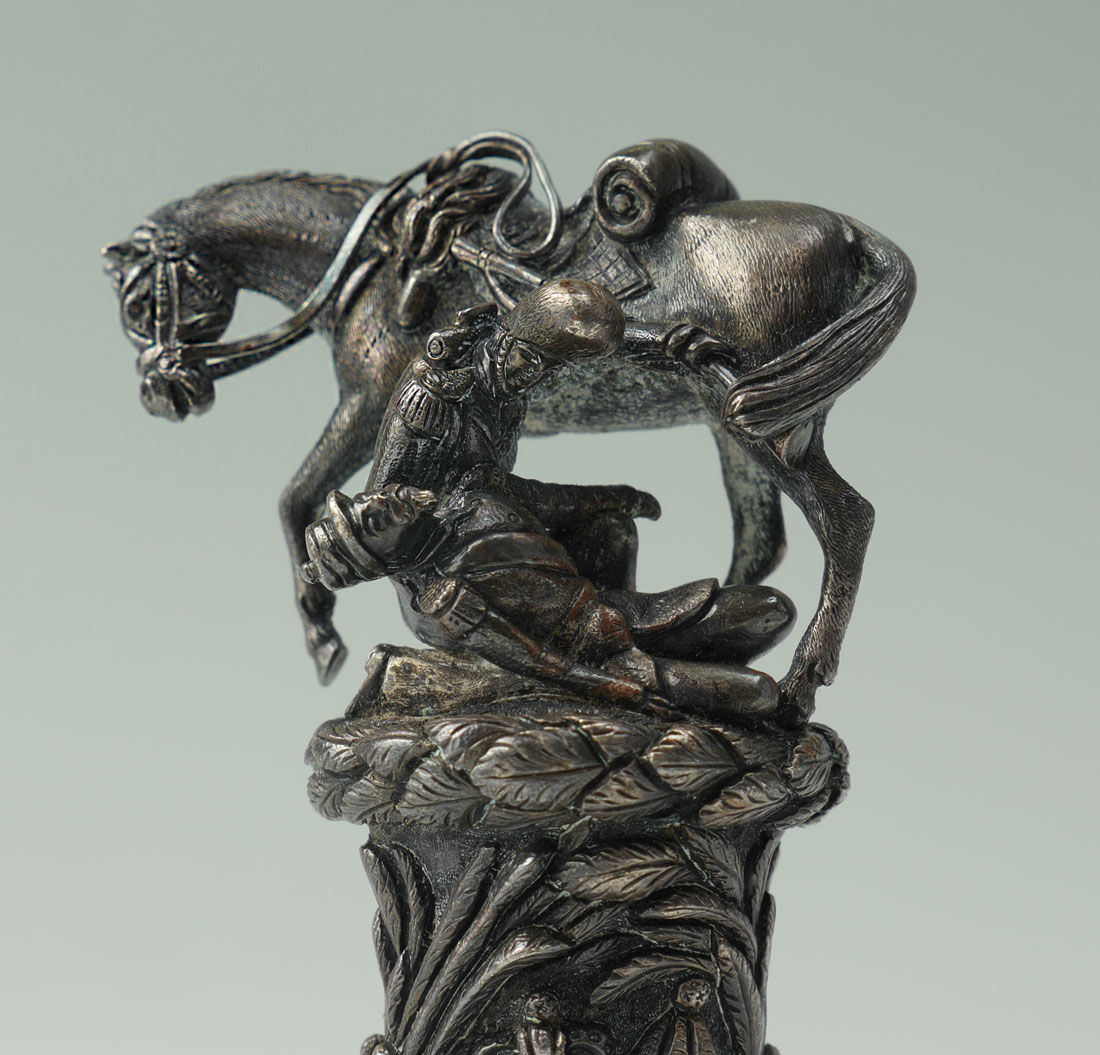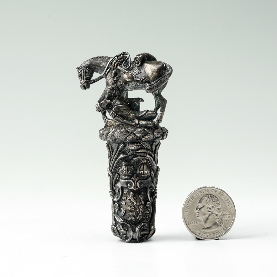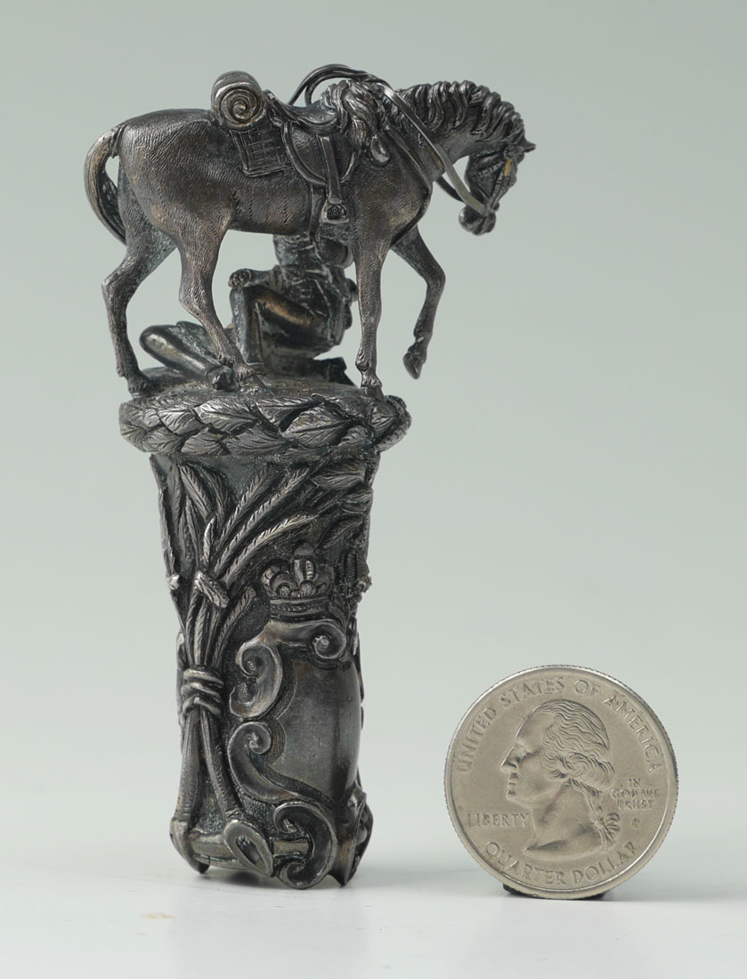 FRENCH FALLEN CAVALRY SOLDIER WALKING STICK TOPPER: Cast metal figural walking stick or cane topper with a French soldier helping a fallen comrade and a horse, overall measures 3 1/2'' h.