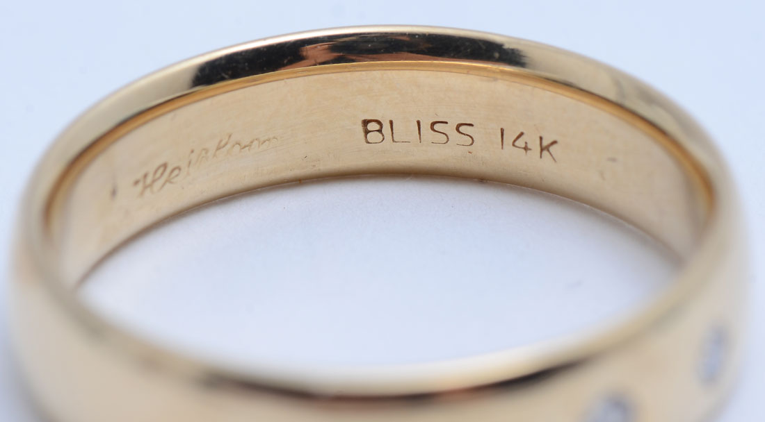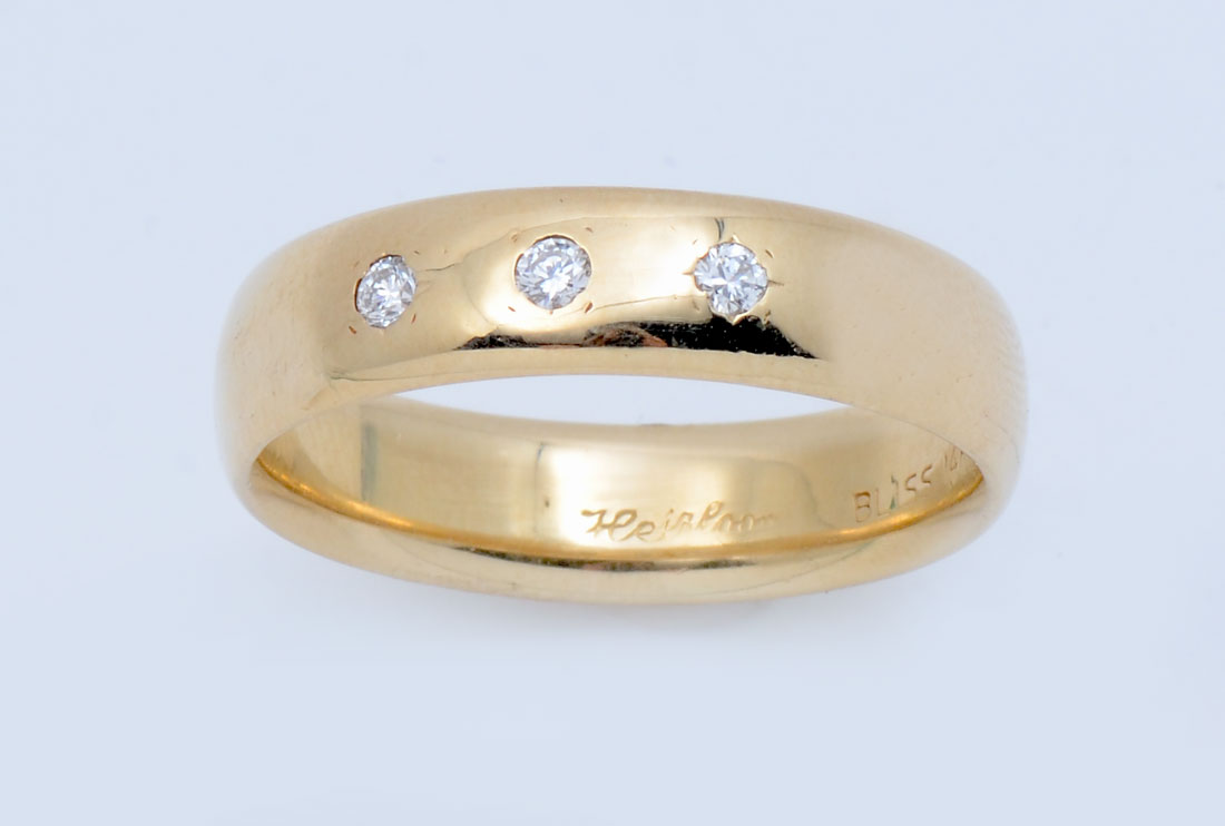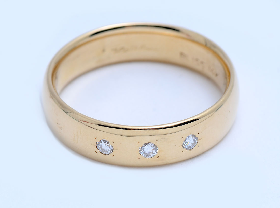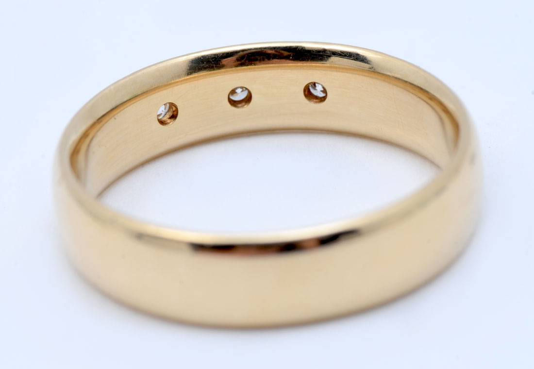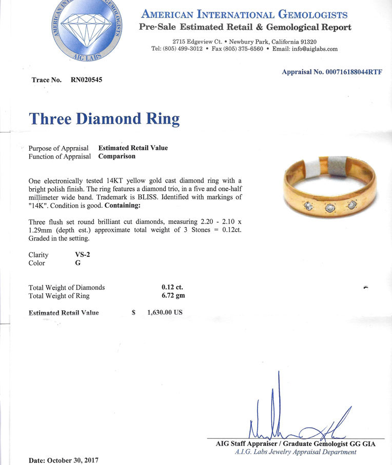 MENS 14K & DIAMOND RING: Ring features a diamond trio in a 5.5 mm wide band. 3 flush set diamonds approx .12CT with VS2 clarity and G in color. Weight 6.72 grams. Size 10. sold with American International Gemologists appraisal for $1630.