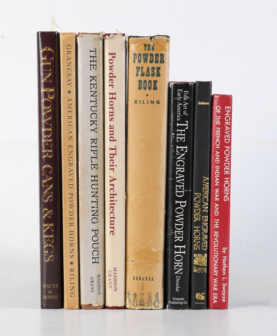 8 REFERENCE BOOKS ON POWDER HORNS & MORE: An assembled collection of 8 books with emphasis on American powder horns, pouches, cans & kegs.