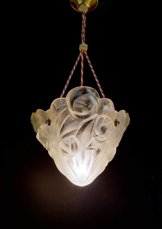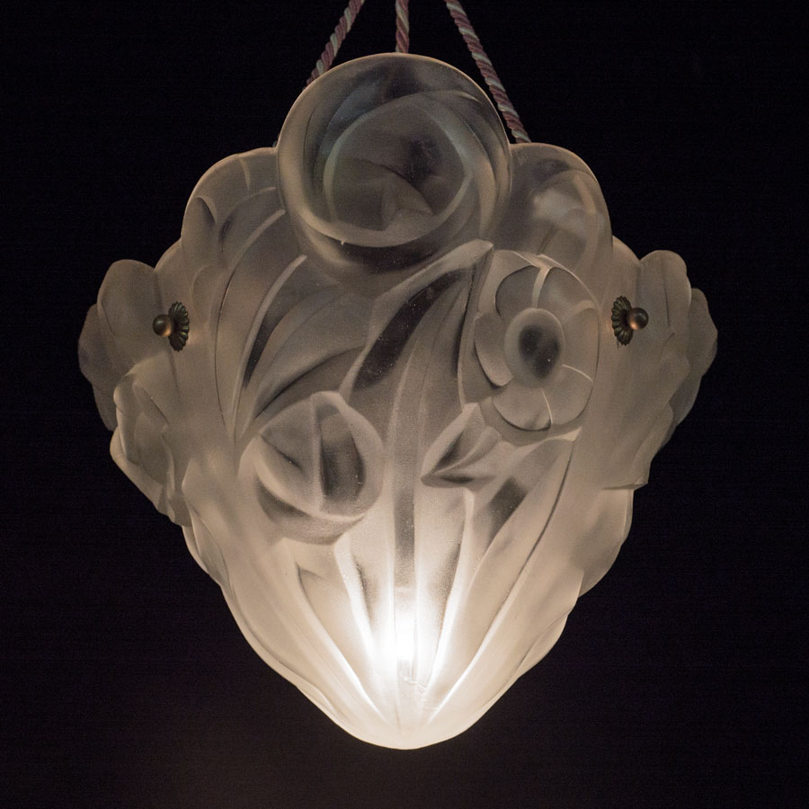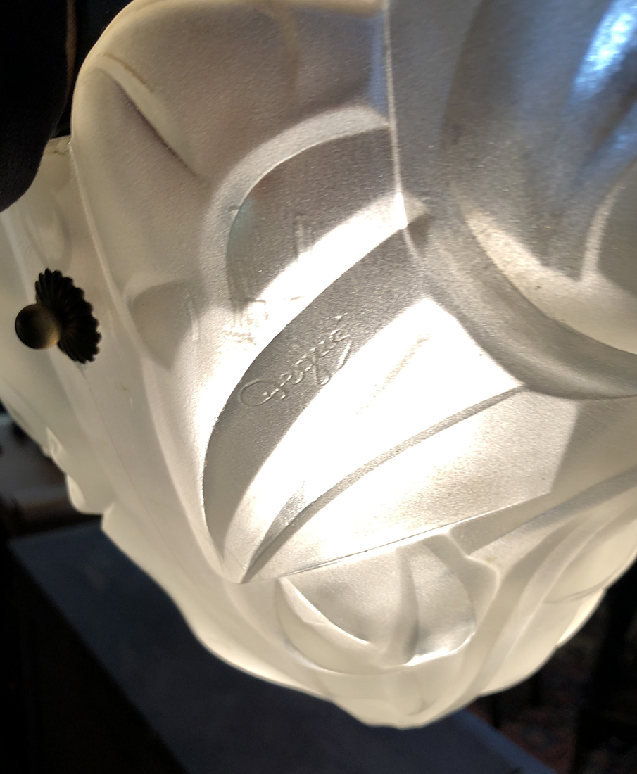 DEGUE FRENCH ART GLASS CHANDELIER: Three sided molded frosted glass with stylized floral motif, supported by 3 ropes, signed Degue. 10 1/2'' h. x 13''.