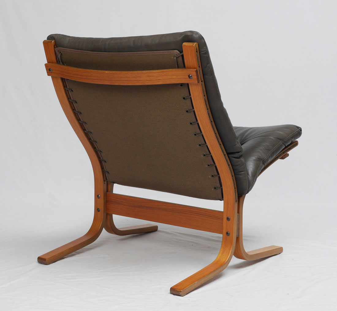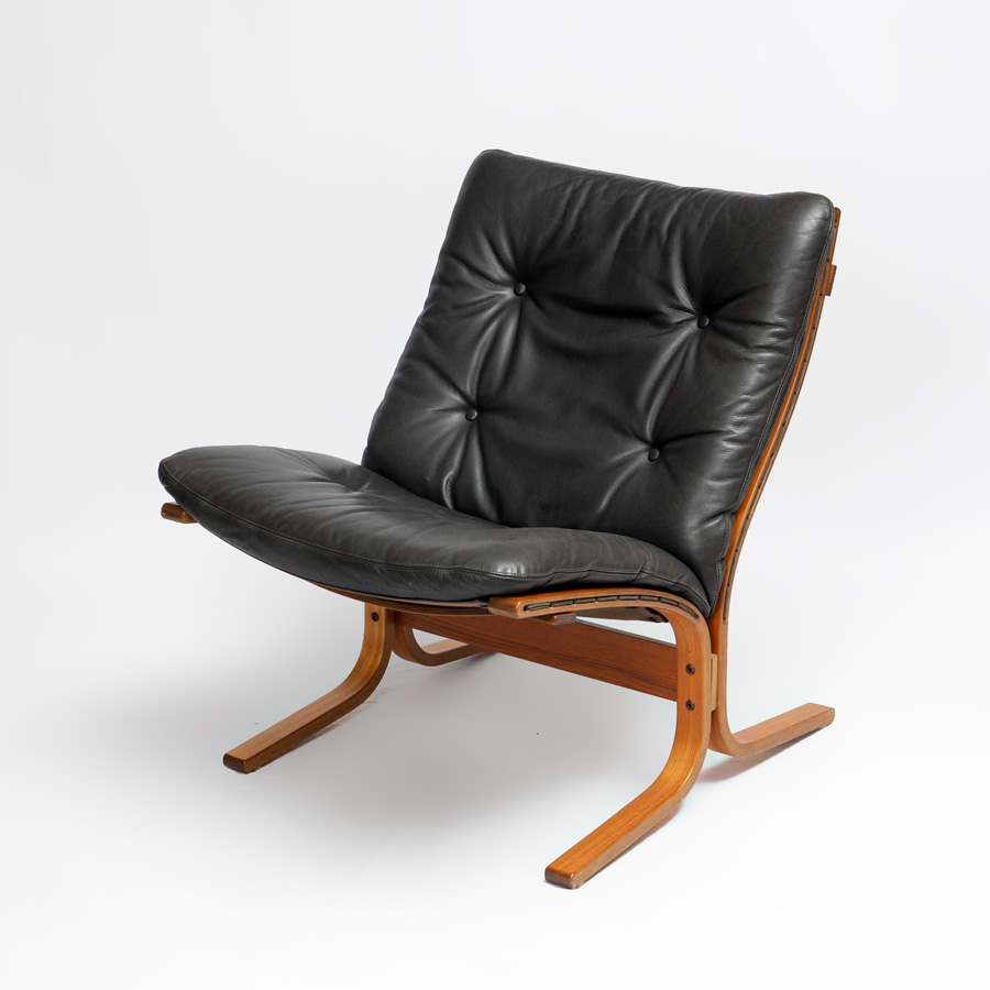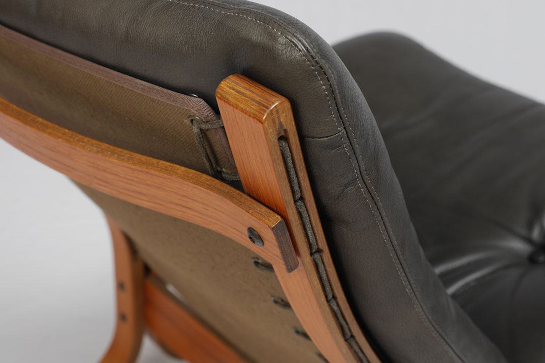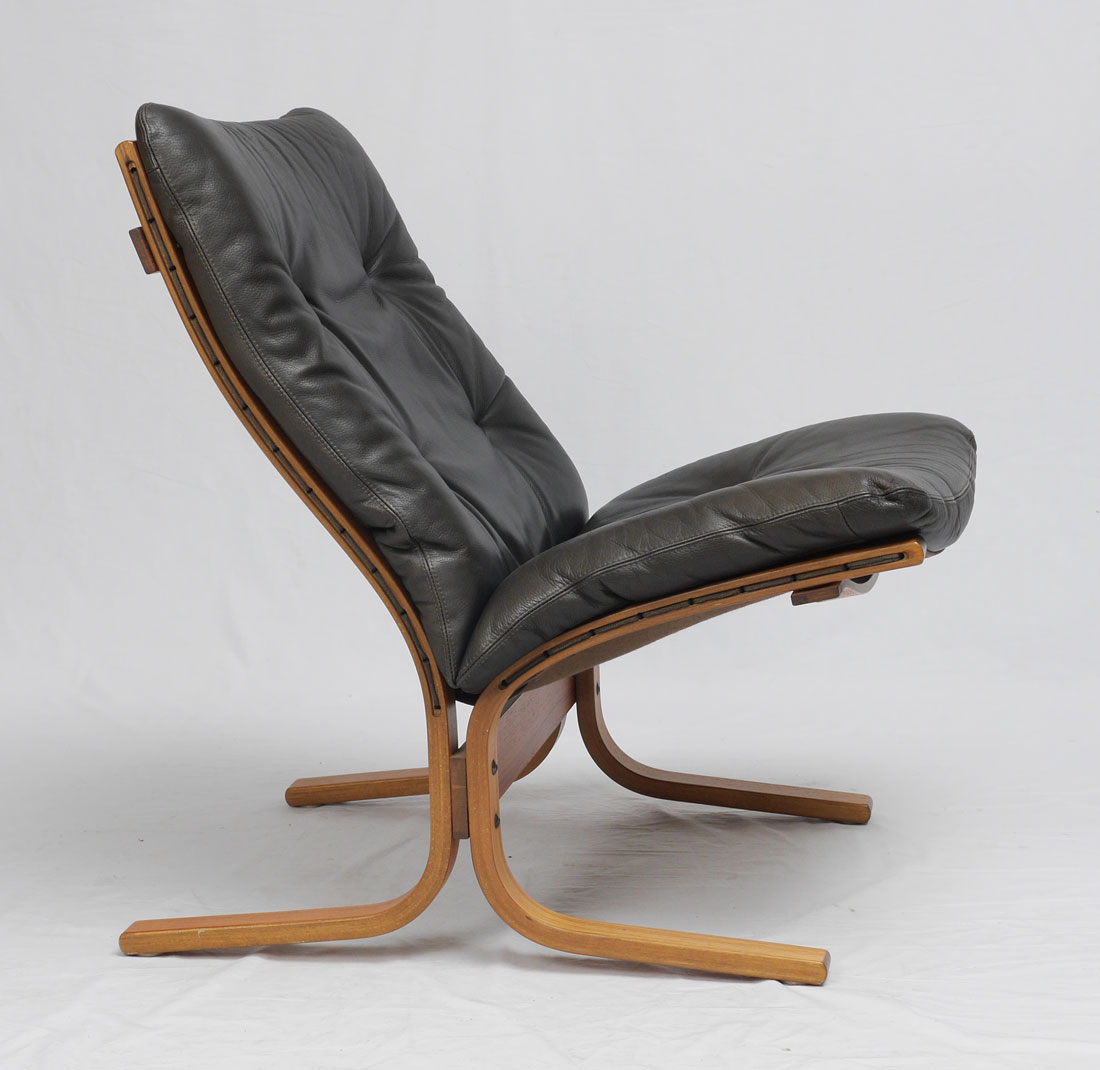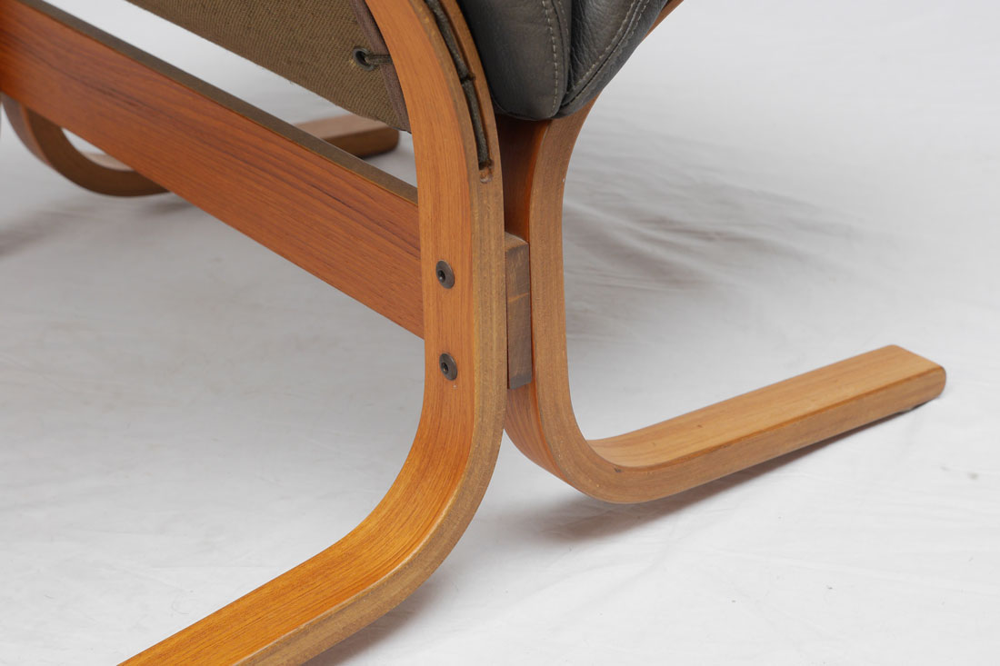 INGMAR RELLING FOR WESTNOFA LEATHER SIESTA CHAIR: Tufted black leather upholstery, bent wood frame, overall measures 31 3/4'' h. x 26'' x 33''.