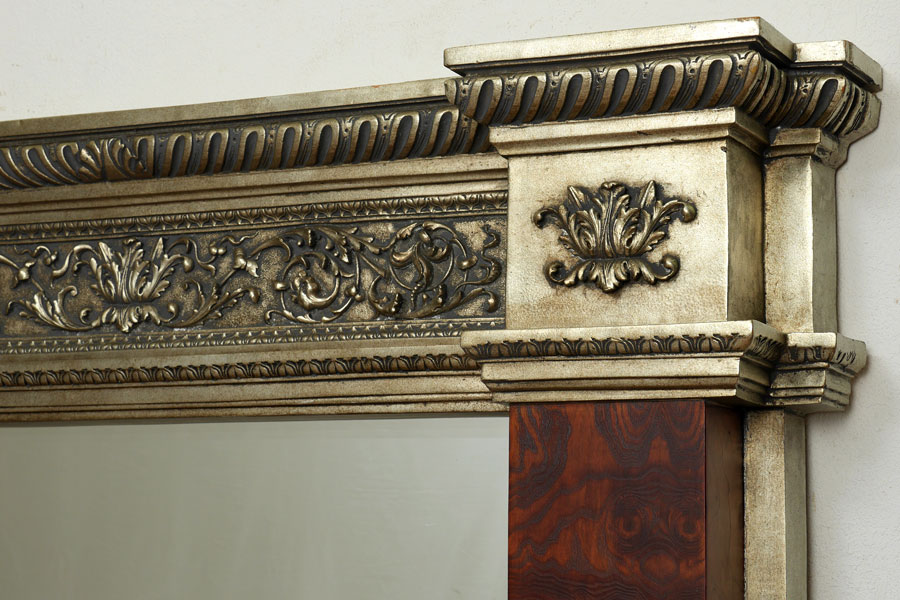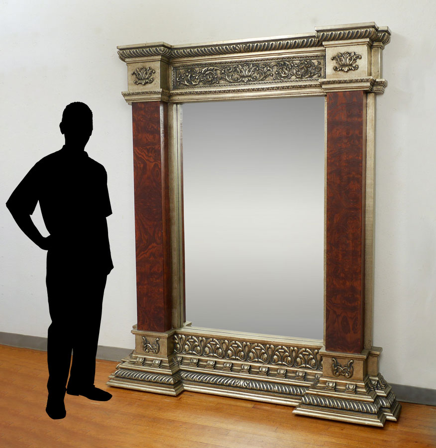 LARGE DECORATIVE FLOOR PIER MIRROR: Composite frame with foliate scroll and gadroon designs, faux burl wood stiles, overall measures 84'' h. x 65 1/2'' x 12''.