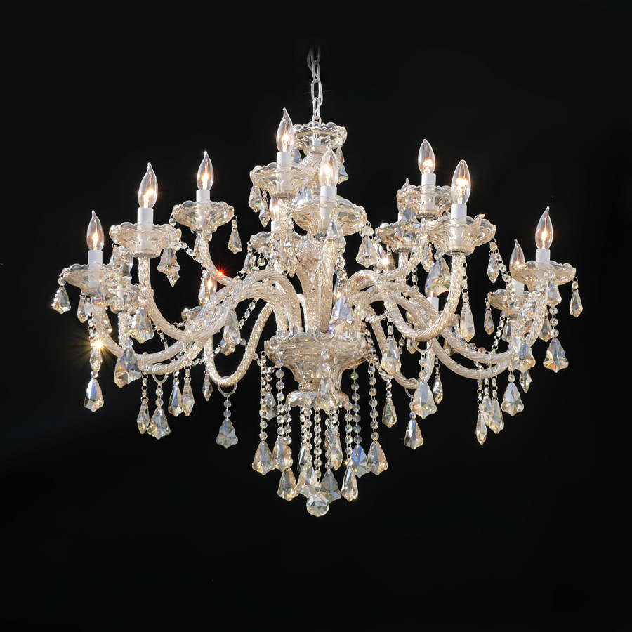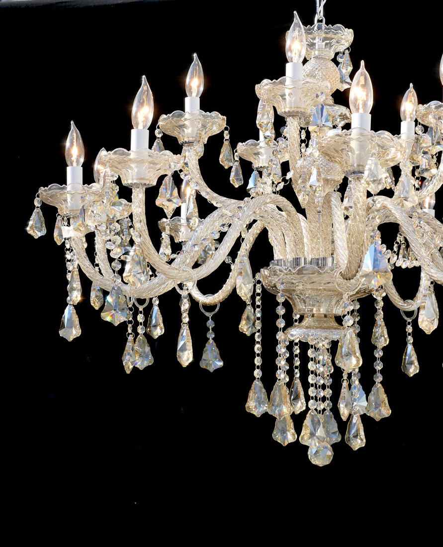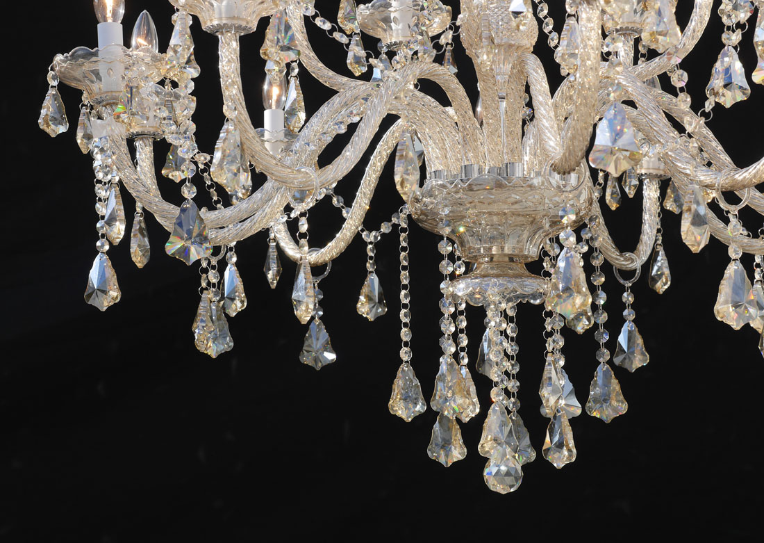 CONTEMPORARY 15 LIGHT CRYSTAL CHANDELIER: 15 twist glass arms on 2 tiers, crystal swags, chrome frame, overall 30'' h. x 37'' excluding chain.