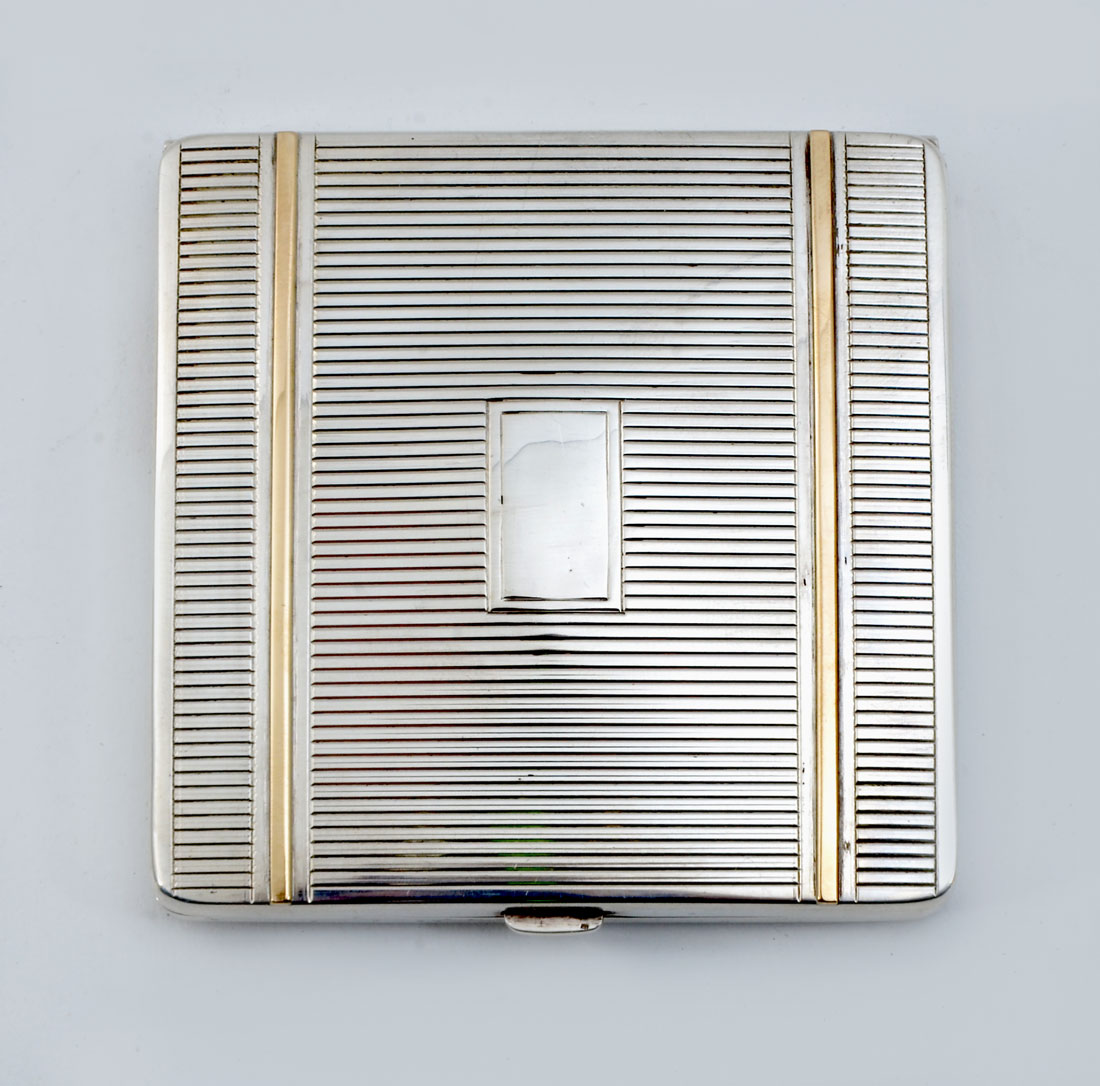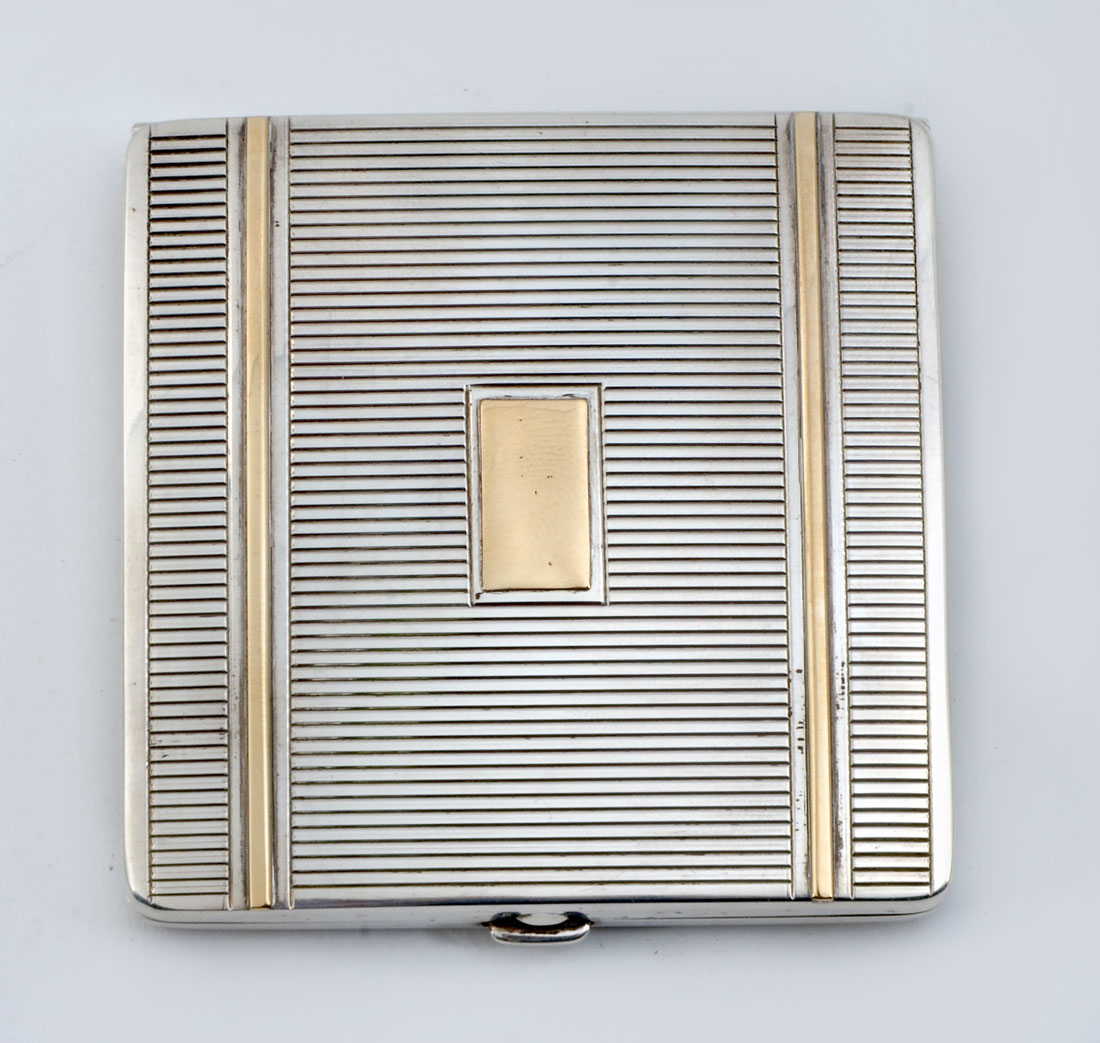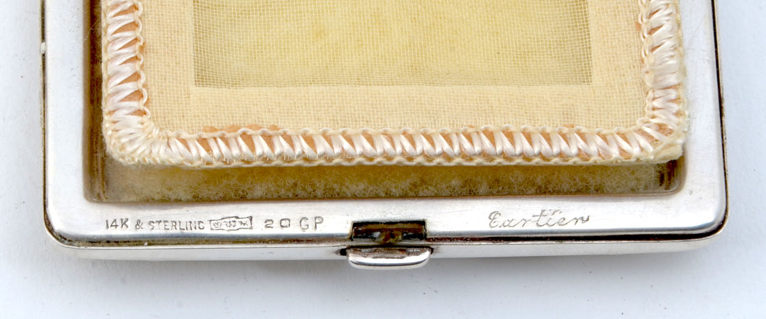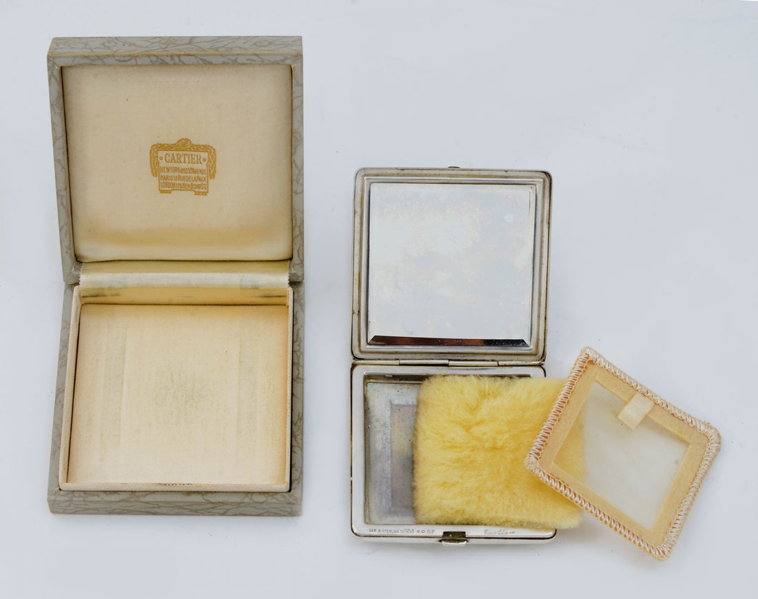 CARTIER STERLING AND 14K GOLD COMPACT: Watson for Cartier sterling and 14k gold square compact with puff, 2 1/2'' h. x 2 1/2''. Sold with fitted Cartier box.