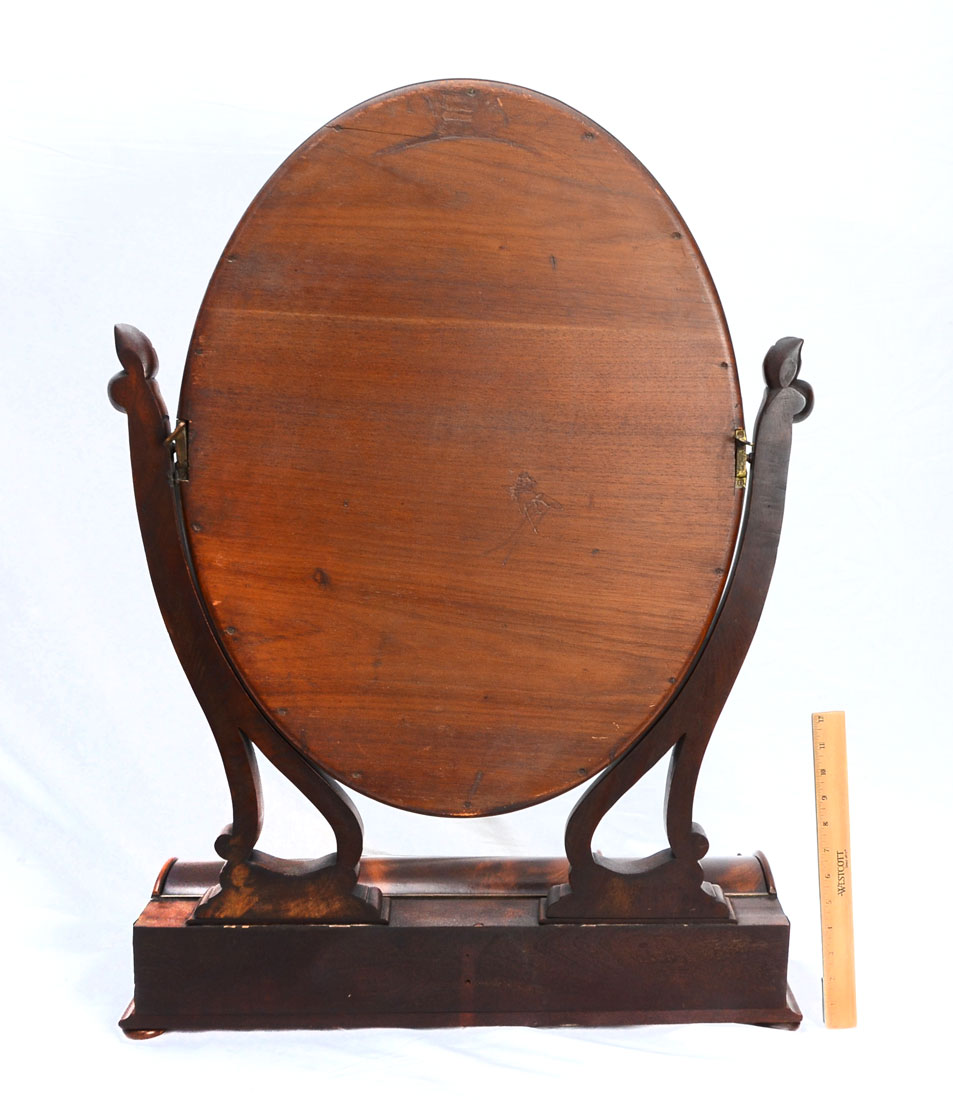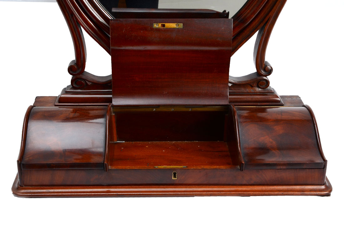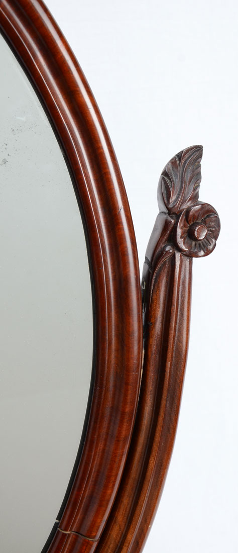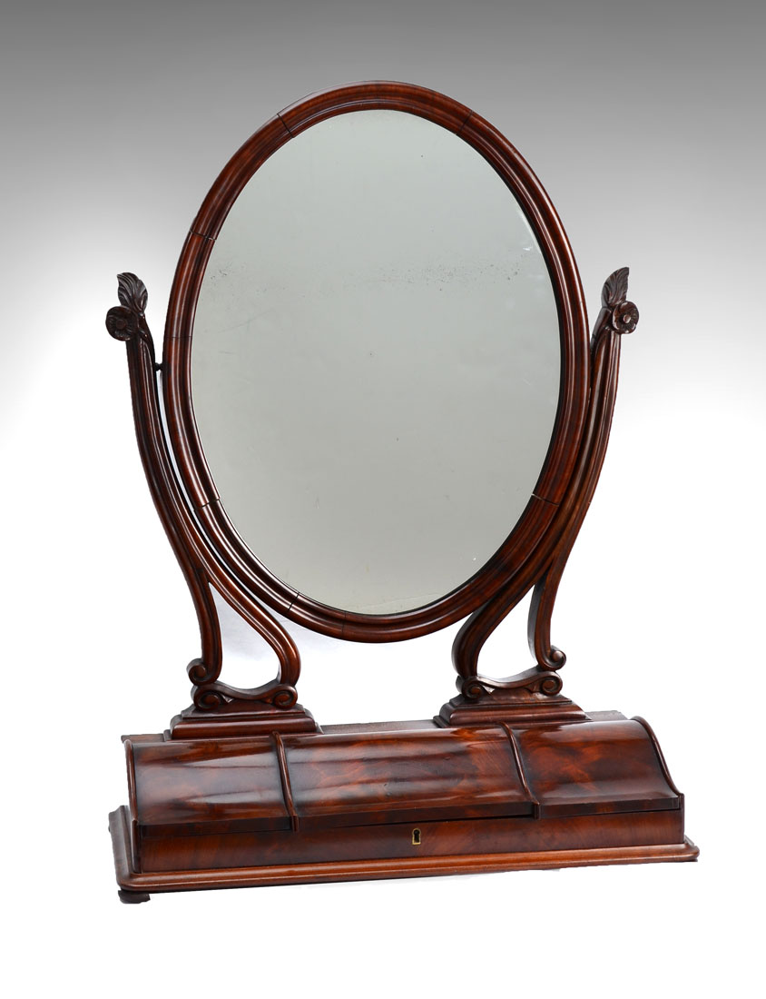 MEN'S MAHOGANY DRESSING MIRROR: Oval articulated mirror, supports with carved floral design, base with 3 shaped hinged lit top doors, center door with lock, no key, all on bun feet. Overall 35 1/2'' h. x 25'' x 10 3/4''.