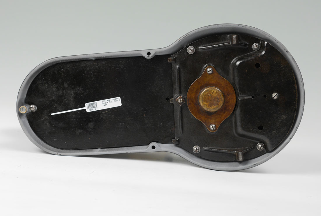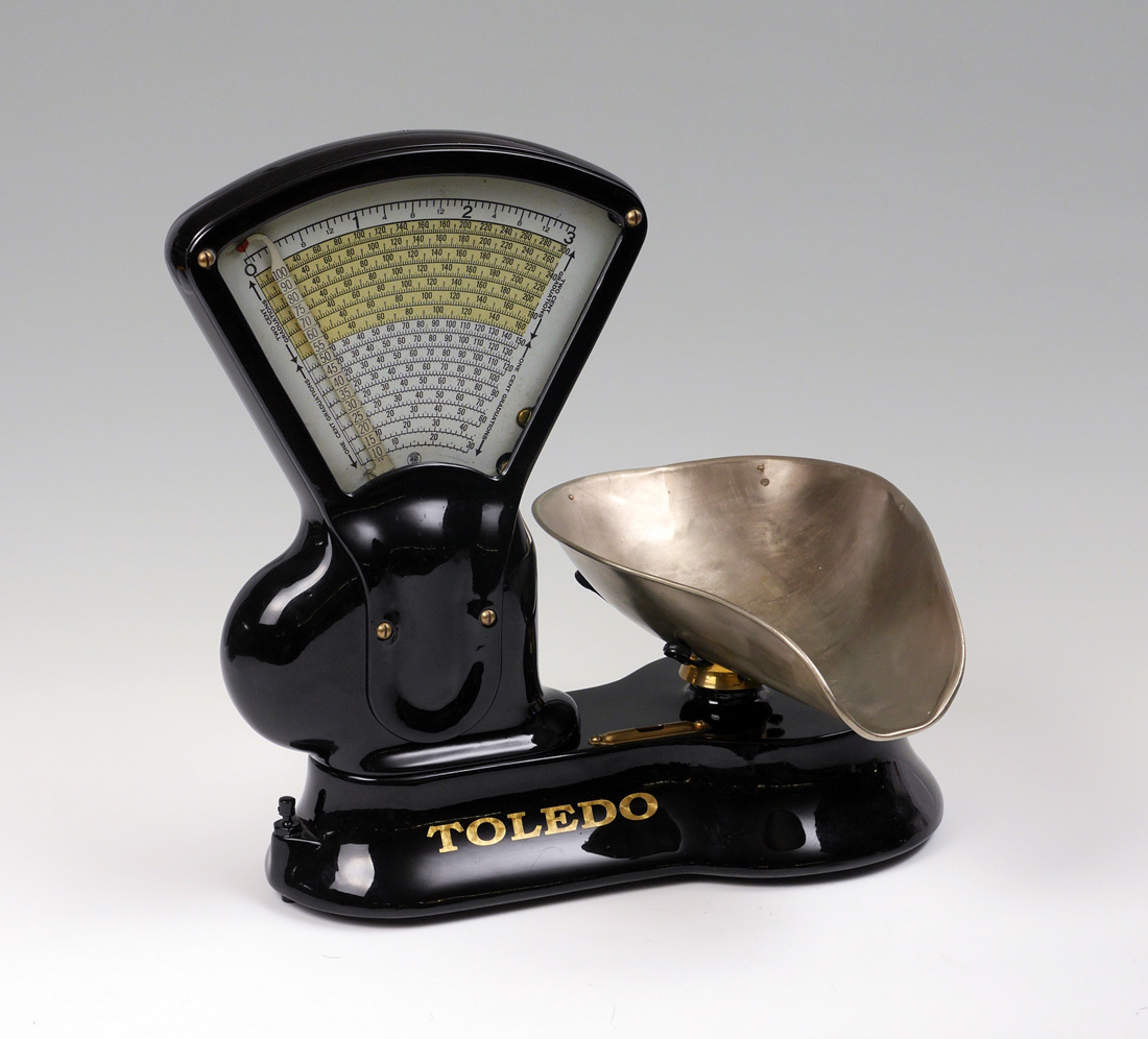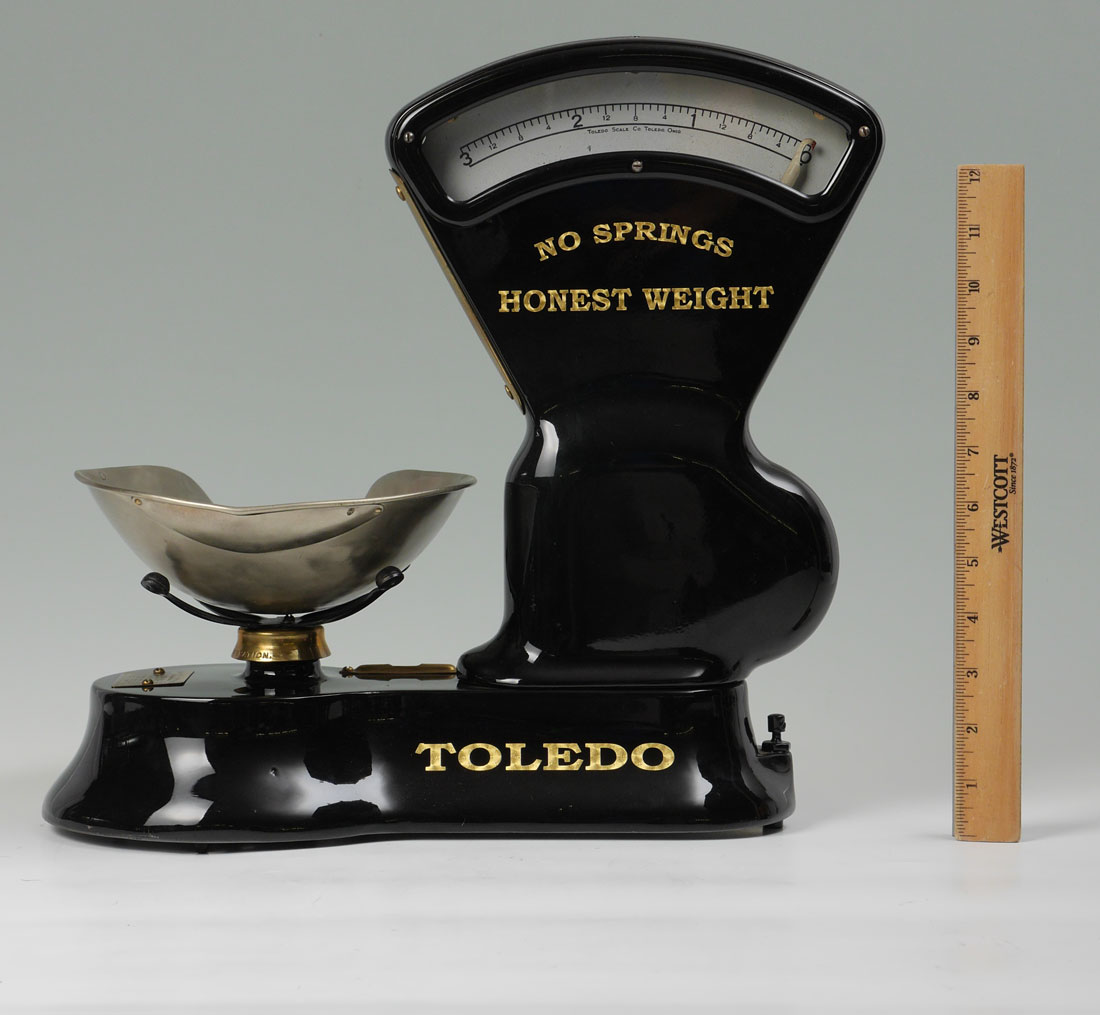 TOLEDO 3LB FAN CANDY SCALE: Black enamel cast iron base with gold lettering, original brass plaque with style 405 AR, serial number 344209. Expertly restored, overall measures 14 1/2'' h. x 14'' x 7''. Sold with an aluminum tray.