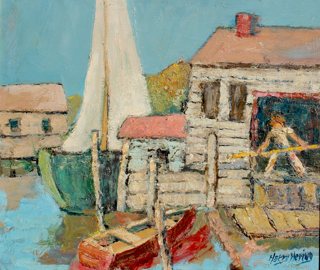 HERING, Harry, (American, 1887-1967): Dockside Scene with Worker, Oil/Masonite, 20'' x 24'', signed lower right, carved and gilded wood frame, 27'' x 31''.