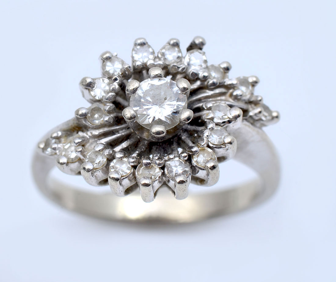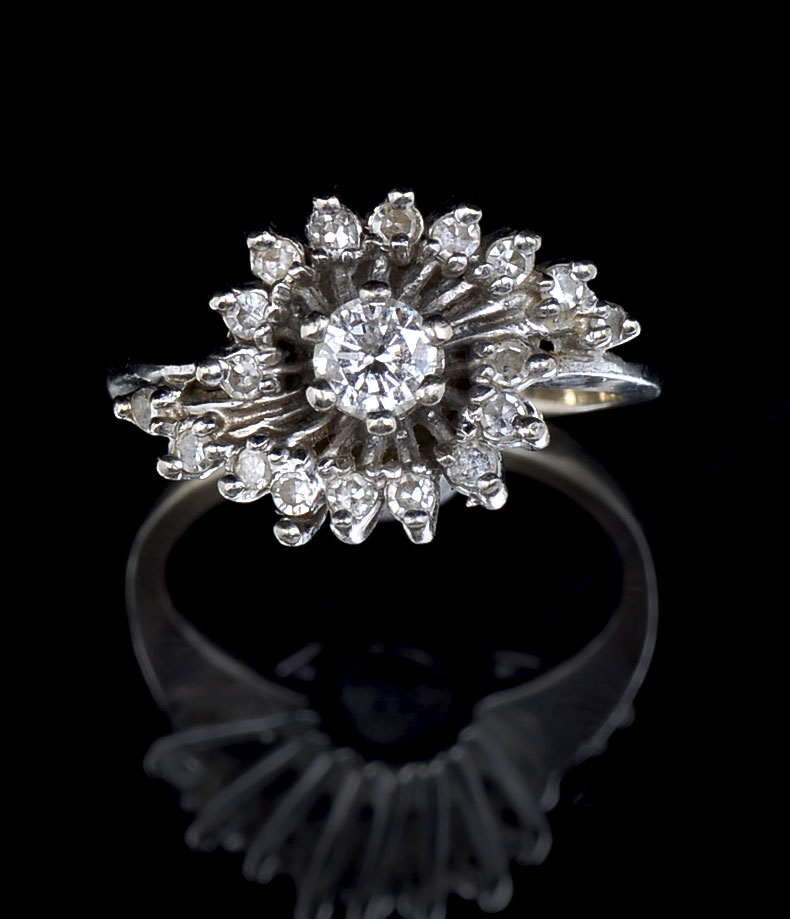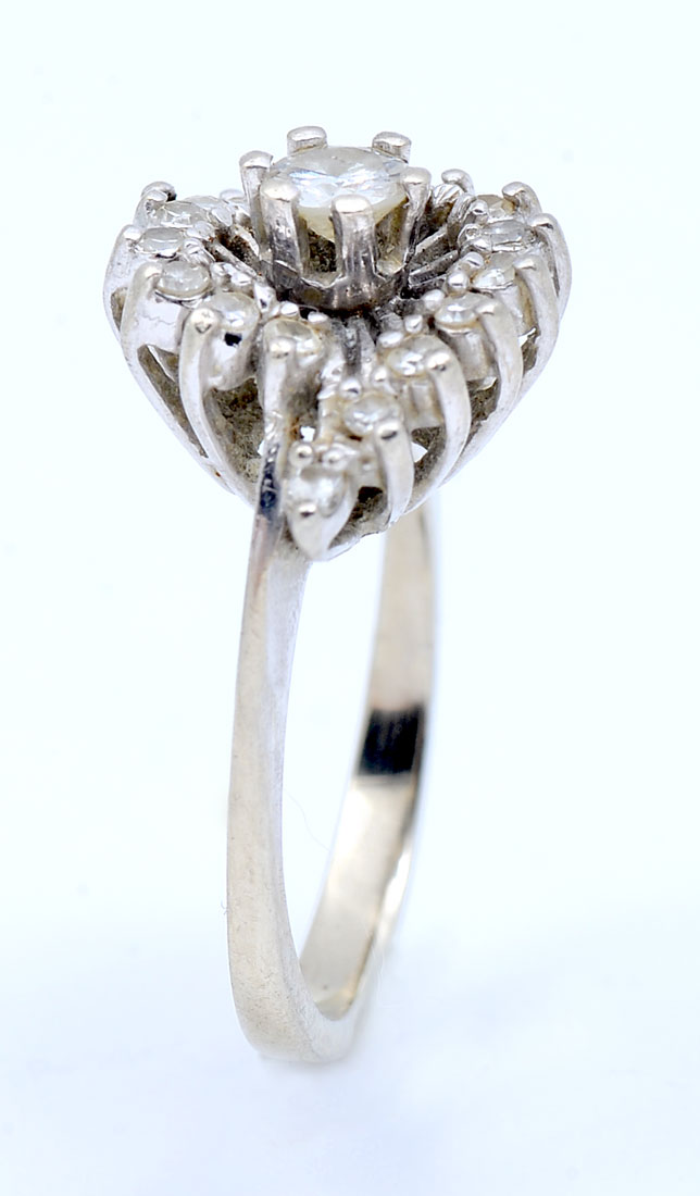 14K .50 CTW DIAMOND COCKTAIL RING: 14K white gold ring contains (1) round brilliant cut and (18) round single cut diamonds. WEIGHT: .50 Ct. Approx. Rated SI in clarity and H-I in color. Weight: 4.1 grams. Size: 5