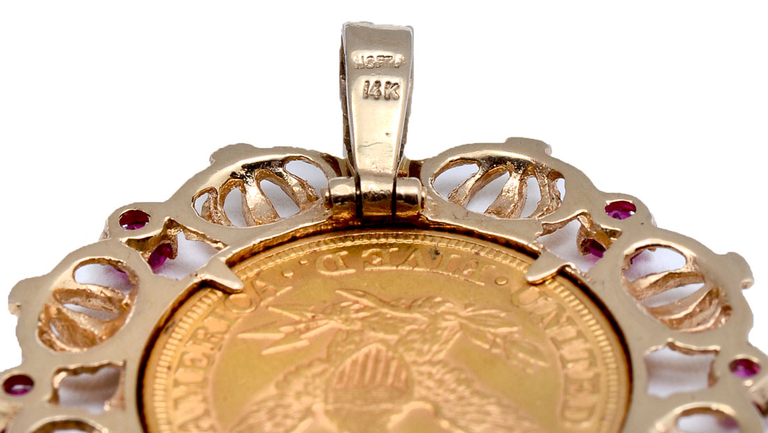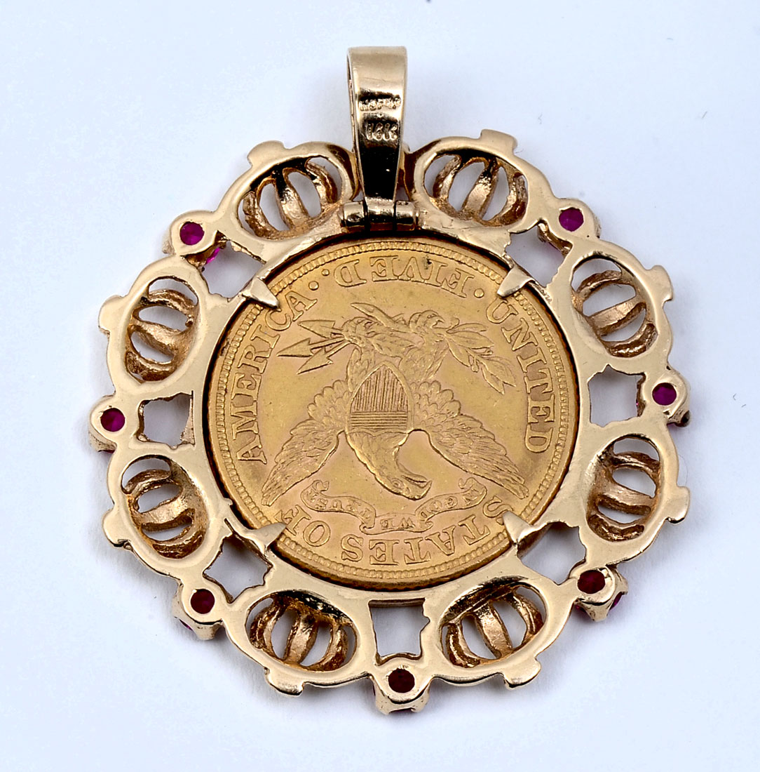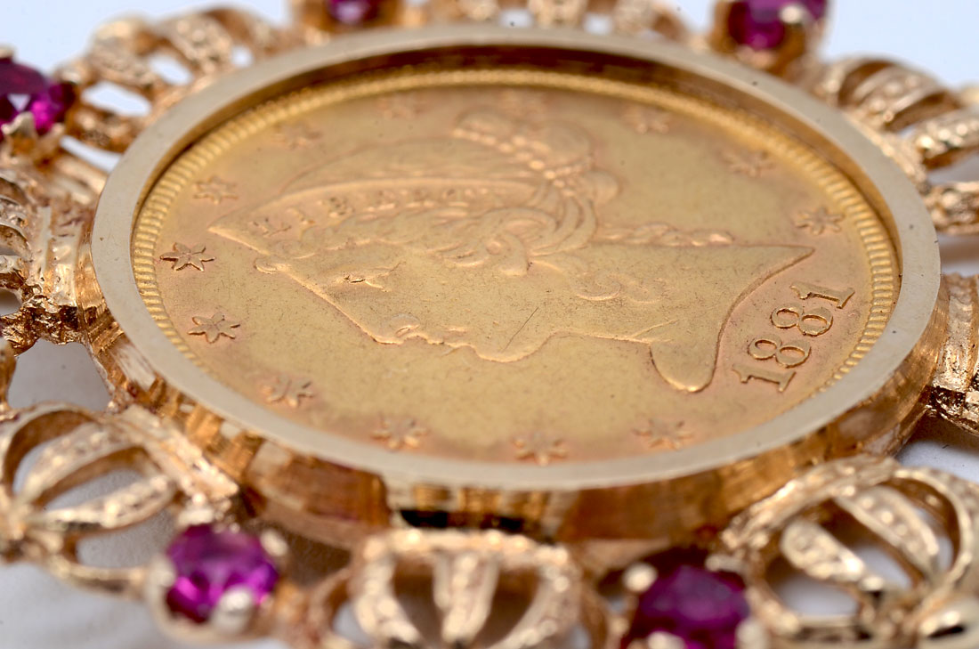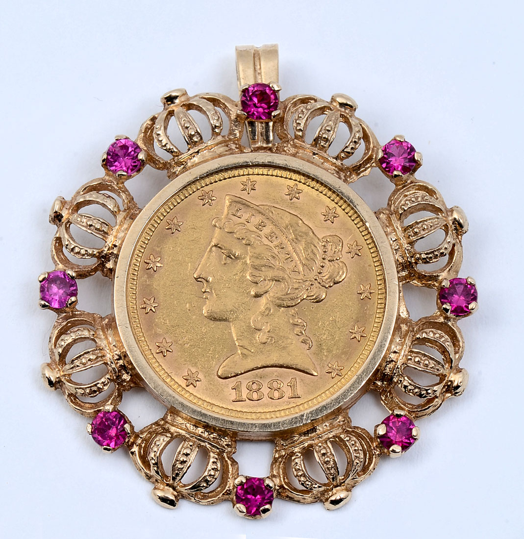 14K & RUBY CROWN FRAMED 1881 $5 LIBERTY COIN: 1881 $5 gold coin bezel set in 14K with crown frame dotted with 1CTW in rubies. With bail to wear as pendant. Weight 14.6 grams.