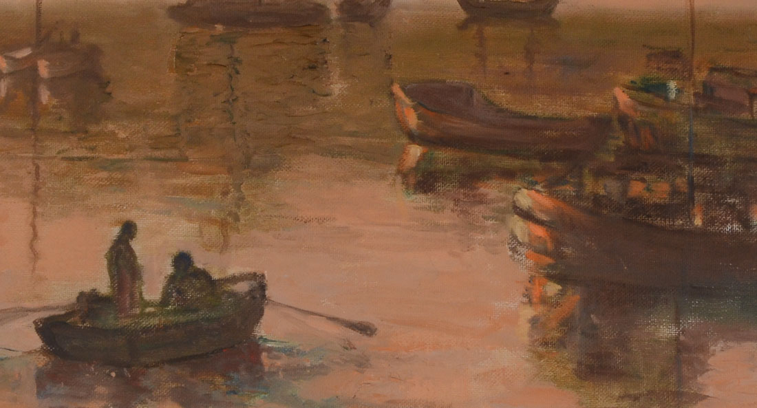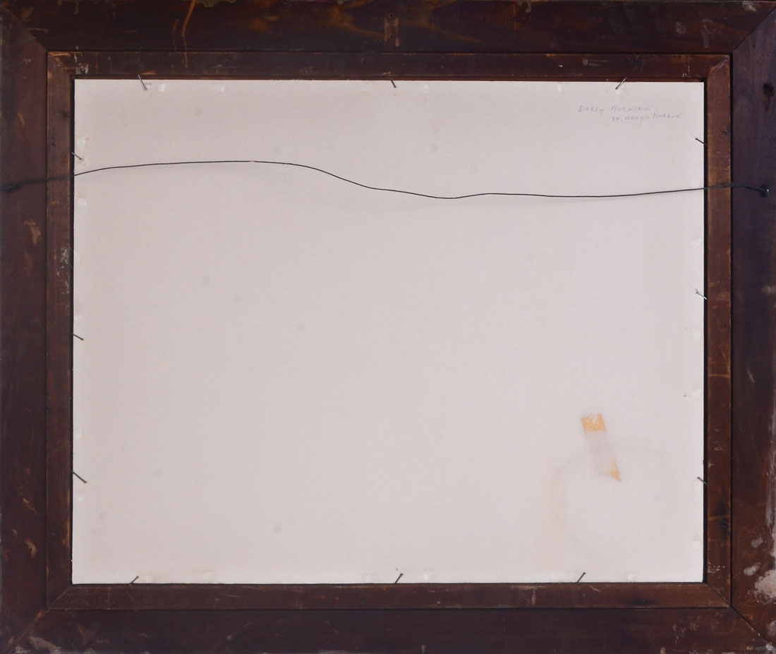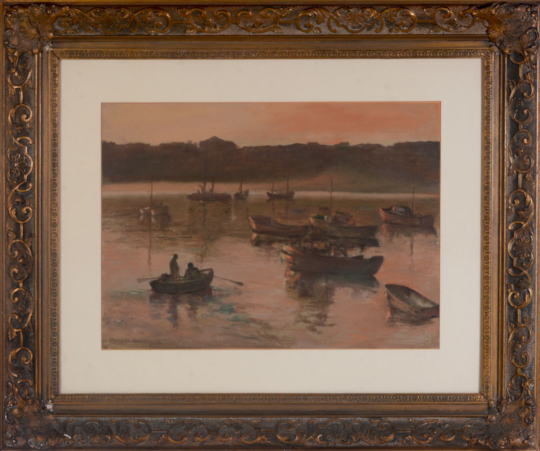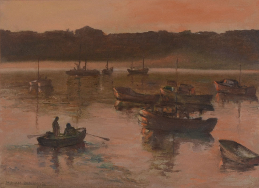 BROUDY, Miriam, (American, 1905-): ''Early Morning, St. Mary's Harbor'', Oil/Canvasboard, sight size 17.5'' x 23.5'', signed lower left and dated '86, titled verso, under plexiglass, gilded gesso frame, 32'' x 37.5''.