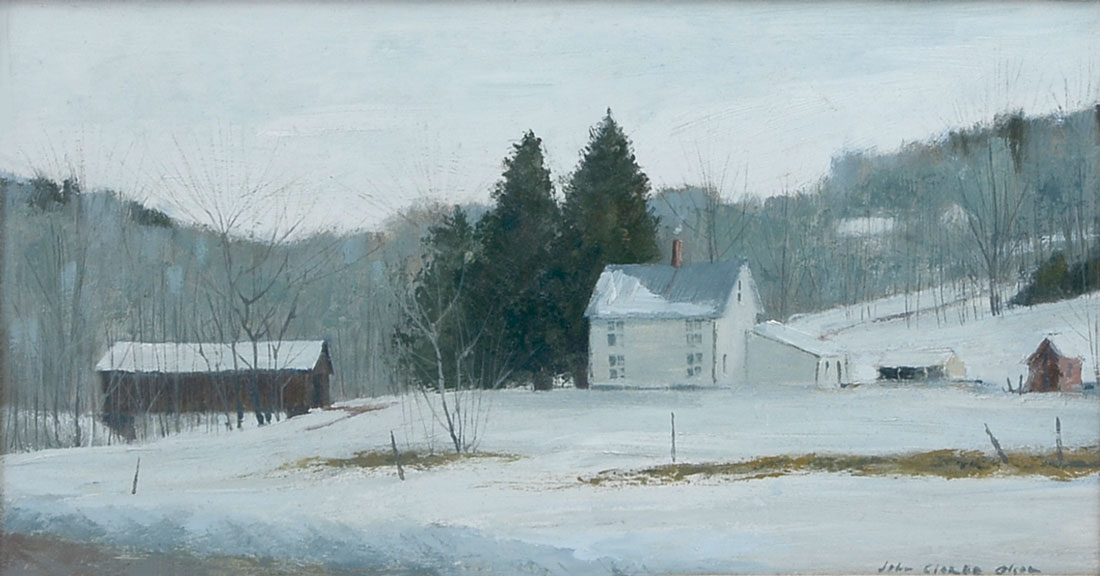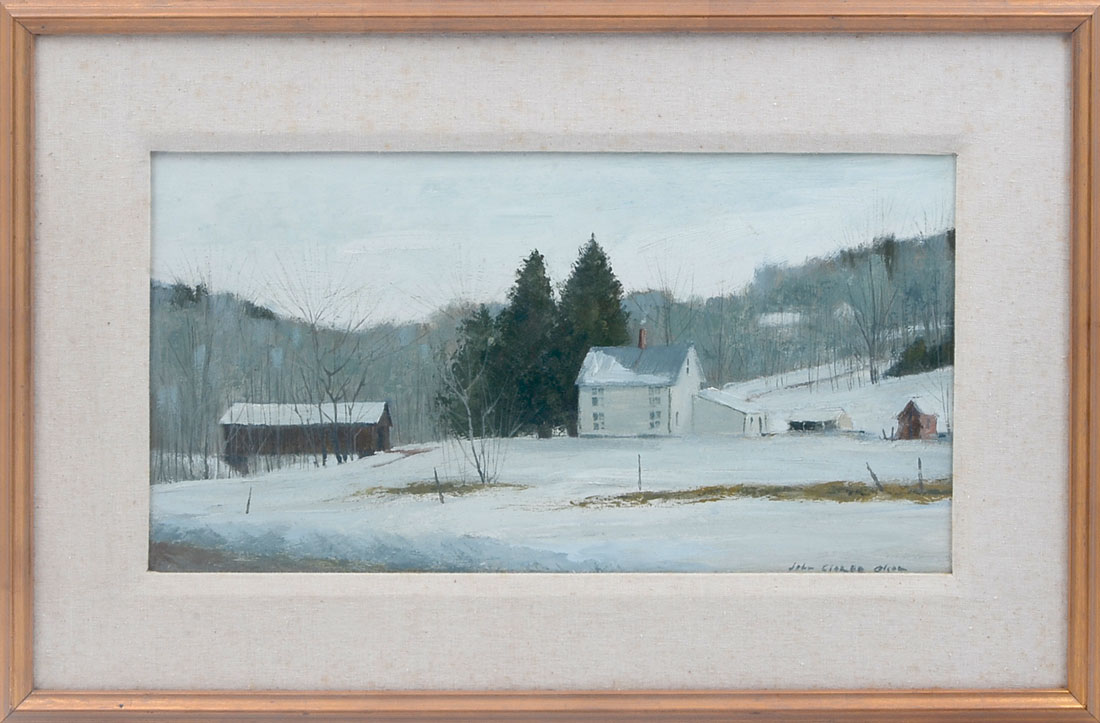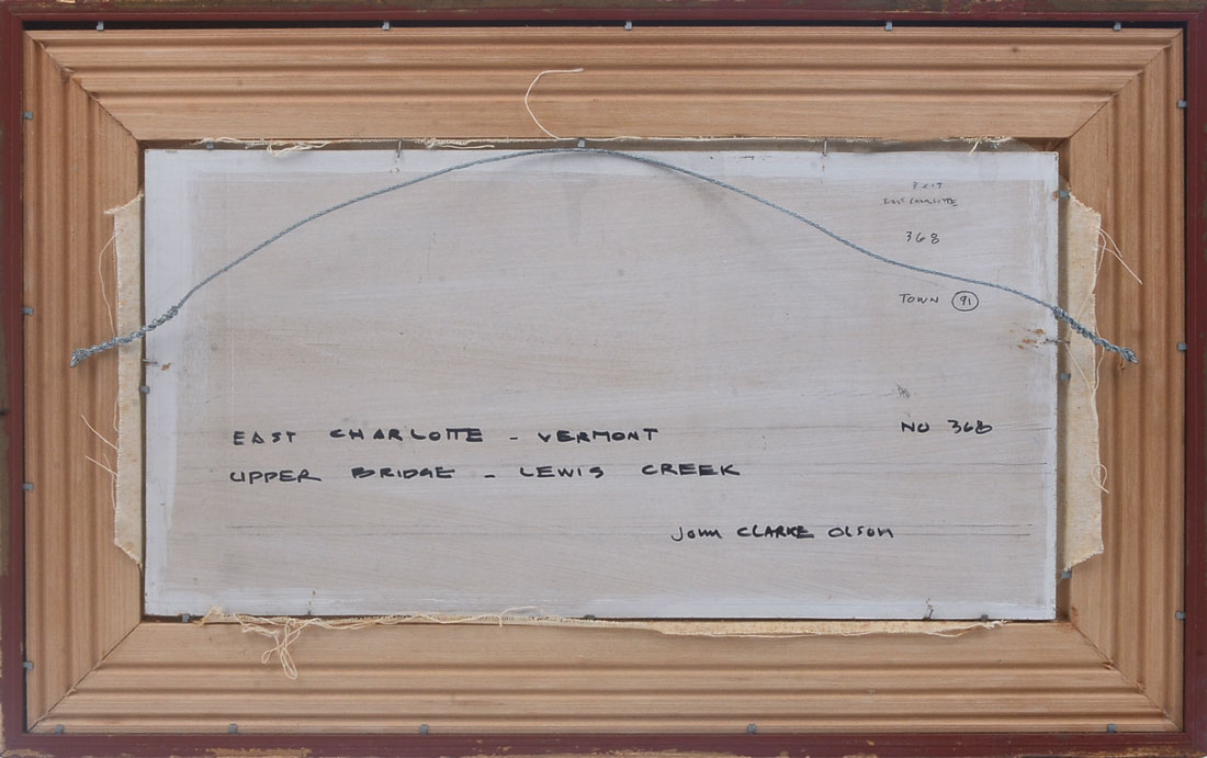 OLSON, John Clarke, (American, 20th C.): ''East Charlotte - Vermont, Upper Bridge - Lewis Creek'', Oil/Board, 9'' x 16.75'', signed lower right, signed and titled verso, # 368, framed, 14.5'' x 22.5''.