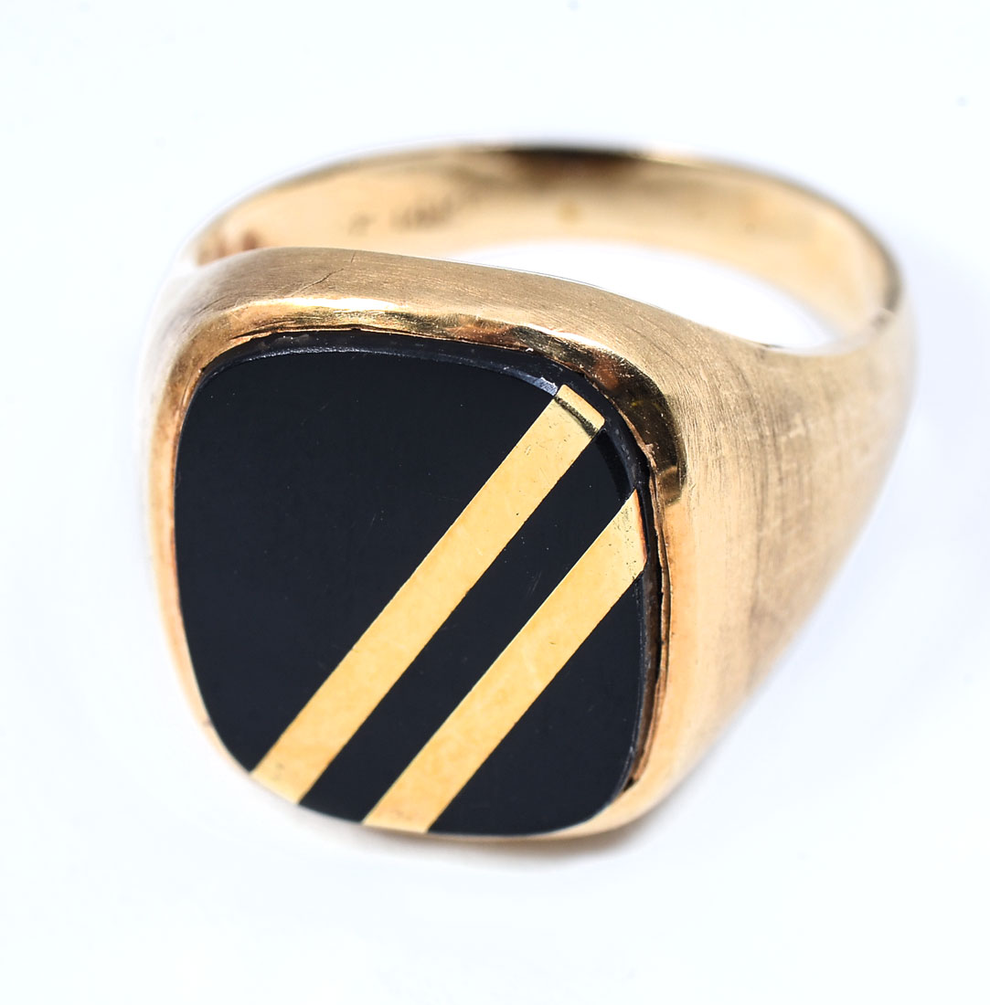 HANDSOME 14K ONYX MENS RING: 14K yellow gold ring One 15.00 x 13.00 mm onyx tablet with inlaid gold bars. The onyx is bezel set. Weight: 7.8 grams. Size: 9.5