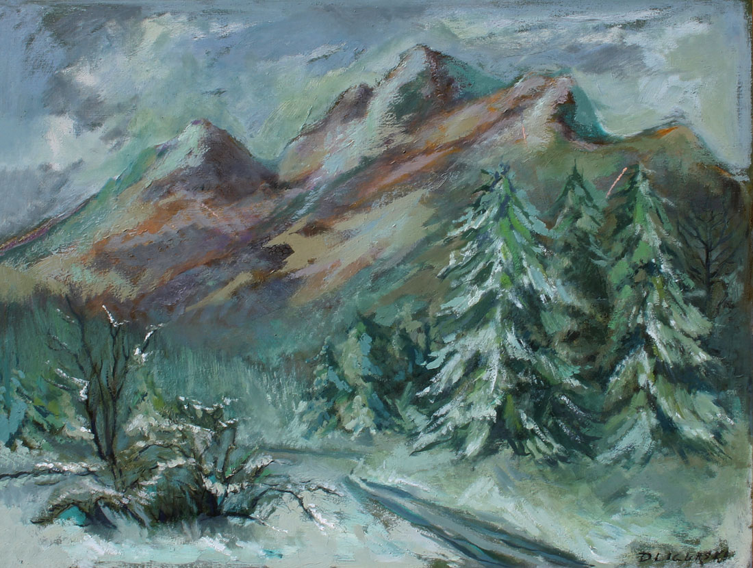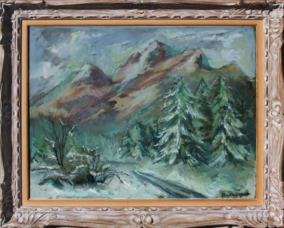 DZIGURSKI, Alexander, (American, 1911-1995): Snowy Landscape in the Mountains, Oil/Canvas, 24'' x 30'', signed lower right, Wally Findlay Galleries label verso, original carved frame, 31.5'' x 37''. CONDITION: Several abrasions with loss, sold as is.