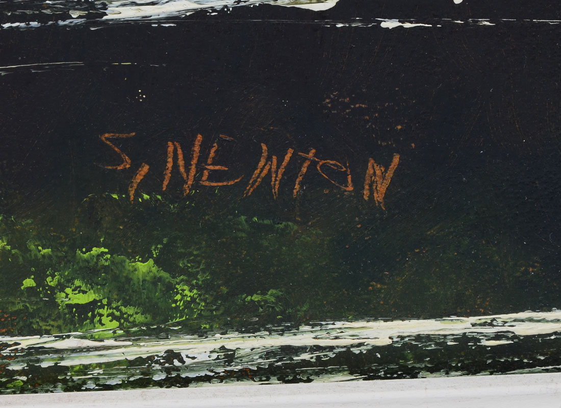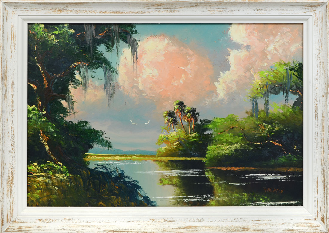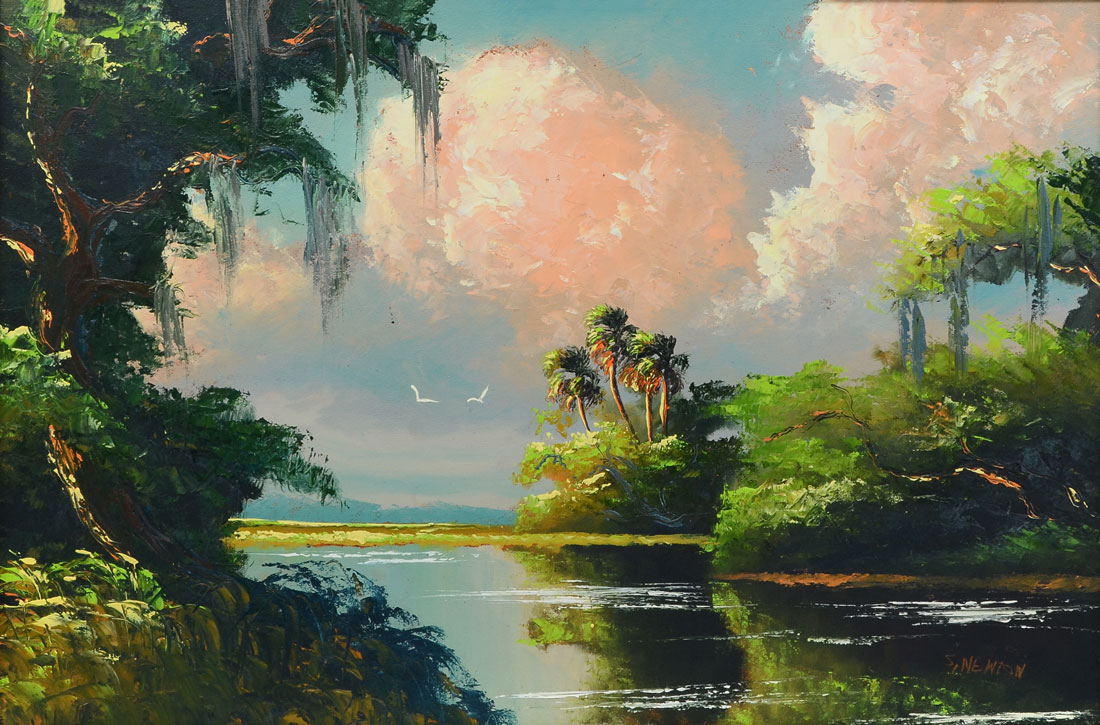 NEWTON, Sam, (American, 20th Century): Florida Highwaymen St. Lucie River scene, Oil/ Upson, signed lower right, 24'' x 36'', framed 28 3/4'' x 40 1/2''.
