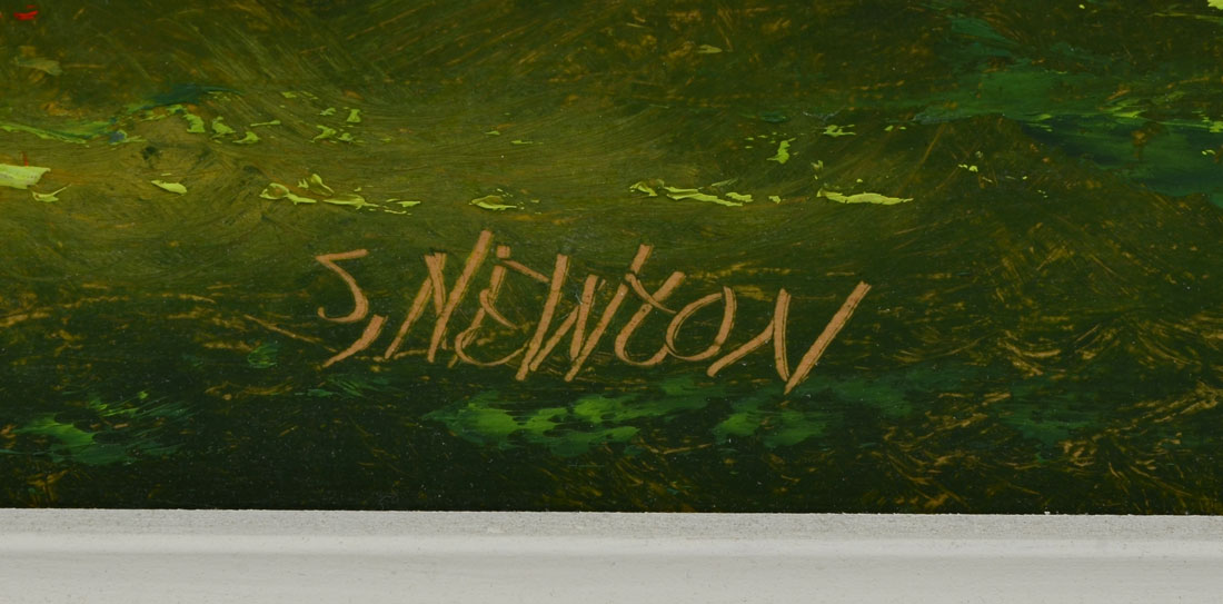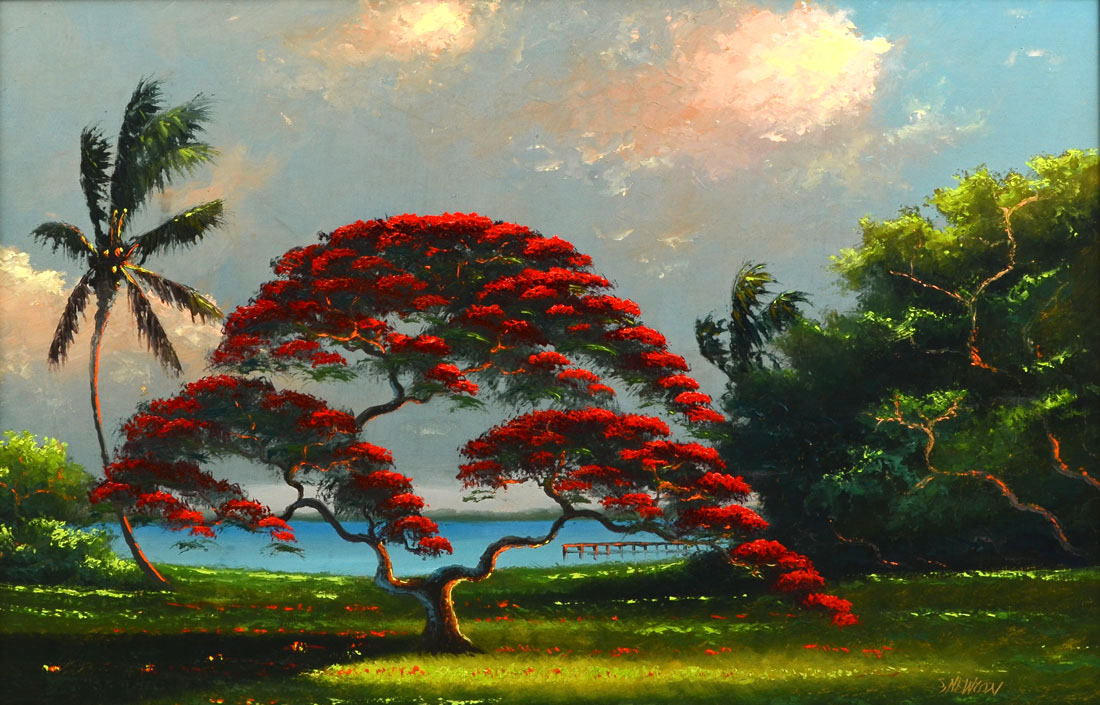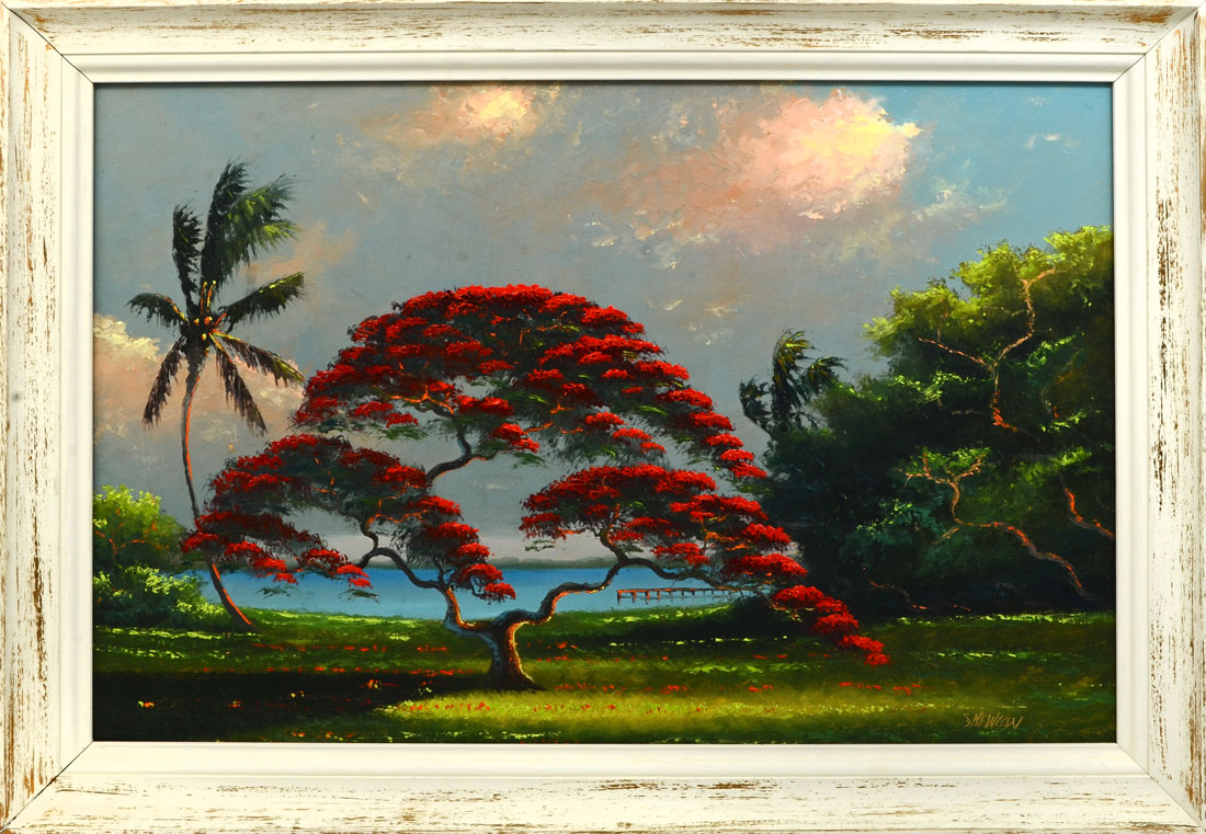 NEWTON, Sam, (American, 20th Century): Florida Highwaymen Royal Poinciana at waters edge, Oil/Upson, signed lower right, 24'' x 36'', framed 29 x 40 1/2''.