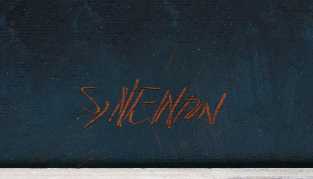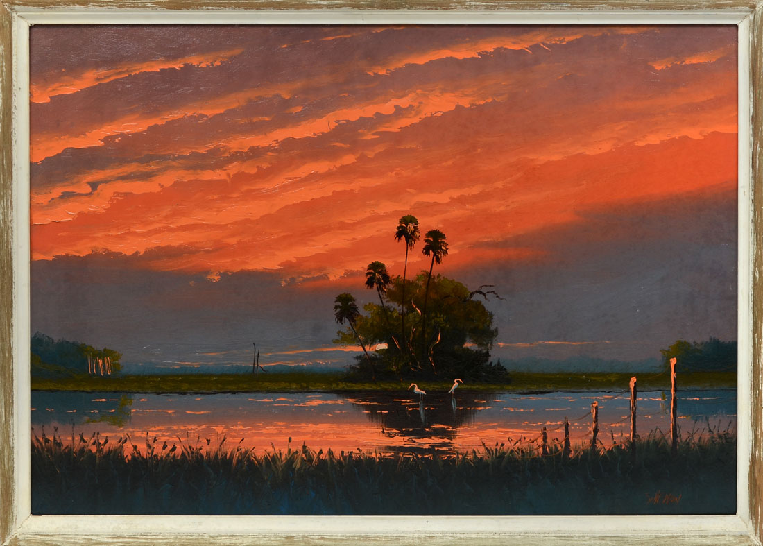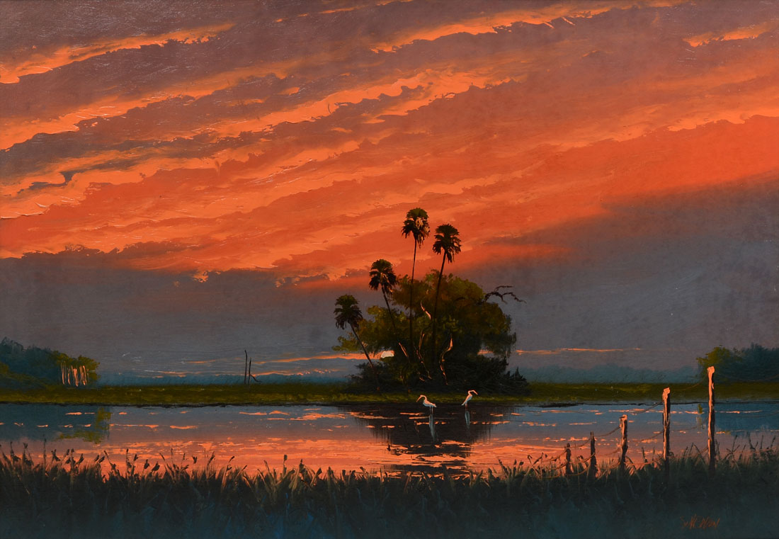 NEWTON, Sam, (American, 20th Century): Florida Highwaymen fire sky backwater scene with stand of trees and birds, signed lower right, Oil/Upson, signed lower right, 24'' x 36'', framed 25 1/2'' x 37 1/2''.