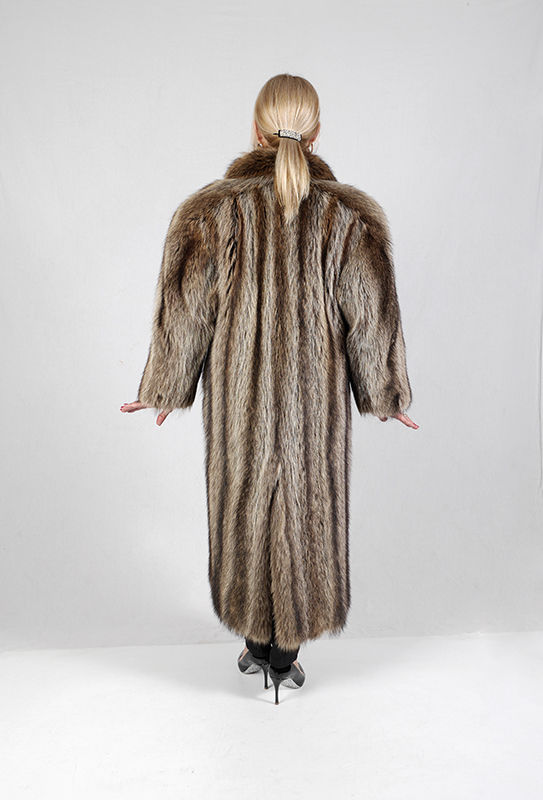 FLOOR-LENGTH RACOON COAT: Fully lined, cleaned and glazed. Made in Canada label. Approximate measurements: 28'' from neck to sleeve cuff/hem, 17'' across back and 49'' length from neck to hem. Approx size 10.