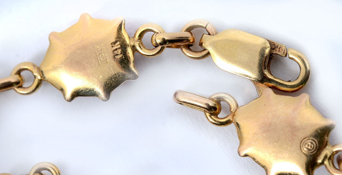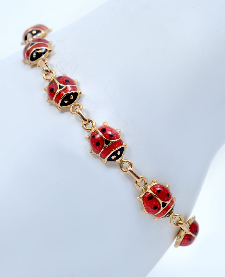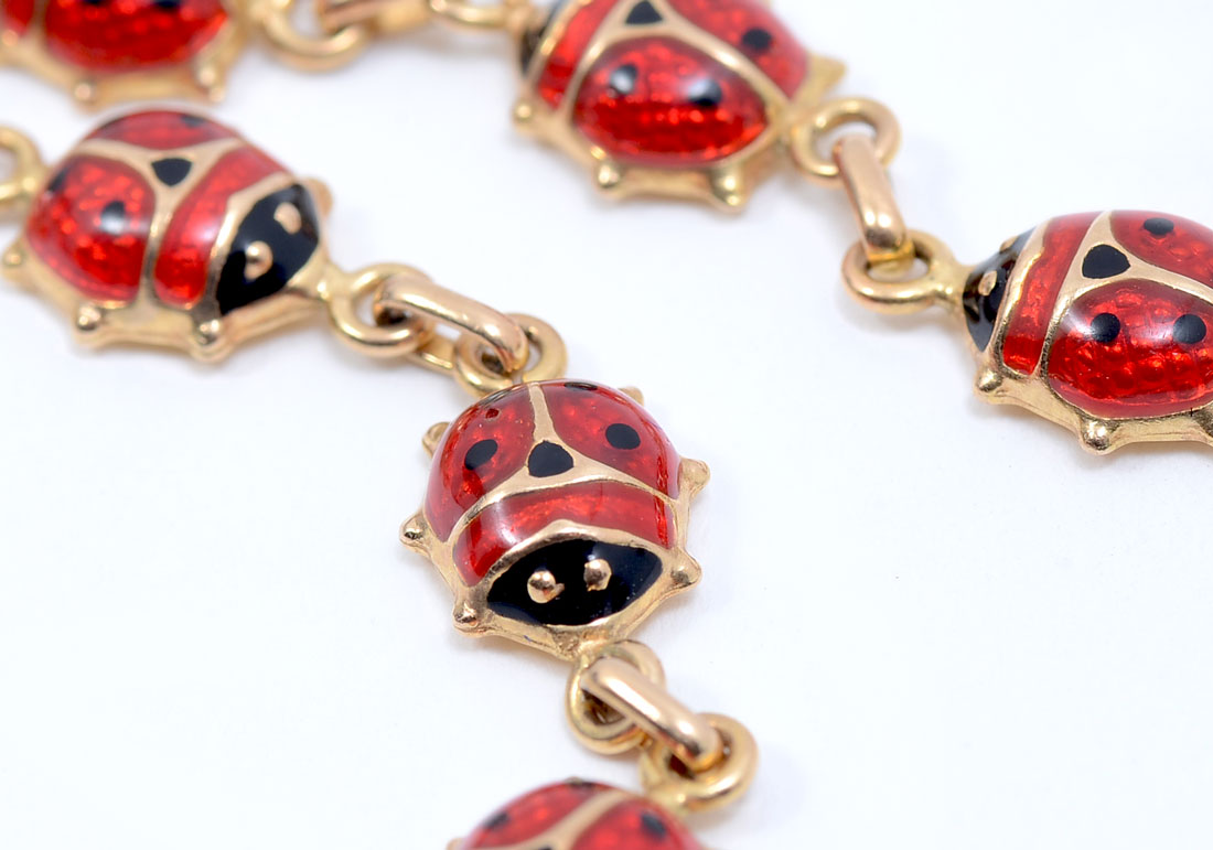 14K ITALIAN ENAMEL LADYBUG BRACELET: Shiny red and black ladybugs form the links of this adorable bracelet! Crafted of yellow gold and enamel, this piece is fun and funky. Presentation box may be original.