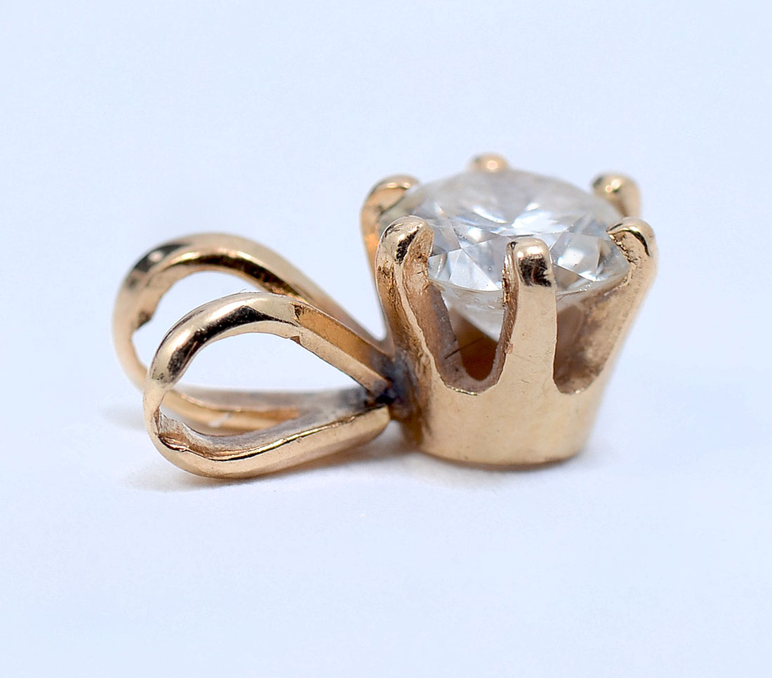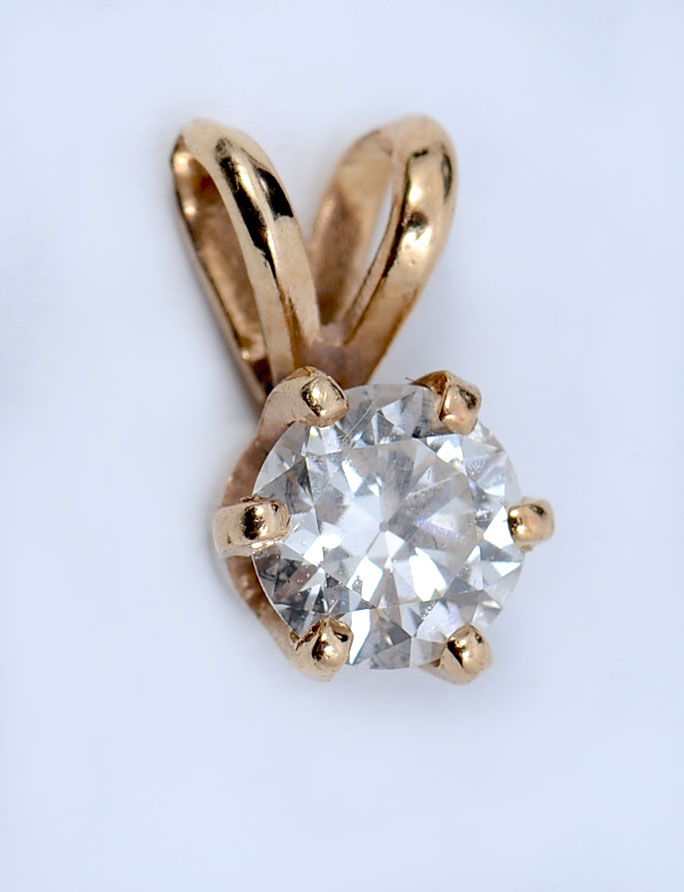 14K 1/4 CT DIAMOND PENDANT: 14K yellow gold ring contains one round brilliant cut diamond. WEIGHT: .25 Ct. Approx. Rated VS1 in clarity and H in color. The diamond is prong set. Weight: 0.3 grams.