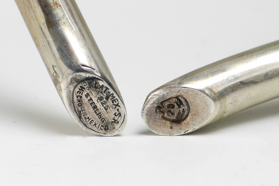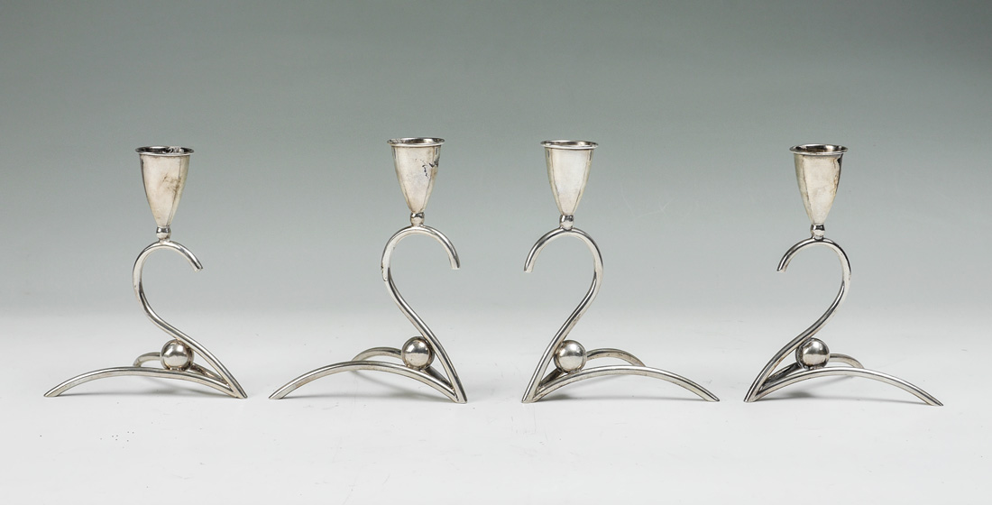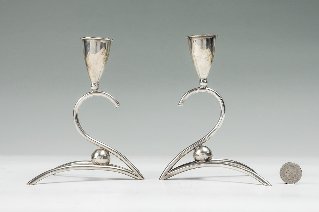 4 PLAT-MEX SA MEXICAN STERLING CANDLESTICKS: Stylized mid century single light candlesticks by Plat-Mex S.A., 6 1/4'' h. x 4 3/4'' x 3 3/4'', approx. 11.1 troy oz.