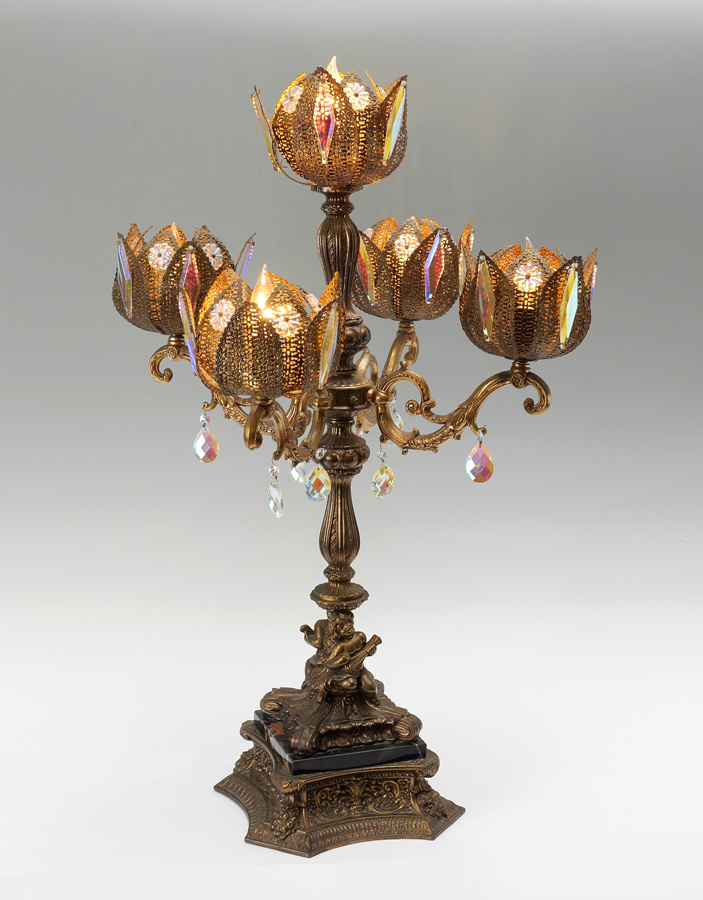 UNIQUE MID CENTURY PIERCED METAL AND CHERUB LAMP: Gold decorated cast metal and marble base with figural cherub musicians. 4 arm and center light with pierced metal floriform shades, applied iridescent crystals and prism drops, 37'' h. x 24''.