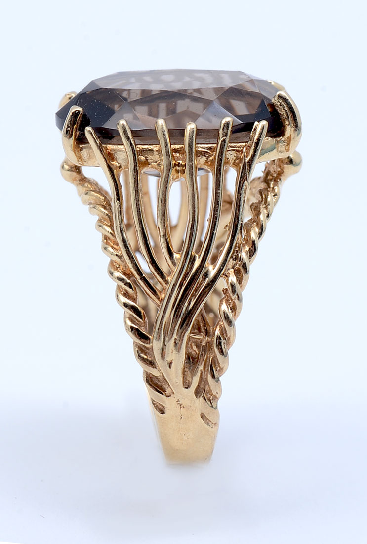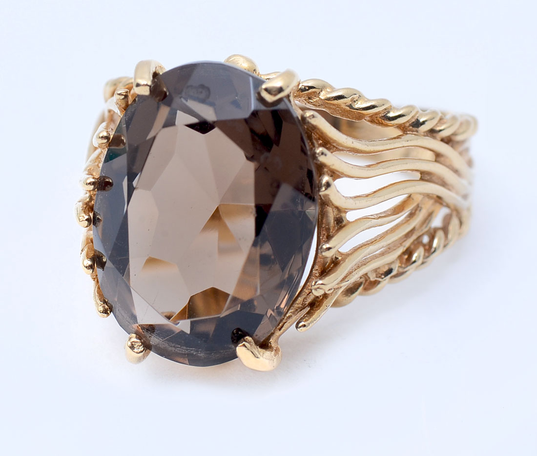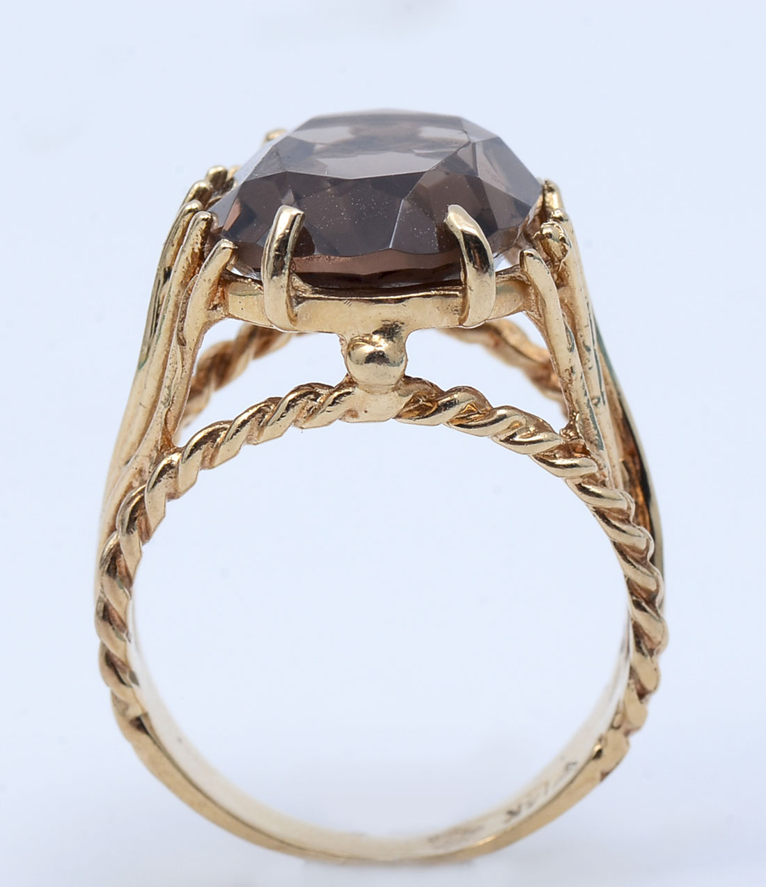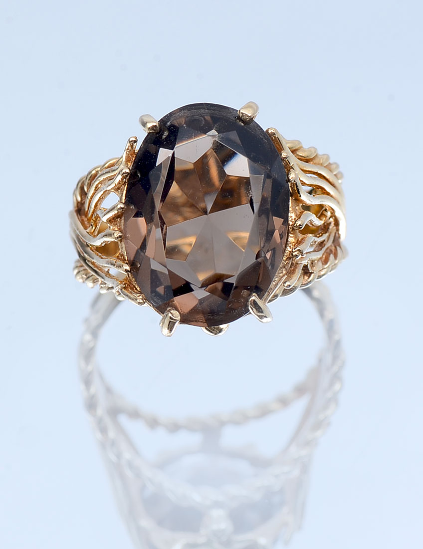 14K 7.50 CT. SMOKY QUARTZ RING: 14K yellow gold ring contains one oval faceted smoky quartz. WEIGHT: 7.50 Ct. Approx. The quartz is prong set. Weight: 6.3 grams. Size: 7.5