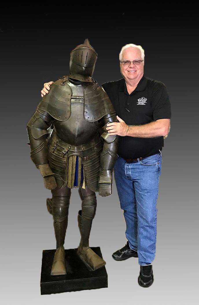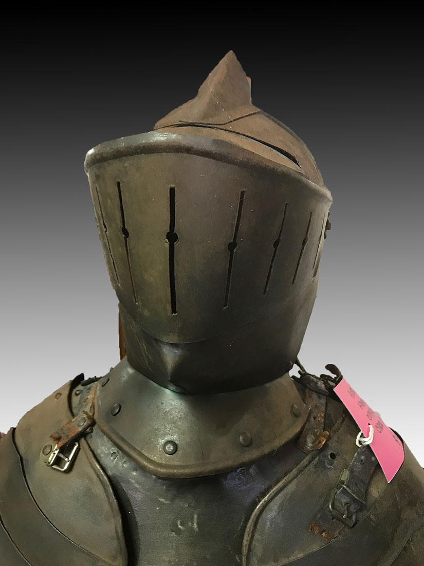 MEDIEVAL STYLE LIFE SIZE SUIT OF ARMOR: Victorian era suit of armor mounted on wood base, overall 72'' h. x 28'' x 16''.