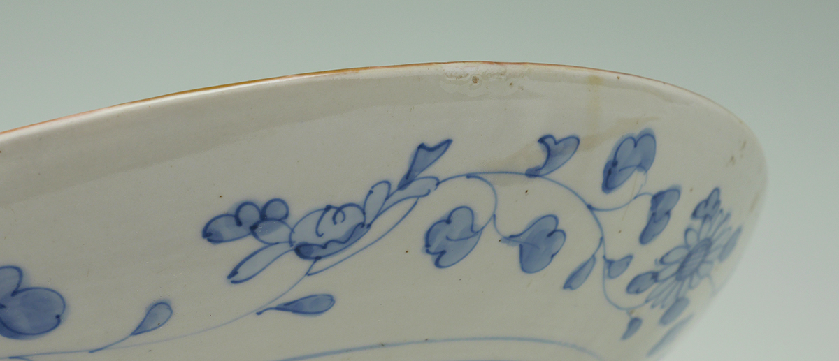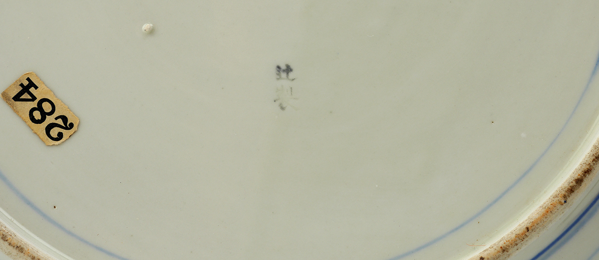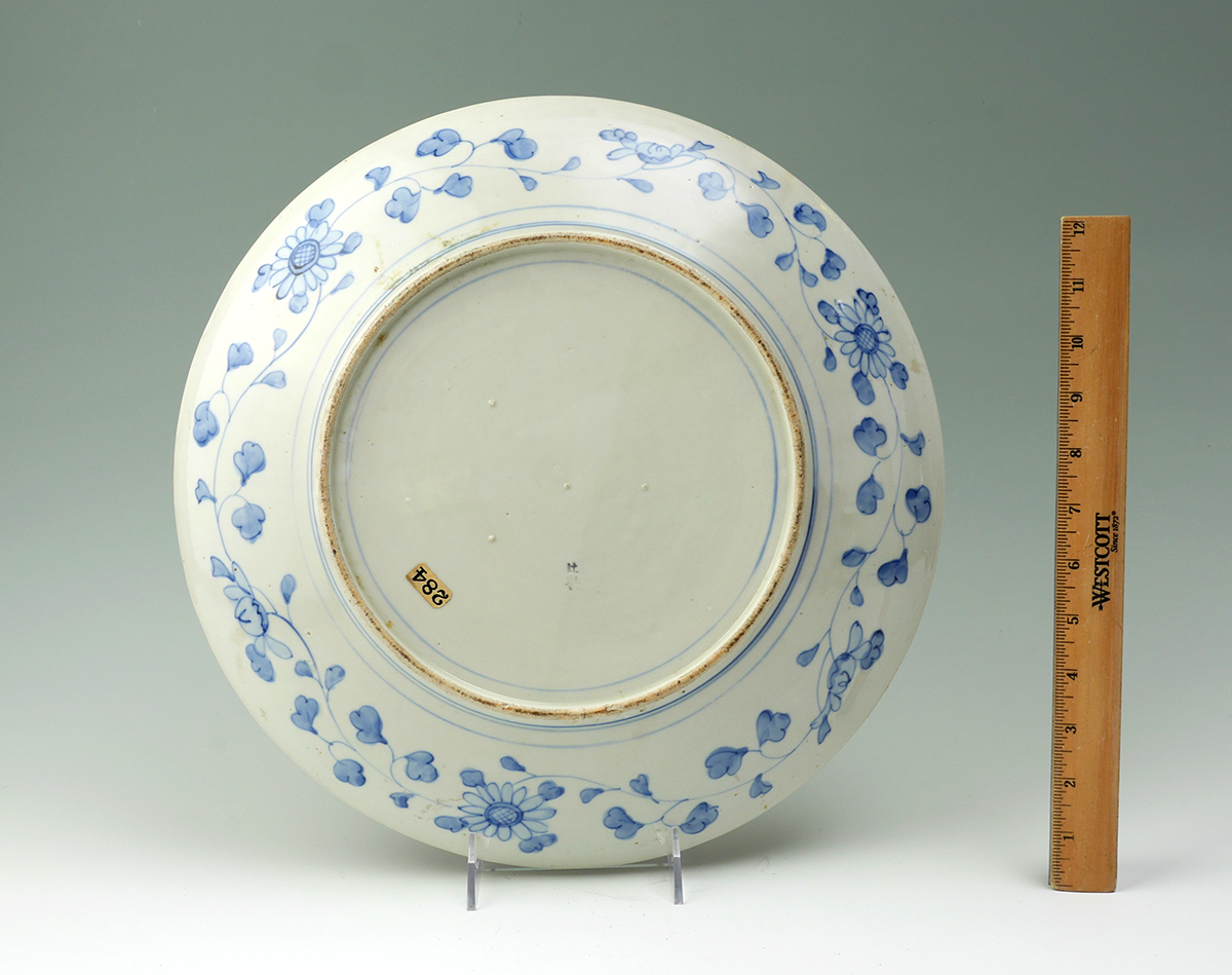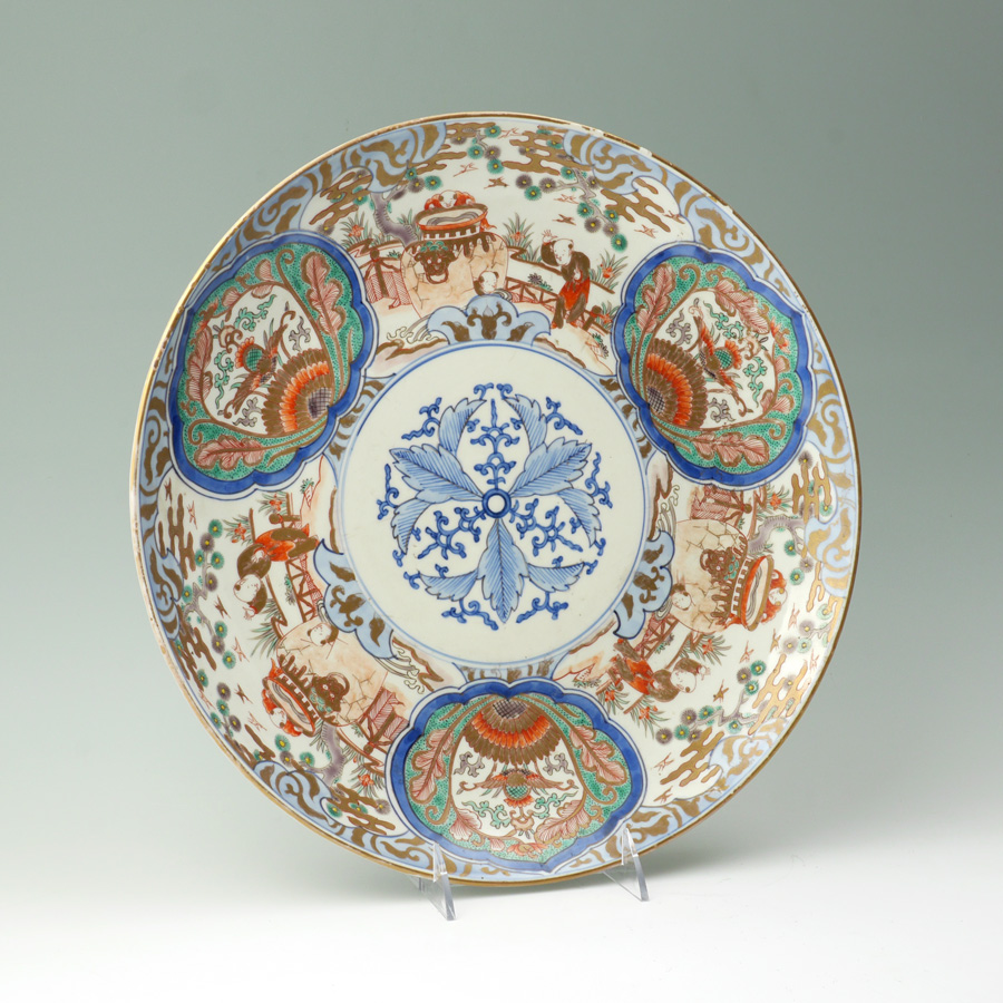 JAPANESE IMARI CHARGER: Blue and white center foliate medallion, rim with polychrome genre scenes, signed on back. 14 1/2'' dia.
