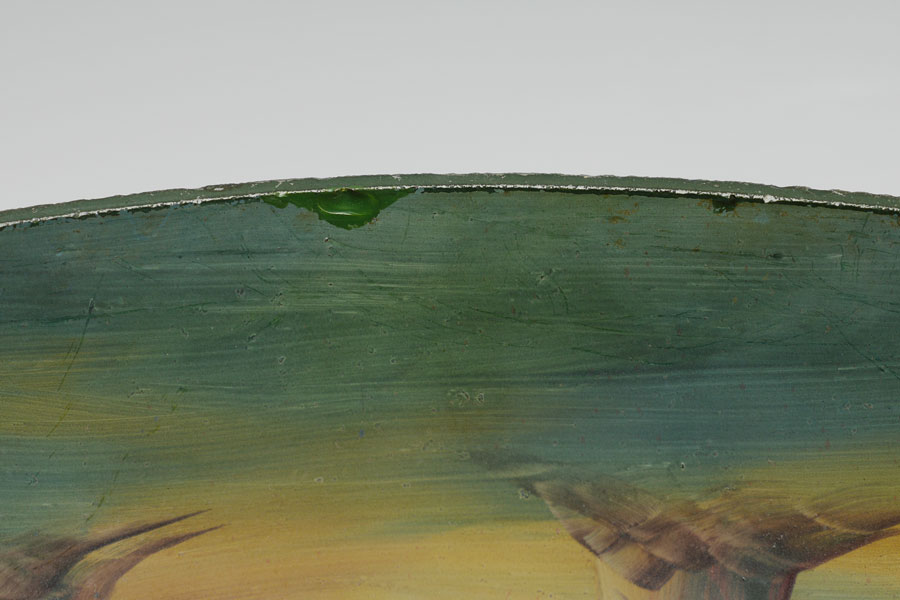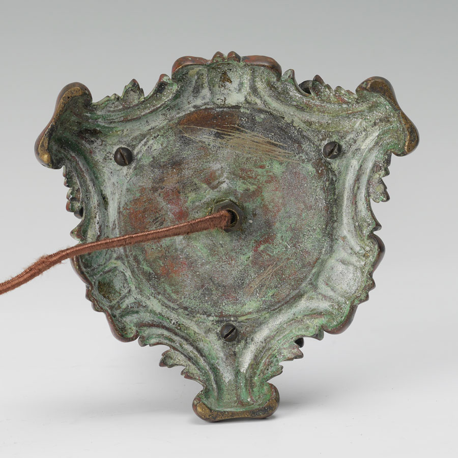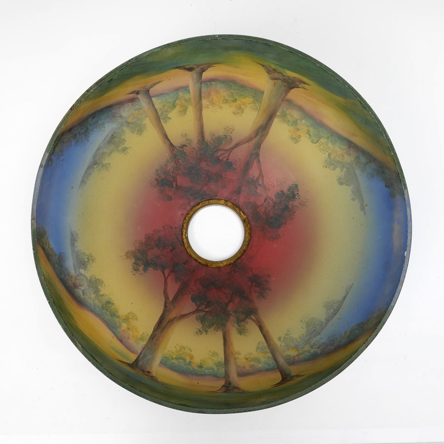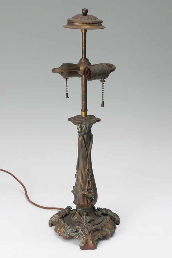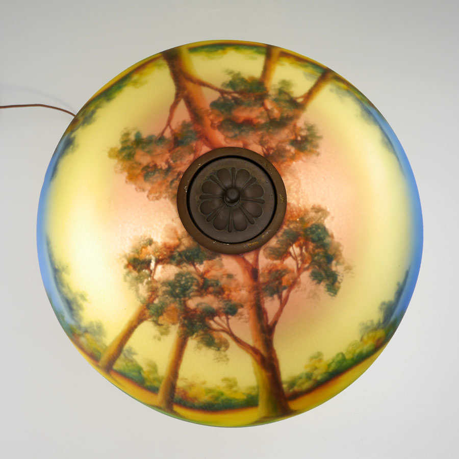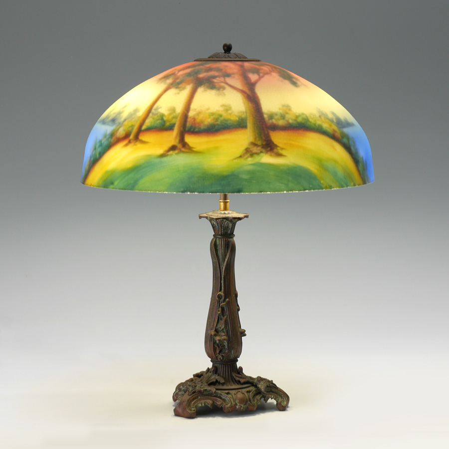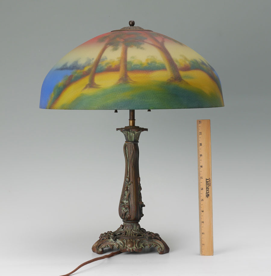 REVERSE PAINTED CHIPPED ICE TABLE LAMP: Patinated cast bronze base with foliates motifs, double socket fixture, 21'' h. x 7 1/4'' dia. Reverse painted shade with landscape motif, chipped ice exterior, 7'' h. x 17'', 3'' aperture.