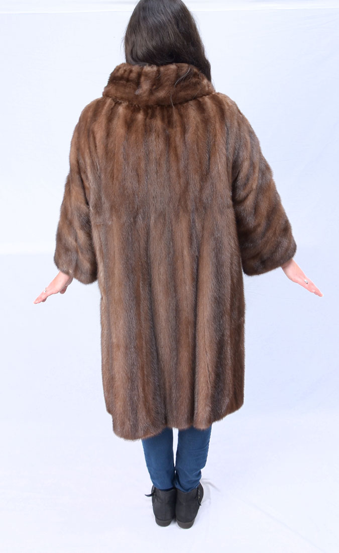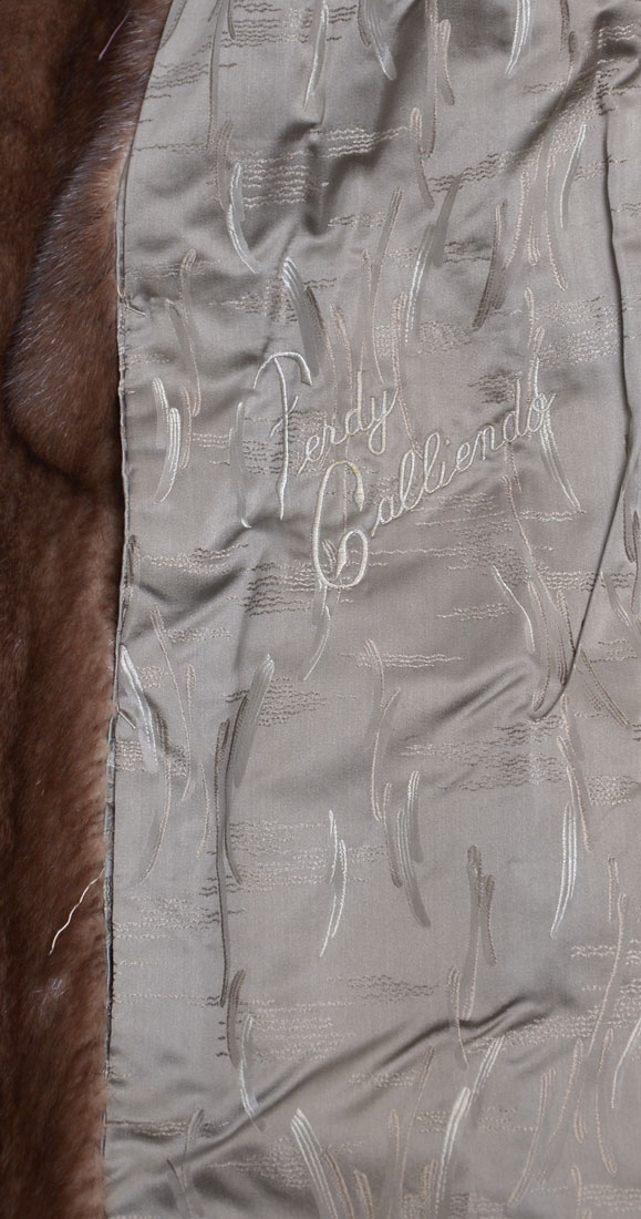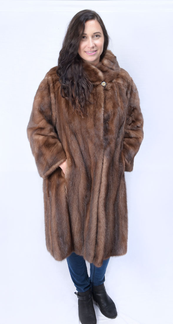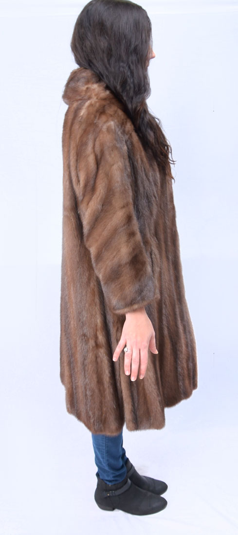 VINTAGE MEDIUM BROWN MINK COAT: Classic mink coat approx size 4. Name stitched in lovely satin lining. 1 button closure at neck. 2 front side slit pockets. In very good condition.