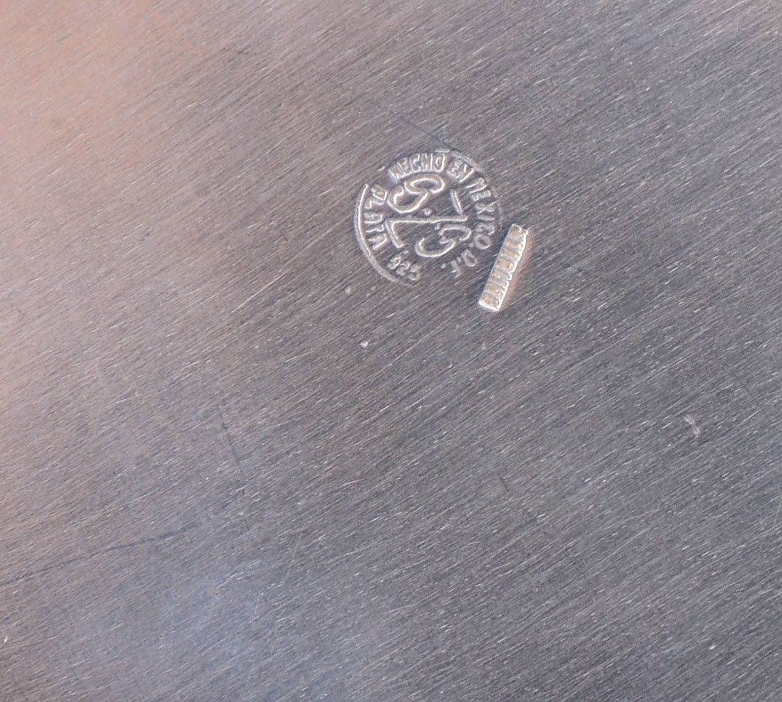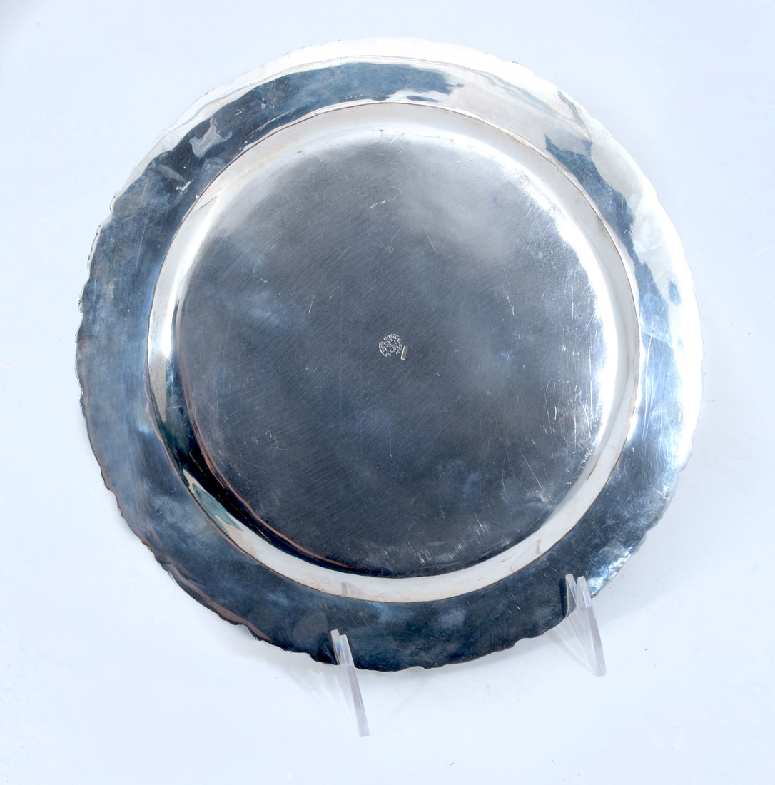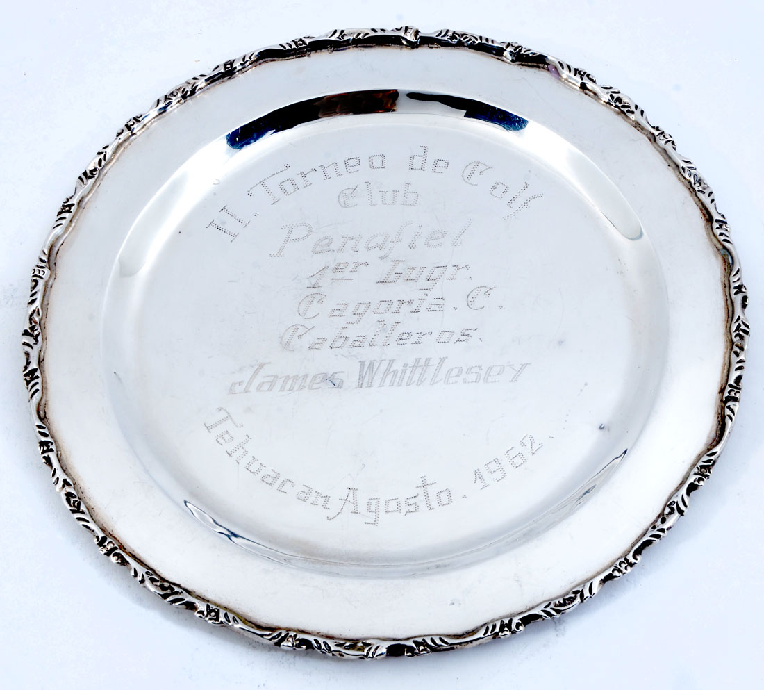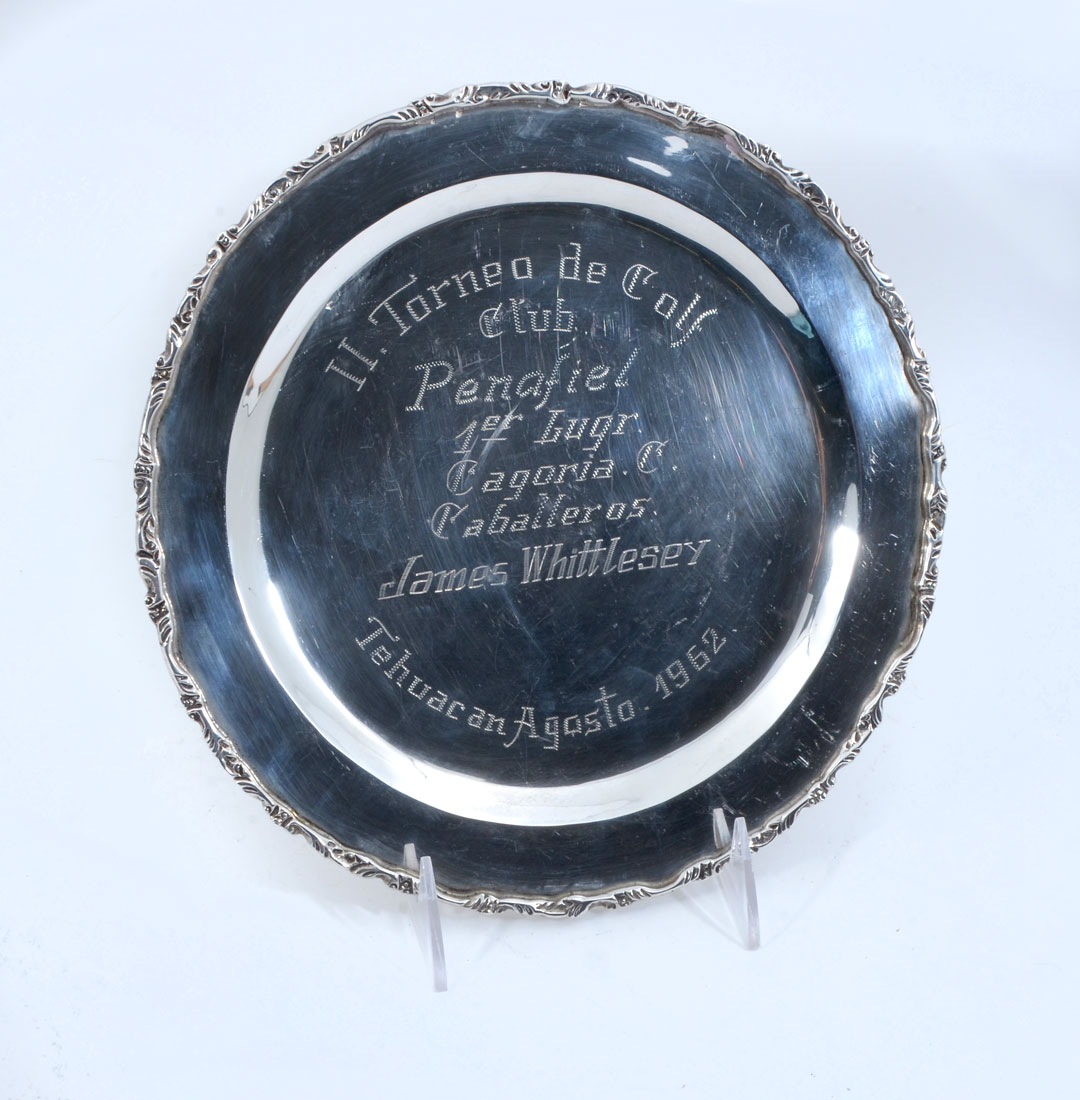 MEXICAN STERLING GOLF PRESENTATION TRAY: Mexican sterling silver tray with golf dedication dated 1961, embossed rim, 9 1/2'' dia., approx. 14.2 troy oz.