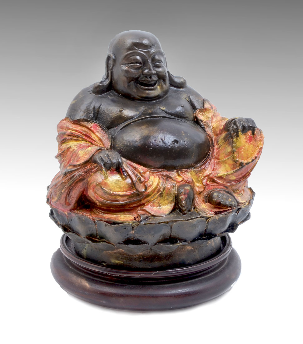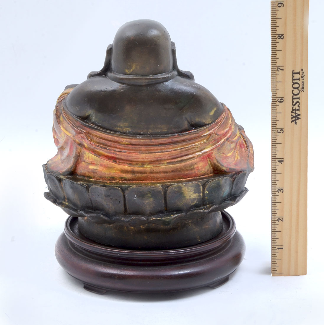 CHINESE BRONZE SEATED LAUGHING BUDDHA FIGURE: Polychrome paint decorated figure of the Laughing Buddha or Hotei seated on a lotus blossom, 7'' h. x 7 1/4''. Sold with a wood stand, actual age unknown.