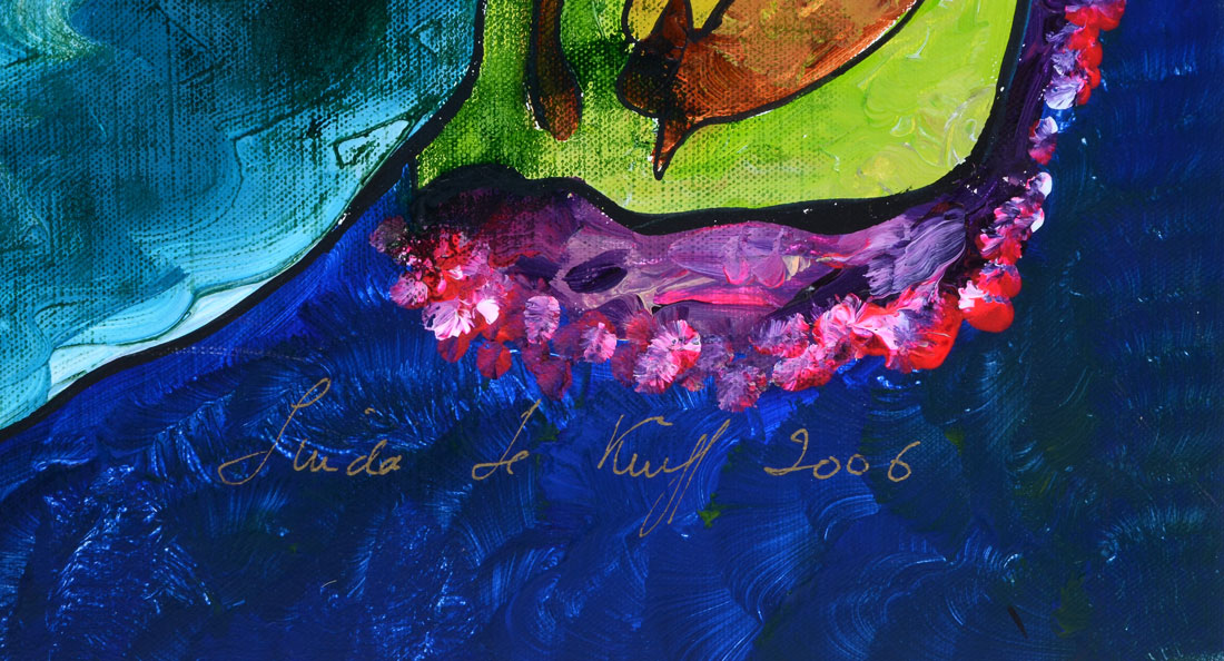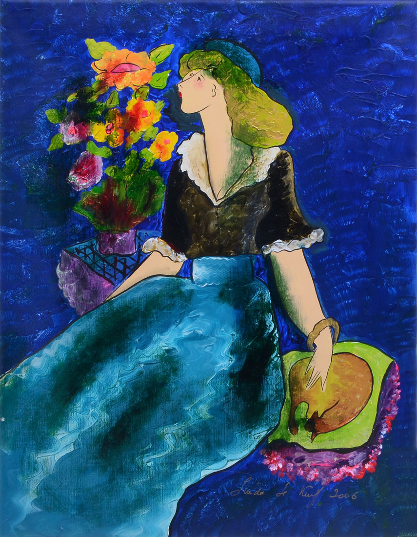 LE KINFF, Linda, (French, 1949-): ''Afternoon with Holly'', Seated Blonde Woman with Cat and Floral Bouquet, Acrylic/Canvas, 25'' x 19'', signed lower right and dated 2006, titled on the stretcher verso, unframed.