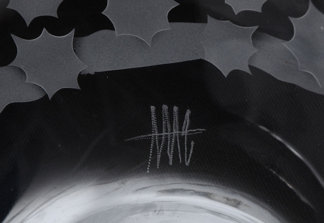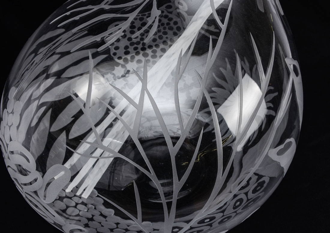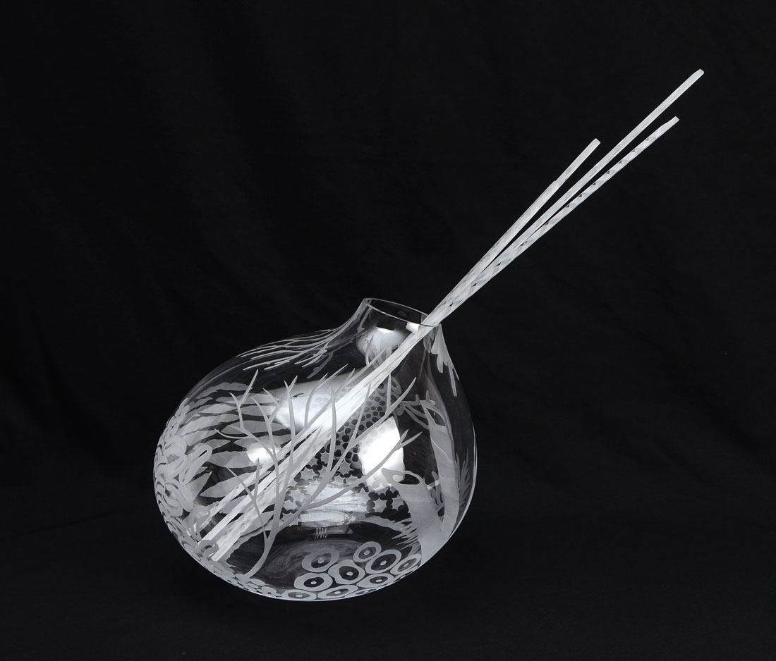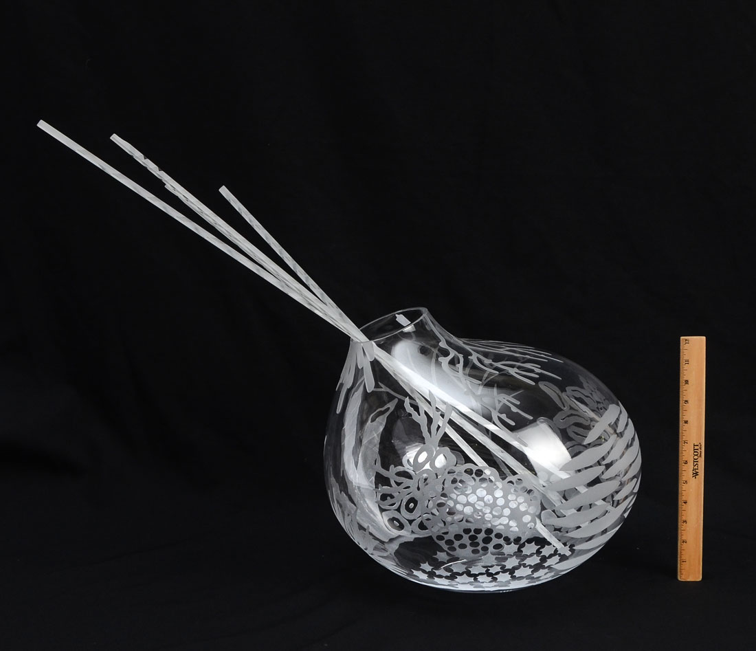 LARGE CONTEMPORARY ETCHED ART GLASS VASE: Bulbous free form shape, etched stylized sticks and foliate designs, signed SAM? on base, measures 14'' h. x 15''. Sold with 4 frosted and etched glass rods, longest 33 3/4''.