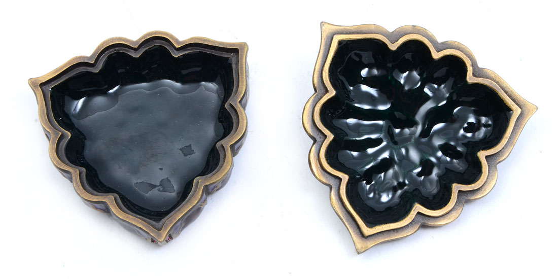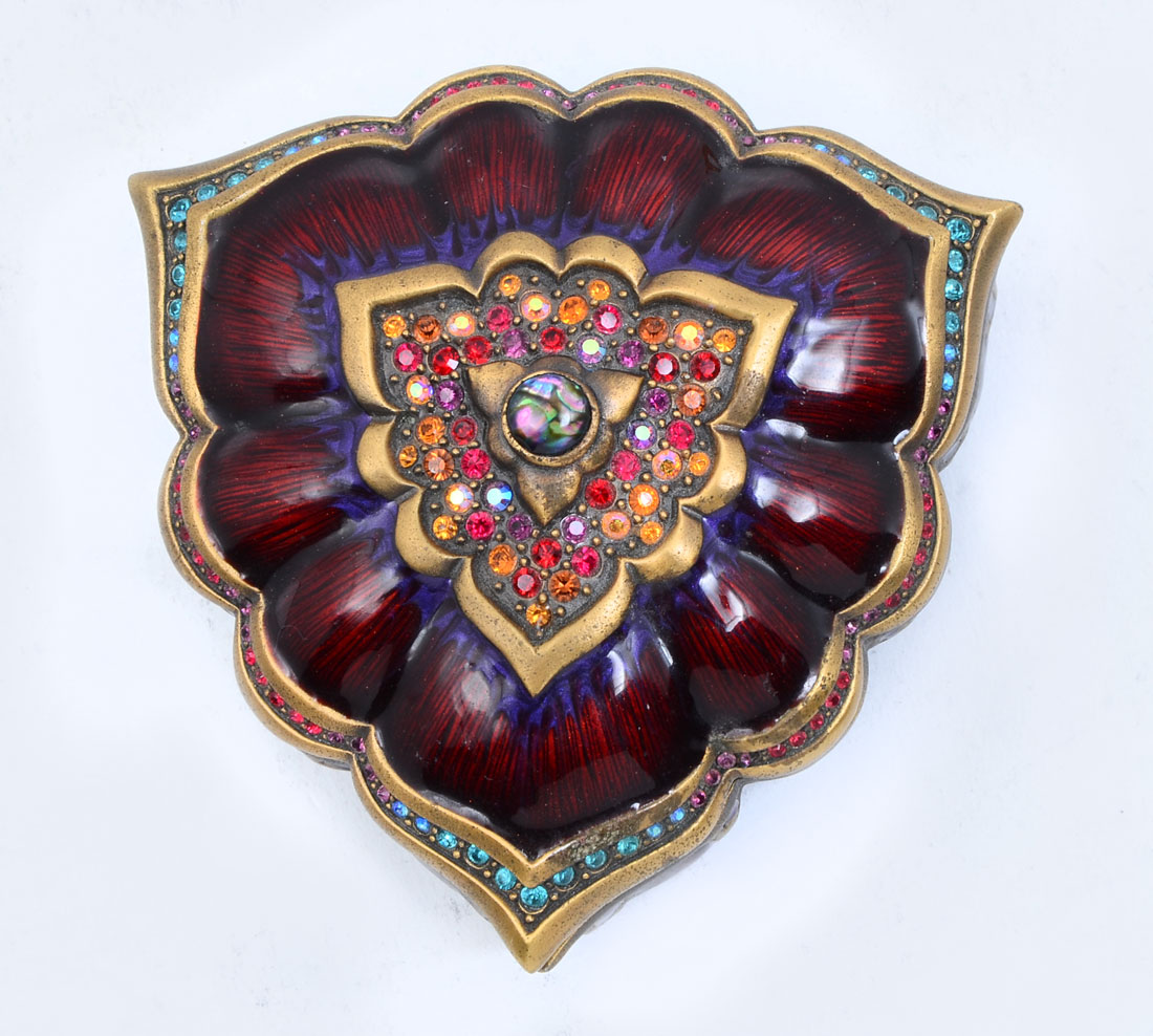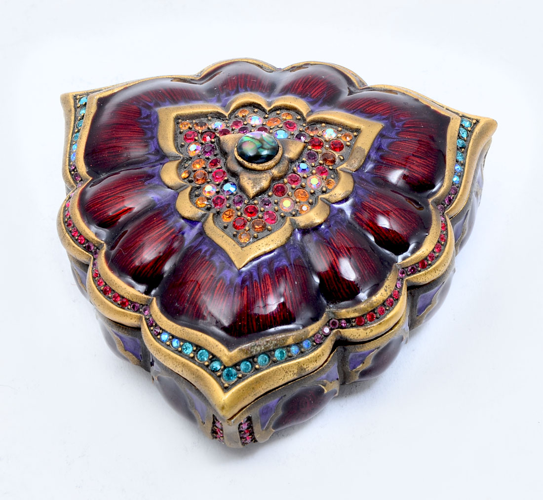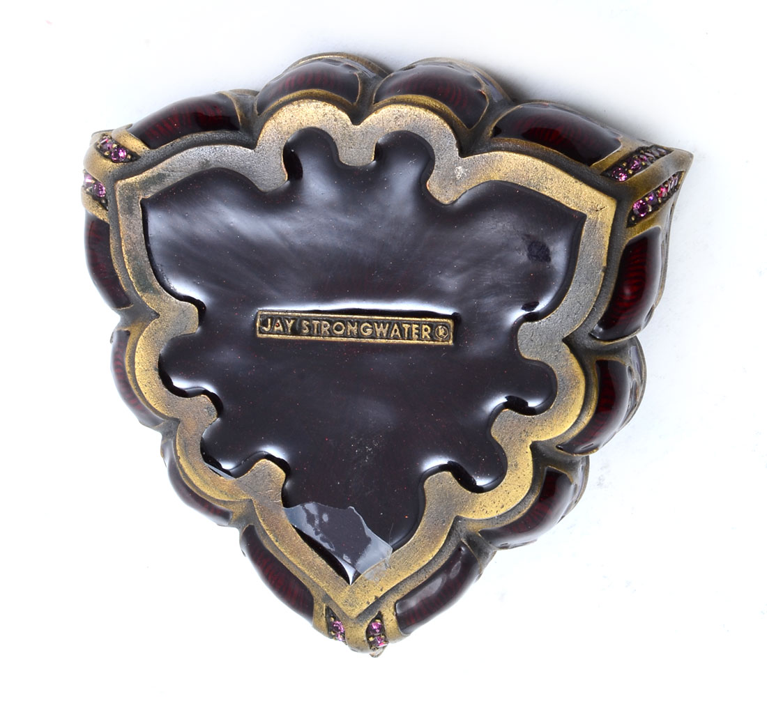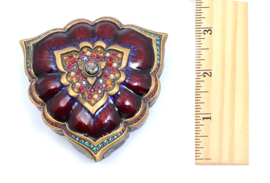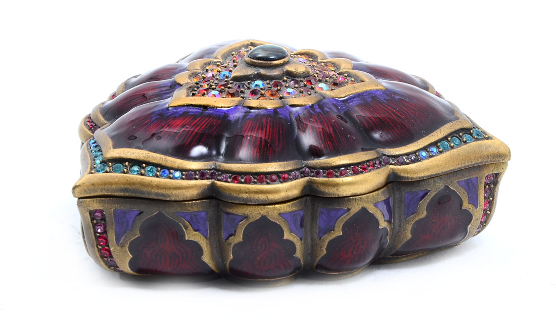 JAY STRONGWATER ENAMEL COVERED TRINKET BOX: Polychrome enamel and affixed ''jewels'' on stylized floriform bronze box, marked Jay Strongwater on base, 1 1/4'' h. x 3 1/4''.