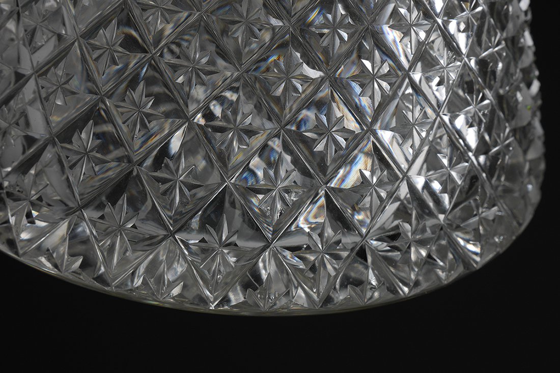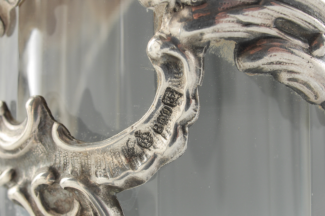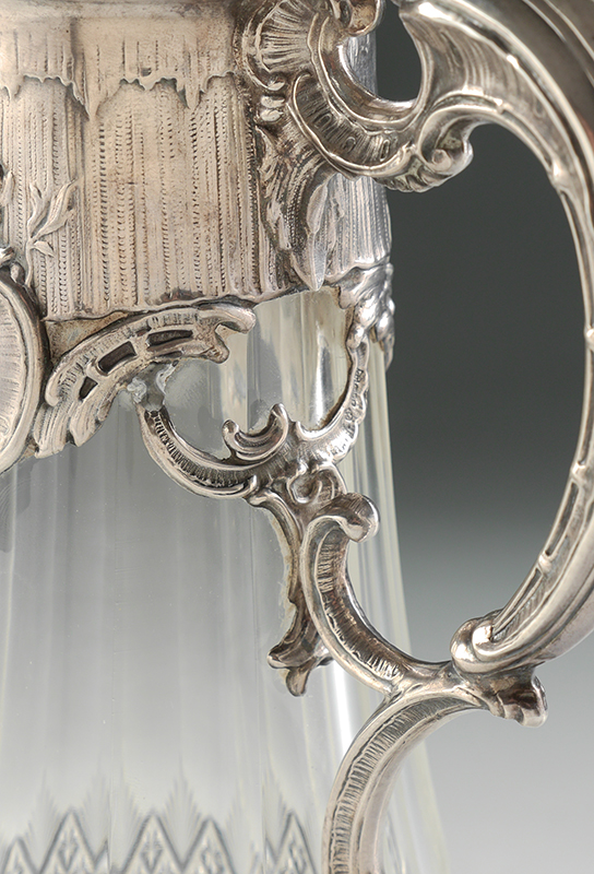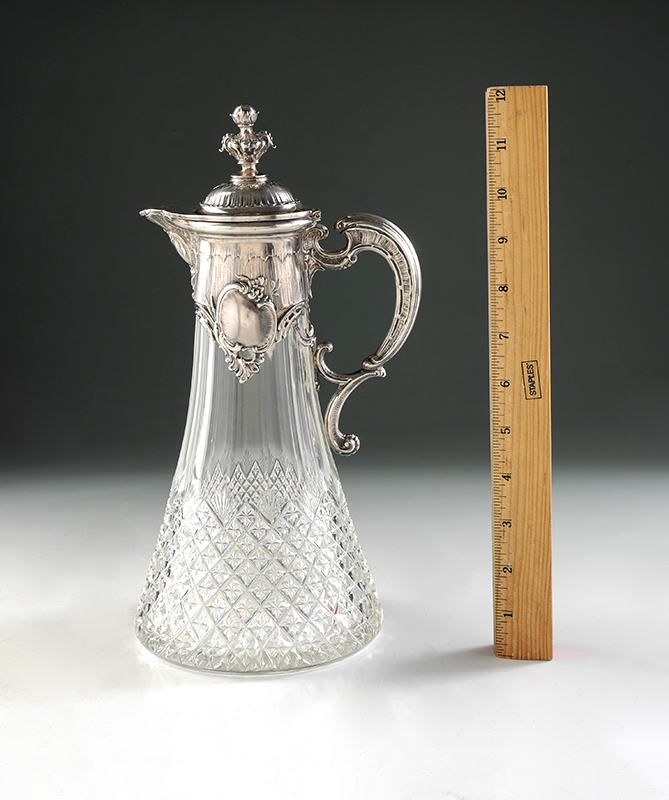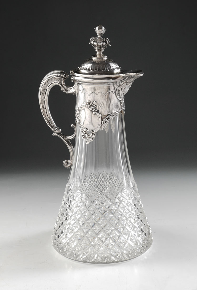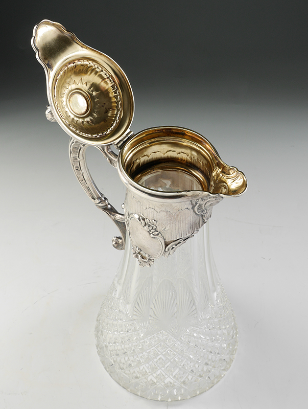 GERMAN .800 SILVER MOUNTED CUT GLASS CLARET JUG: Embossed German .800 silver hinged lid, collar and handle, unmarked tapered cut glass body. Silver with illegible makers hallmark, overall measures 11 3/4'' h. x 6''.