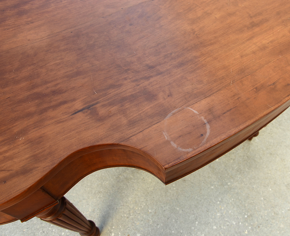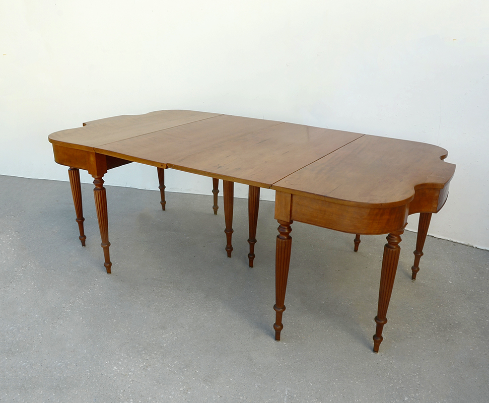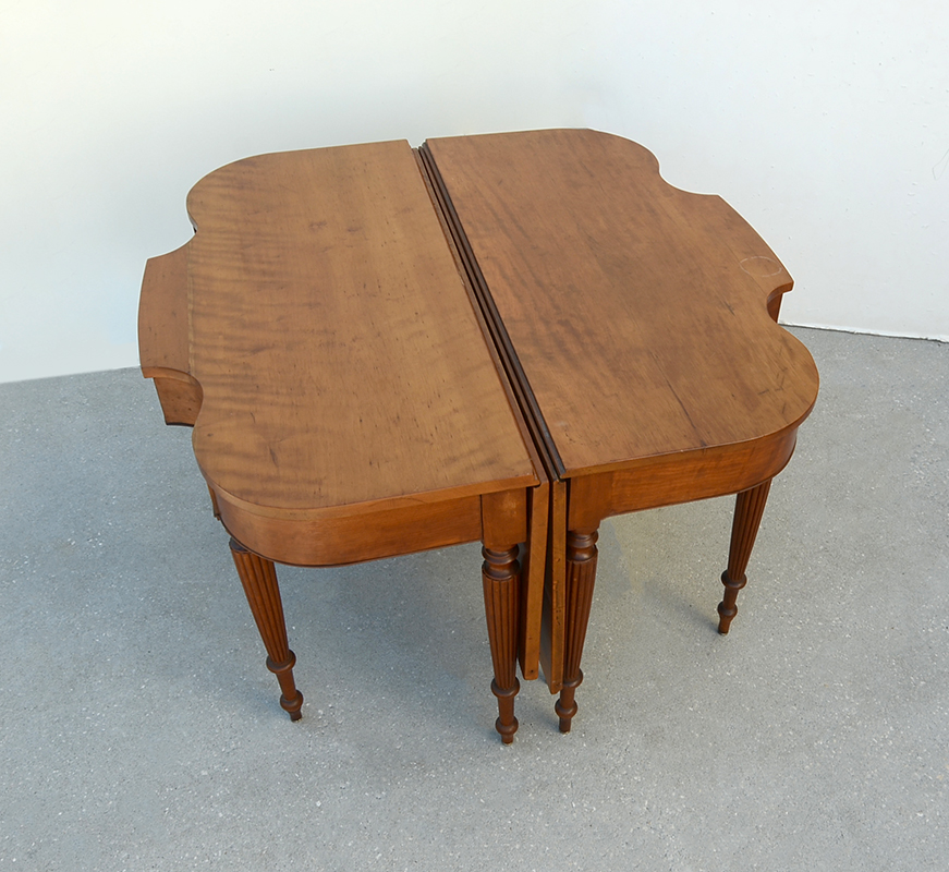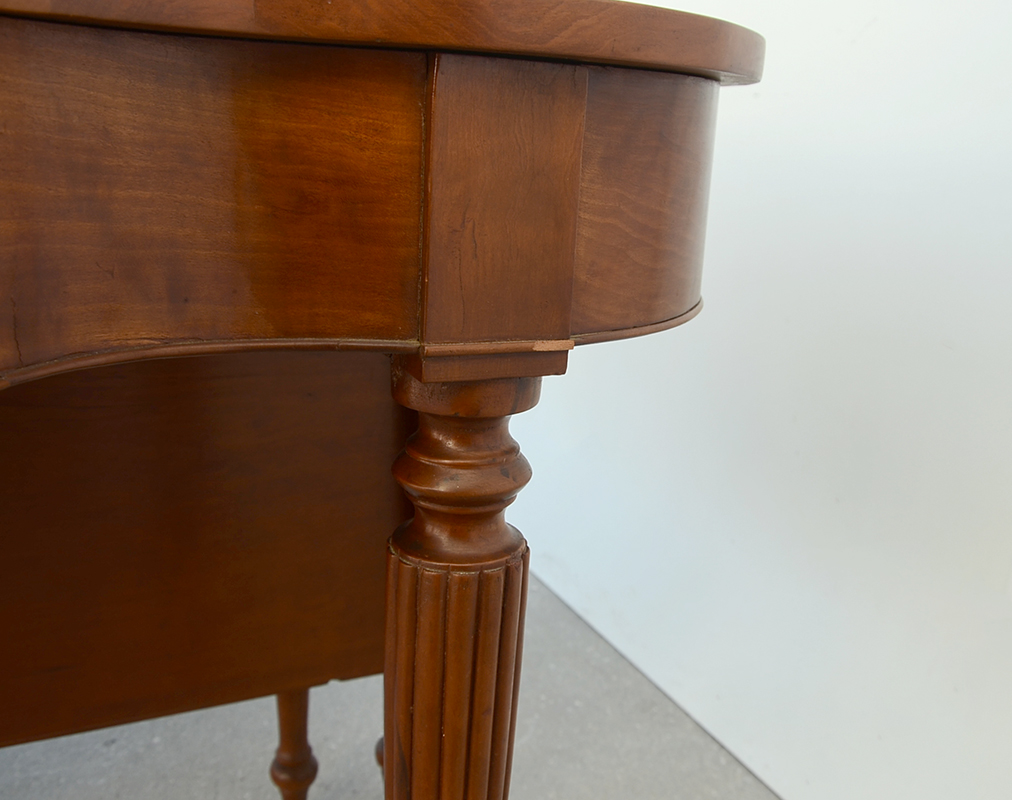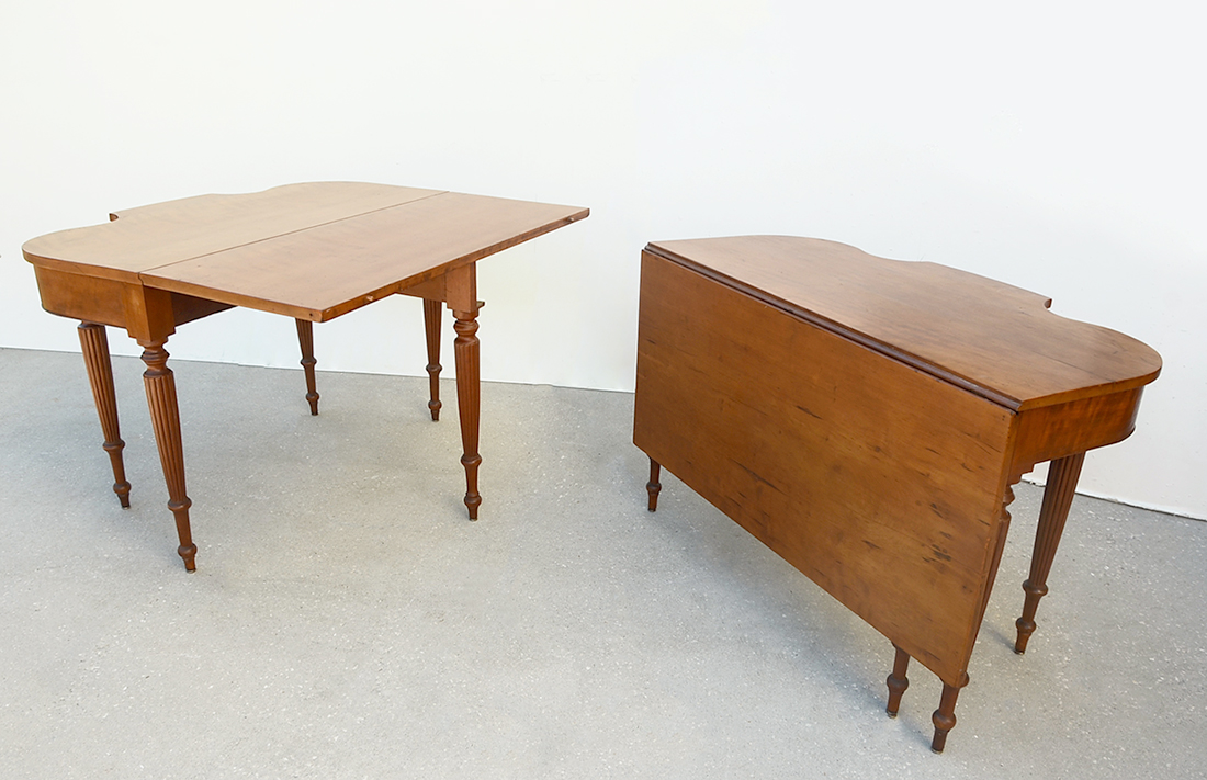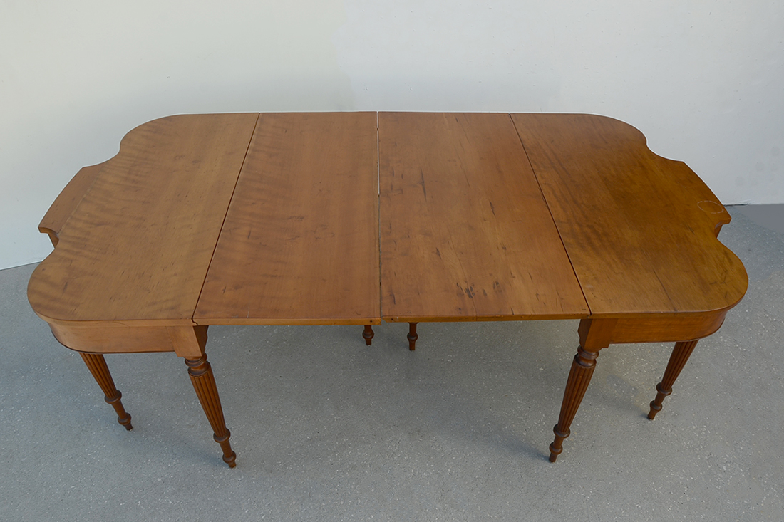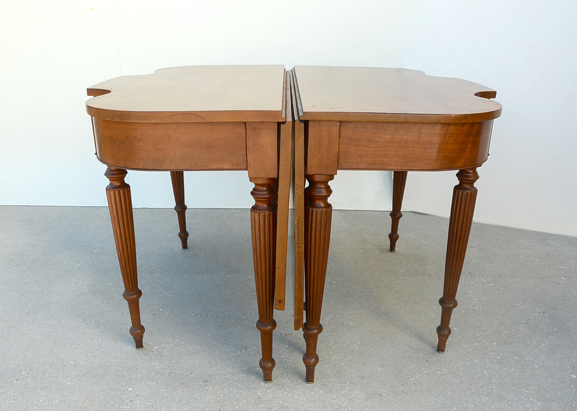 DOUBLE SERPENTINE END DROP LEAF DINING TABLE: In the style of a double ''D'' table with serpentine ends, each having a gate leg drop leaf as well. Fluted tapered legs, Each measures 30 1/2h x 48'' x 24'' with the leaf adding another 19'' when up.